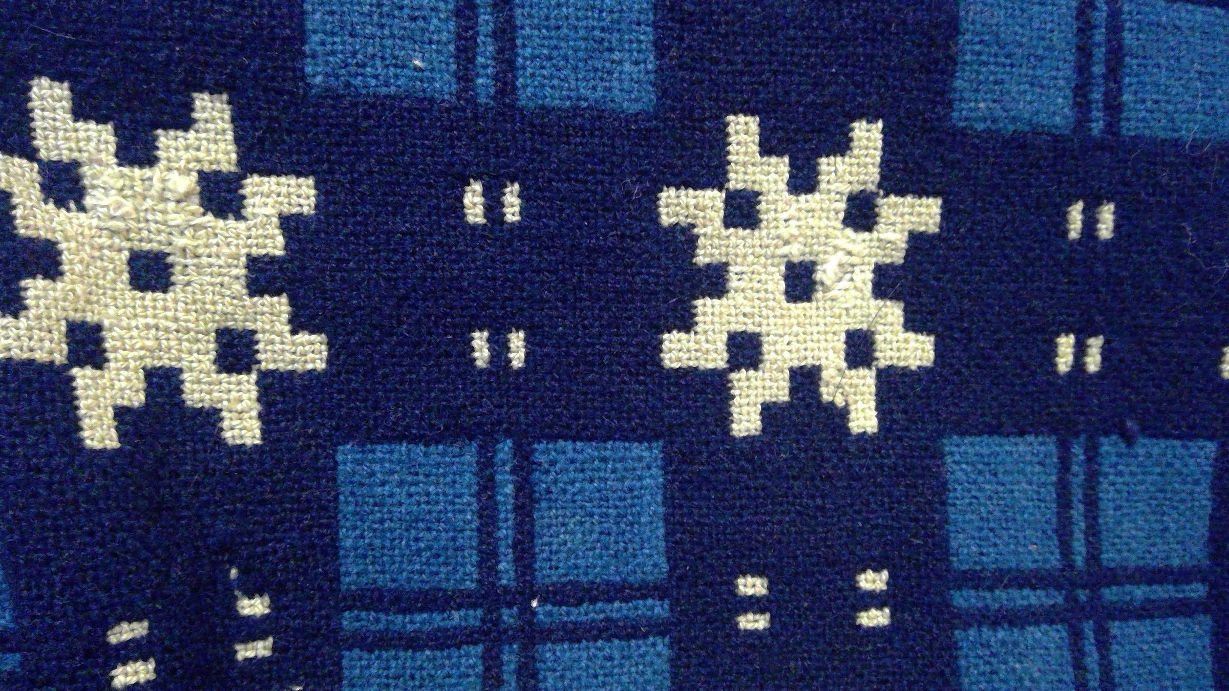 Double weave; blue, navy, natural; two loom widths joined; fringe on 3 sides; no corner blocks; geometric pattern in alternating plaid and snowflake pattern, trees? on border
