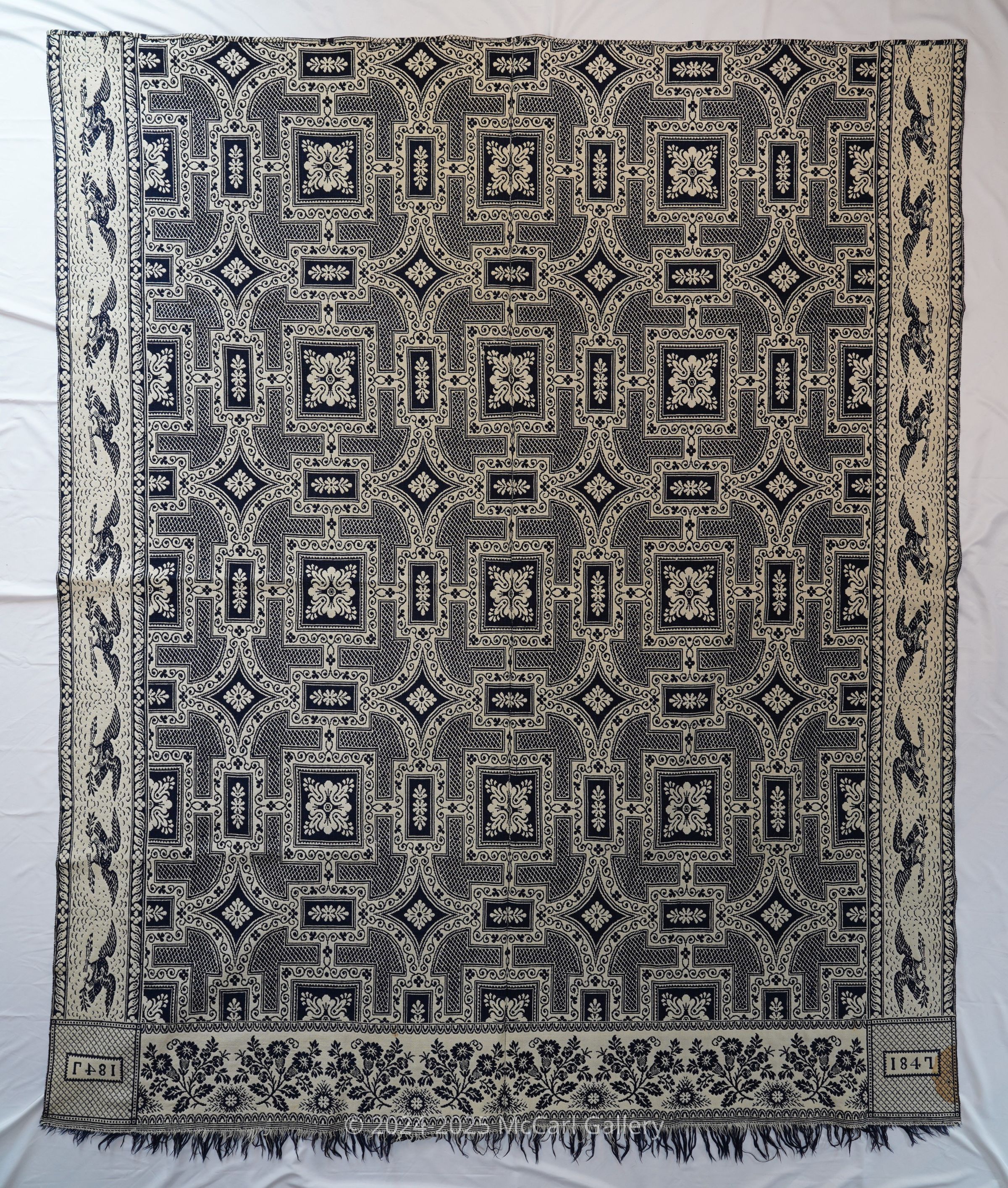 Natural and navy figured double weave coverlet; two panels joined by a center seam. Border on three sides, fringe on bottom.Collection