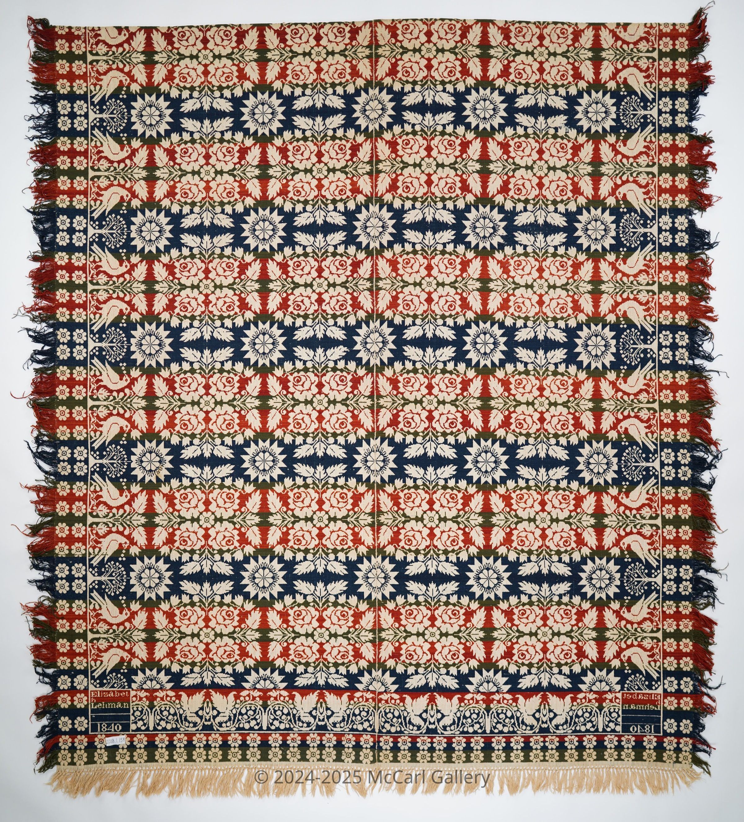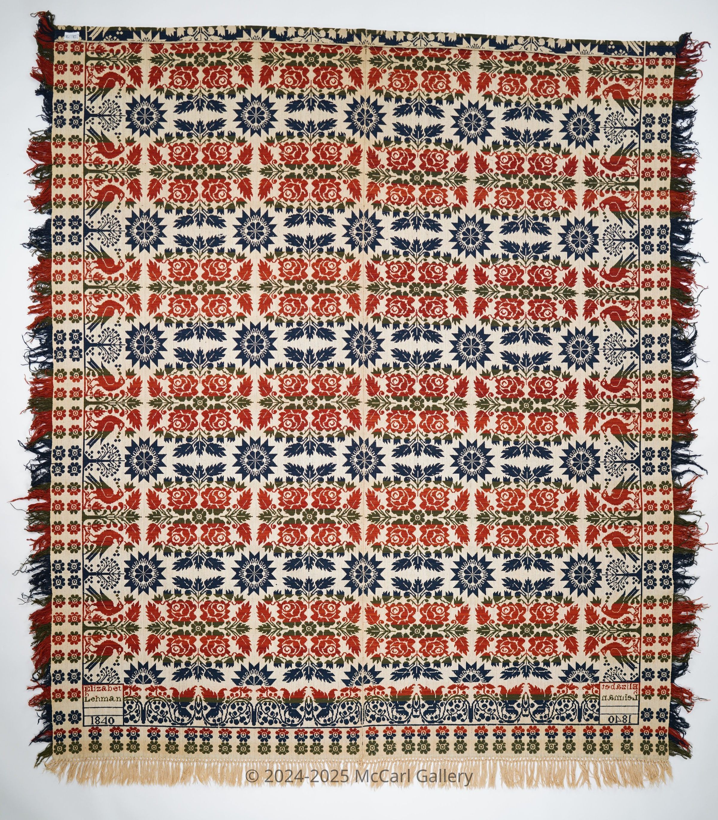 Beiderwand; navy, red, green, natural; self-fringe on 3 sides; 2 loom widths joined; top edge sewn onto itself; double border, outer border of small flowers, inner border of birds and trees; center is floralCollection