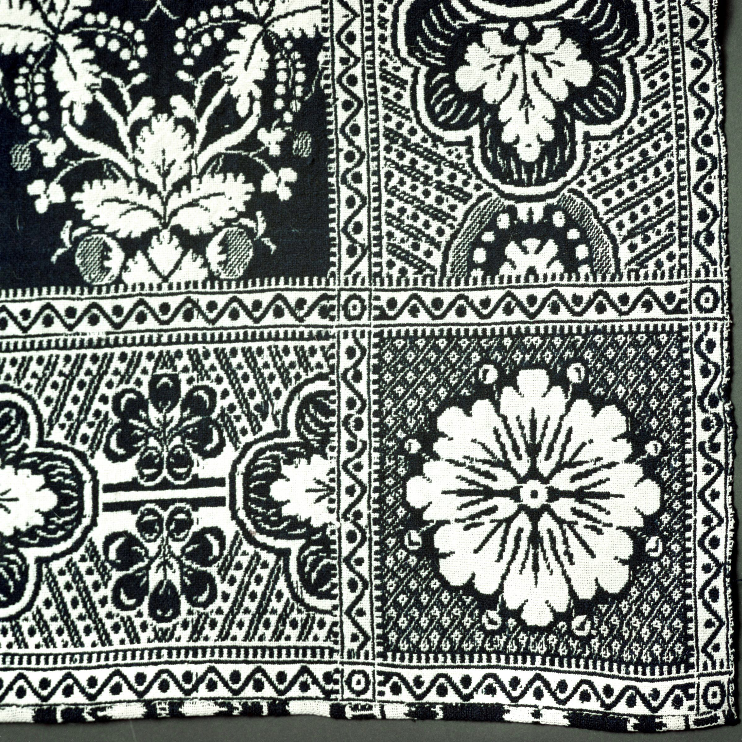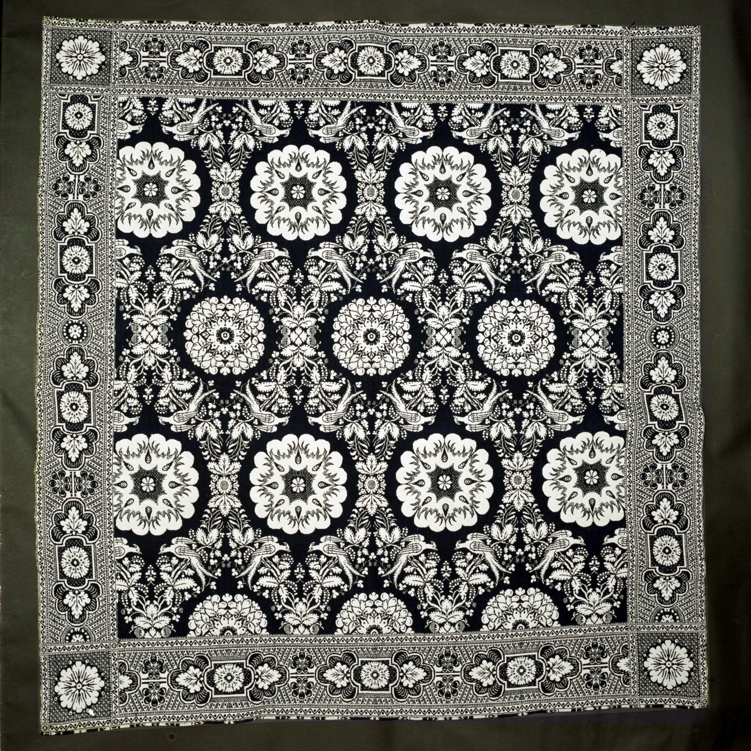 Double weave; navy, natural; no fringe; seamless; no inscription; simgle border of flowers and stripes; 4 square corner blocks with flowers in them; centerfield has flowers and birdsCollection