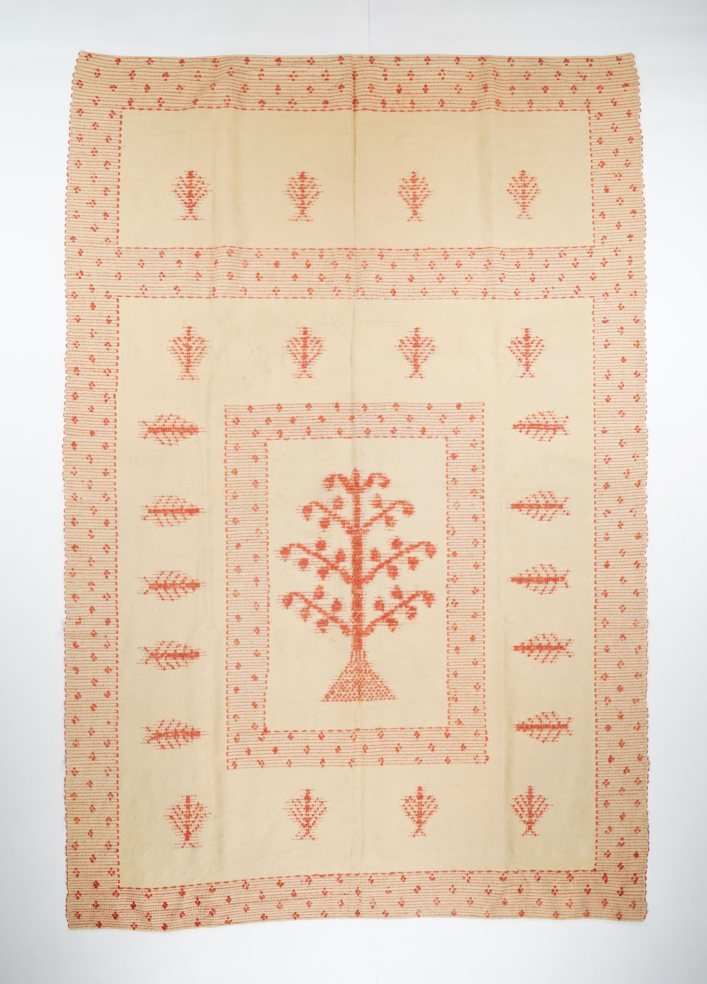 Geometric boutonne coverlet with no fringe. Woven full-width; seamless. Red and undyed wool. Tree centerfield pattern. Unknown weaver. Acadian style, likely made in Canada.Context