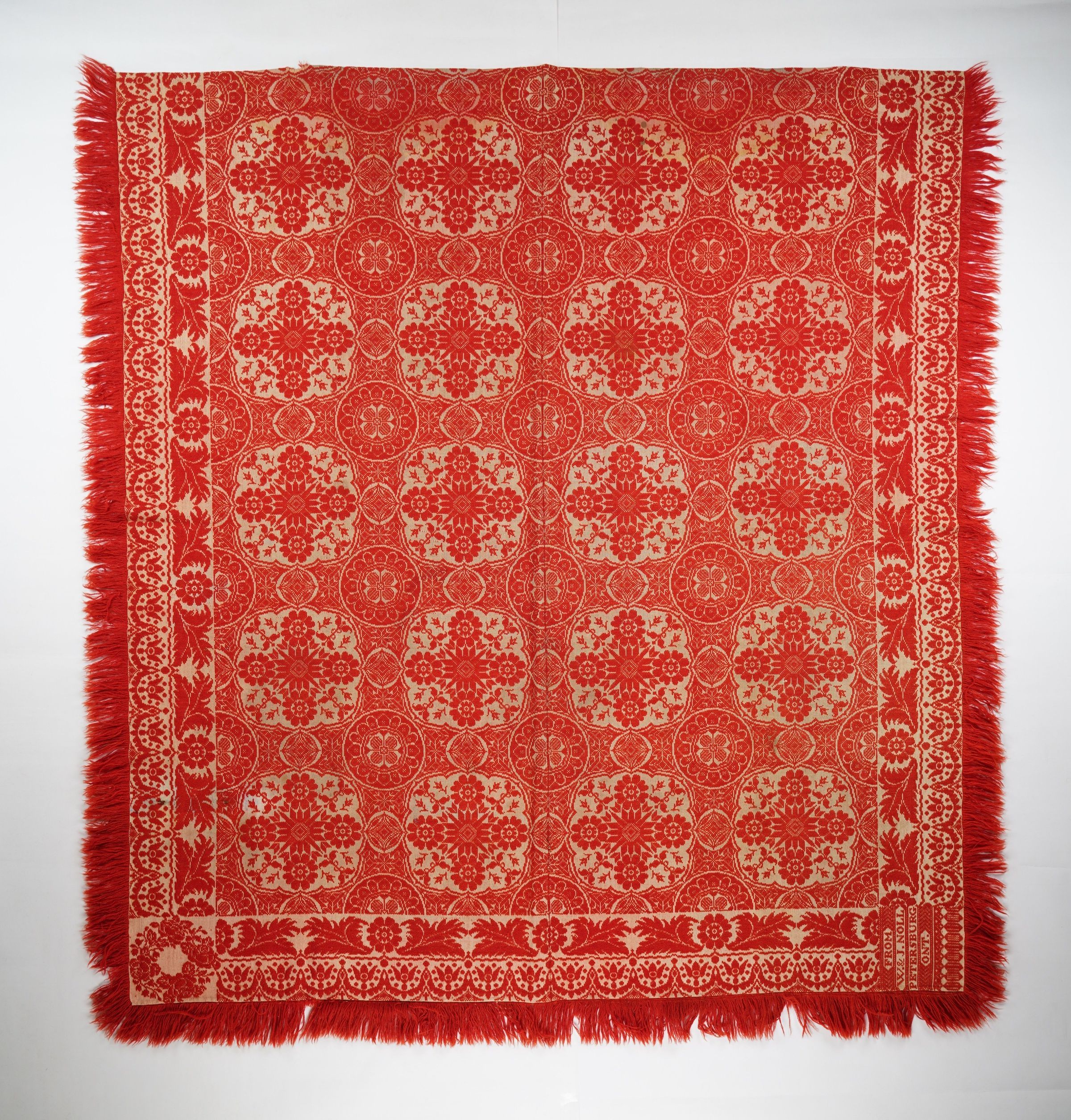Figured and fancy tied beiderwand coverlet with borders on 3 sides and applied fringe on the sides and bottom. Two panels joined by a center seam. Red wool with undyed cotton. Floral centerfield pattern; leafy and floral border on sides and bottom. Woven by William and John Noll.Context