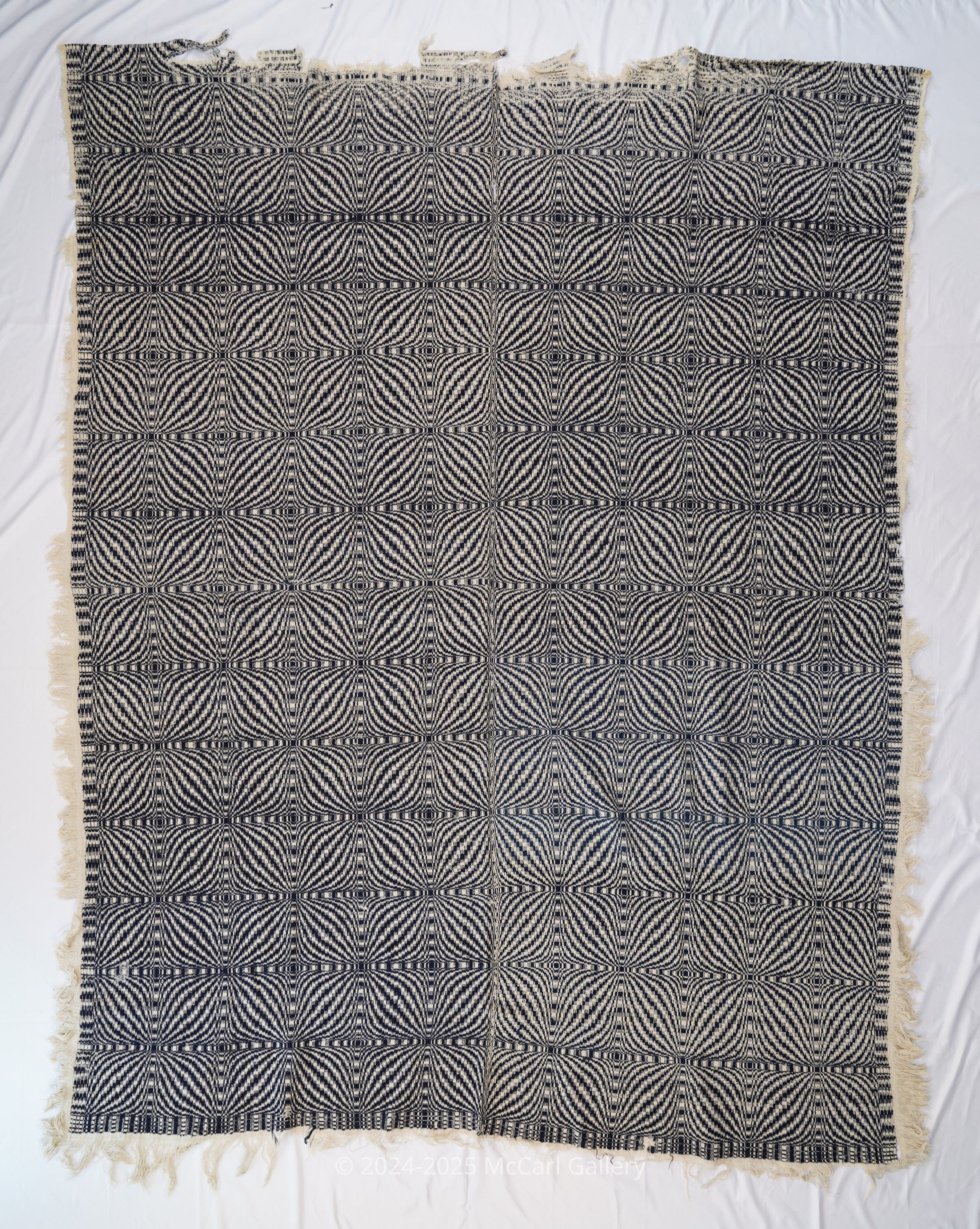 Navy and natural geometric coverlet; double bowknot overshot pattern. Fringe on three sides. Natural cotton tabby and navy wool pattern weft.
