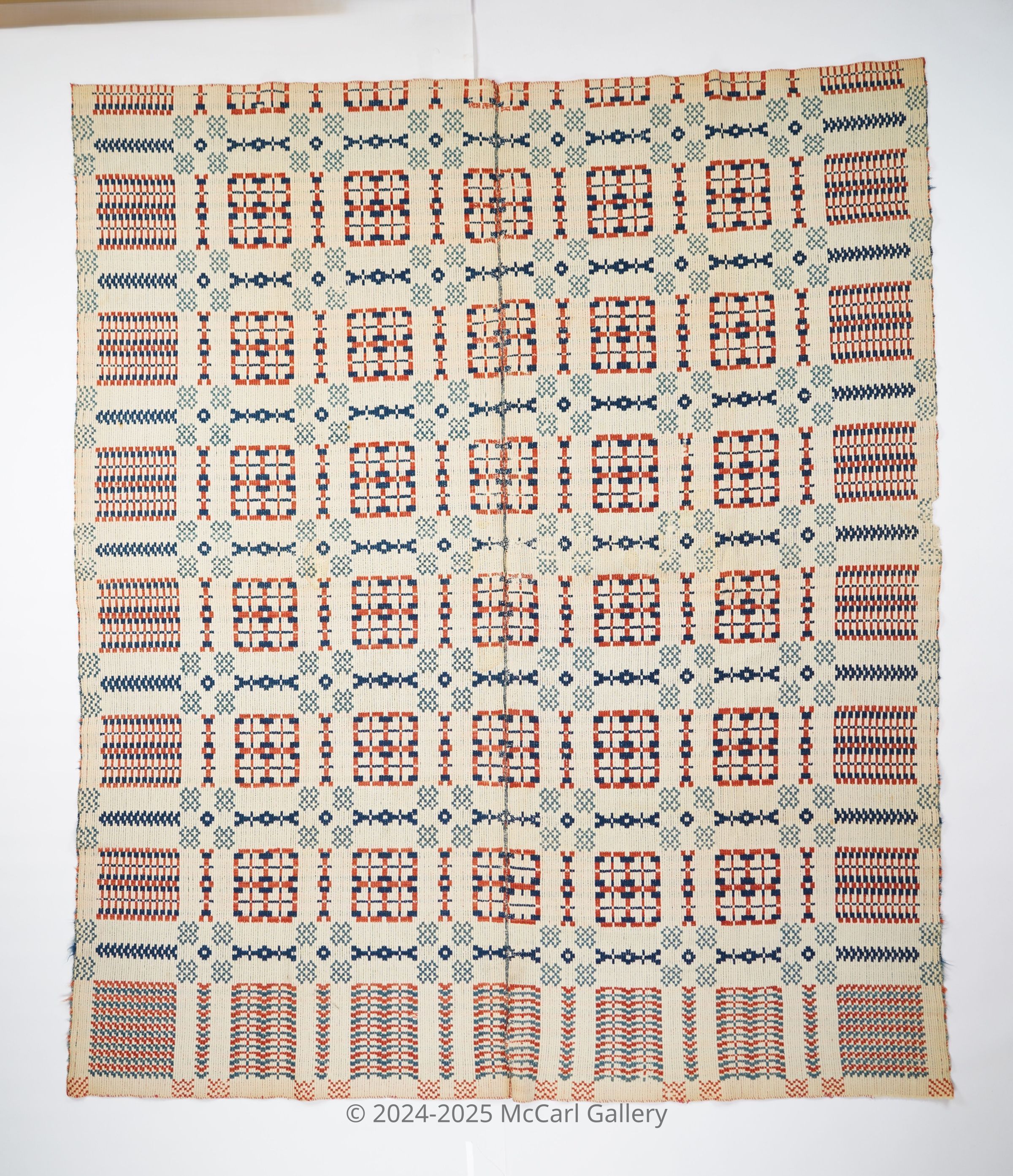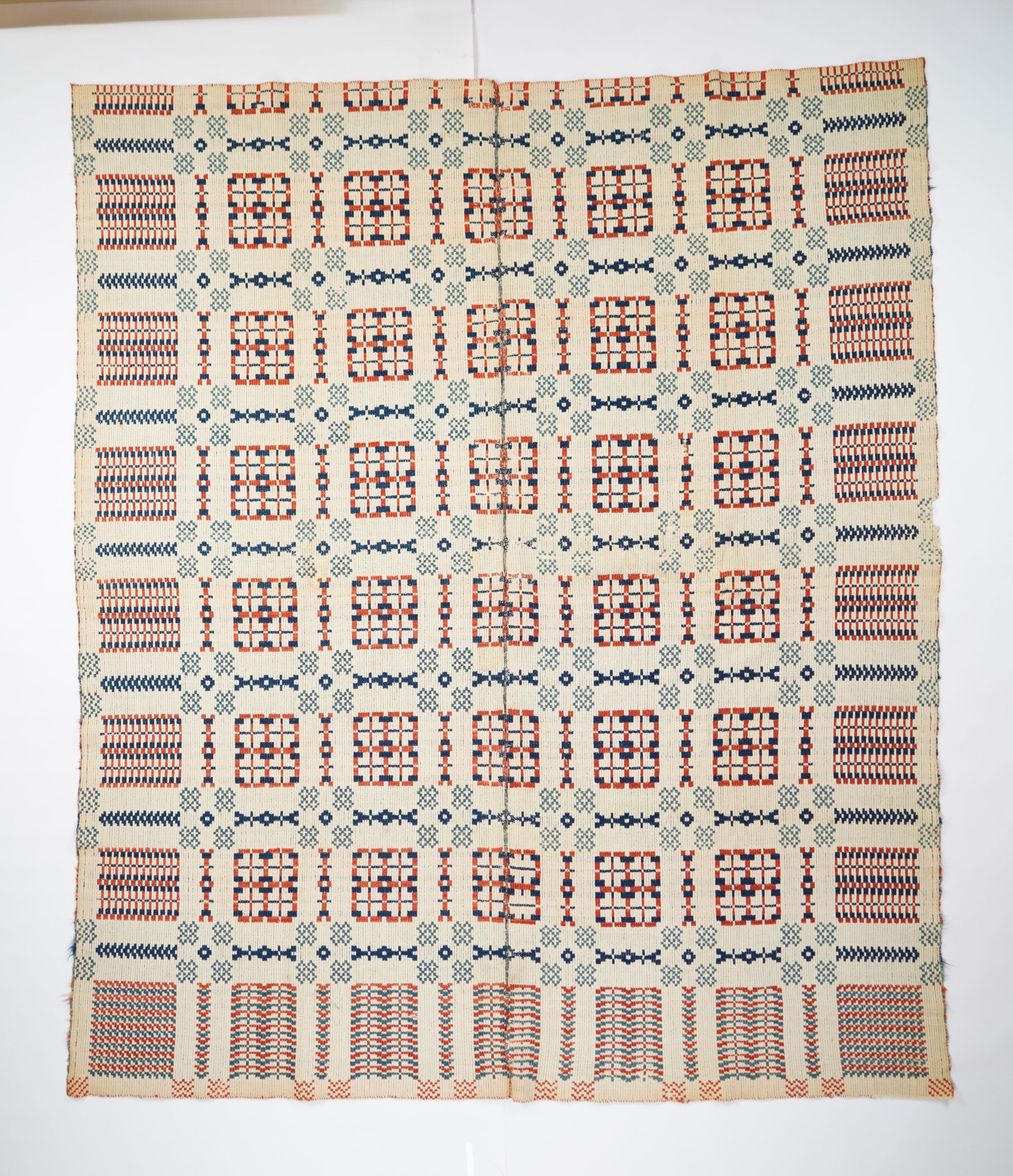Red, blue, navy, and natural geometric tied beiderwand coverlet with border on three sides. Two joined panels.Collection