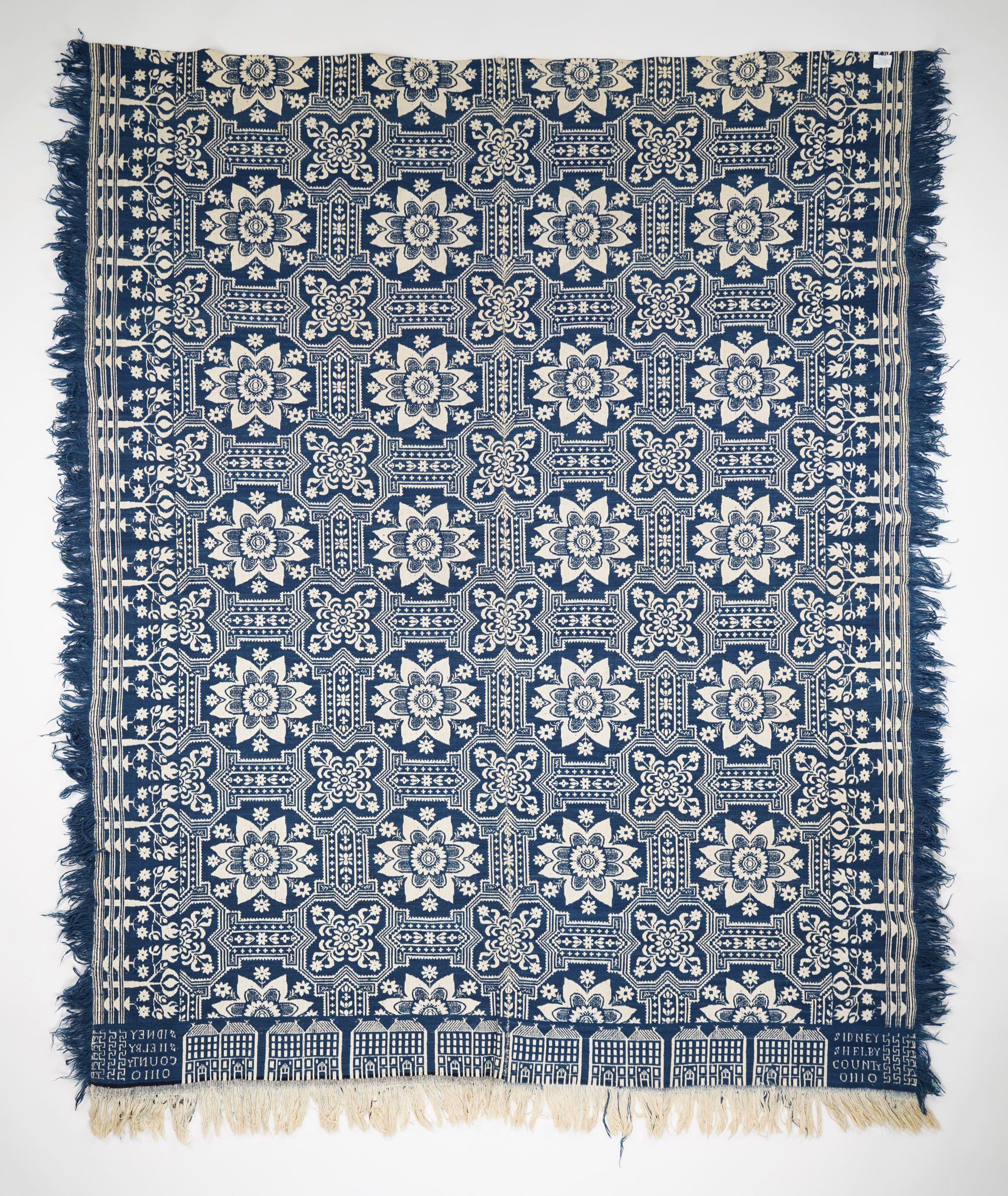 Tied Beiderwand; blue, natural; two loom widths joined by a center seam; 2 corner blocks; self-fringe on 3 sides; bottom border of buildings; side borders of potted plants and trees behind a fence (?); floral centerfield in geometric patternCollection