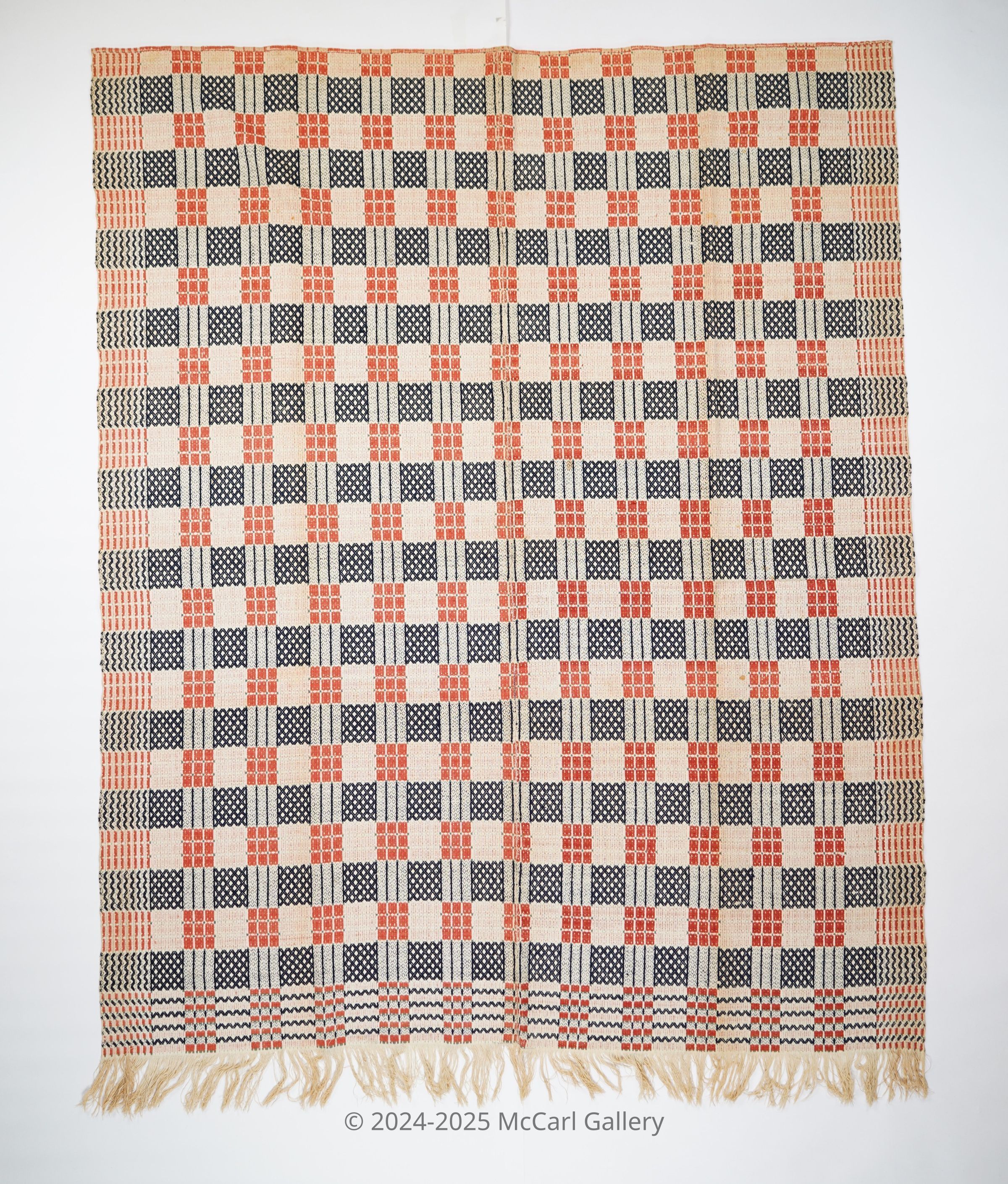 Red, navy, green, and natural geometric coverlet with border on three sides and self-fringe along bottom. Two joined panels.Collection