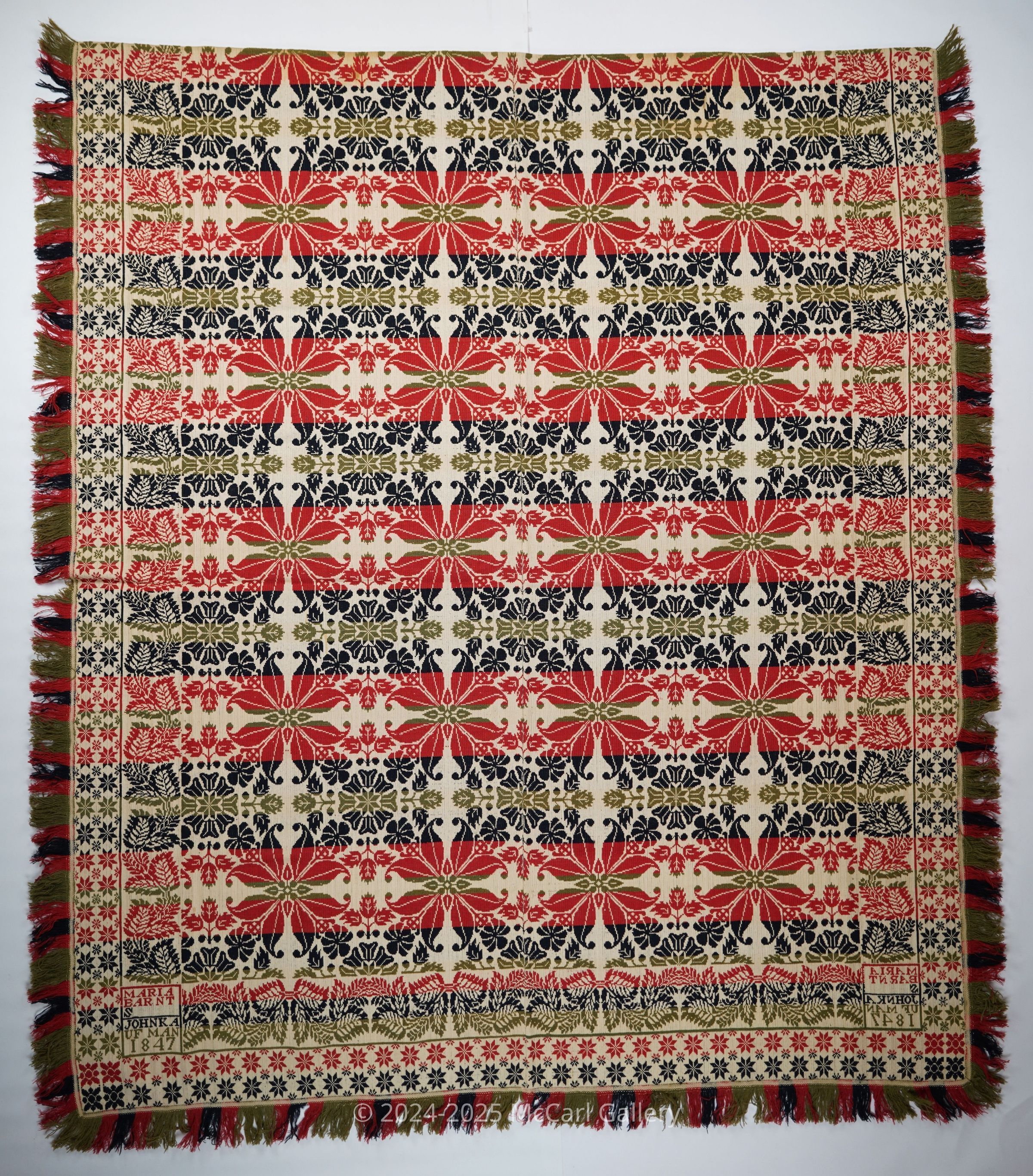 Green, red, navy, and natural figured tied half doublecloth coverlet with border and applied fringe on three sides. Two joined panels. Woven for Maria Barnts by John Kaufman in Pennsylvania in 1847.Collection