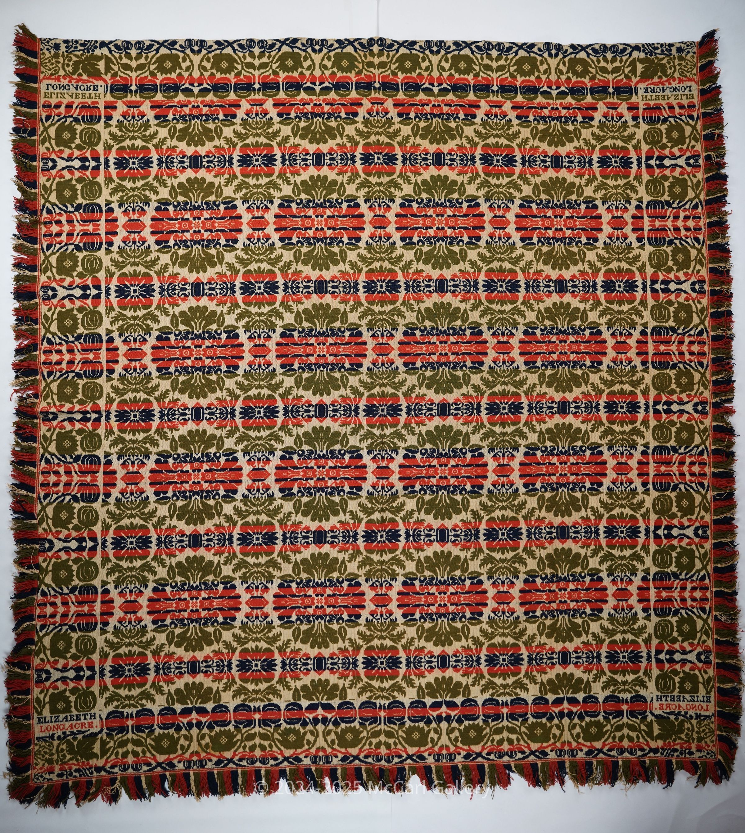 Red, green, navy, and natural coverlet with border on four sides and appleid fringe on three sides. Seamless. Woven for Elizabeth Longacre.Collection