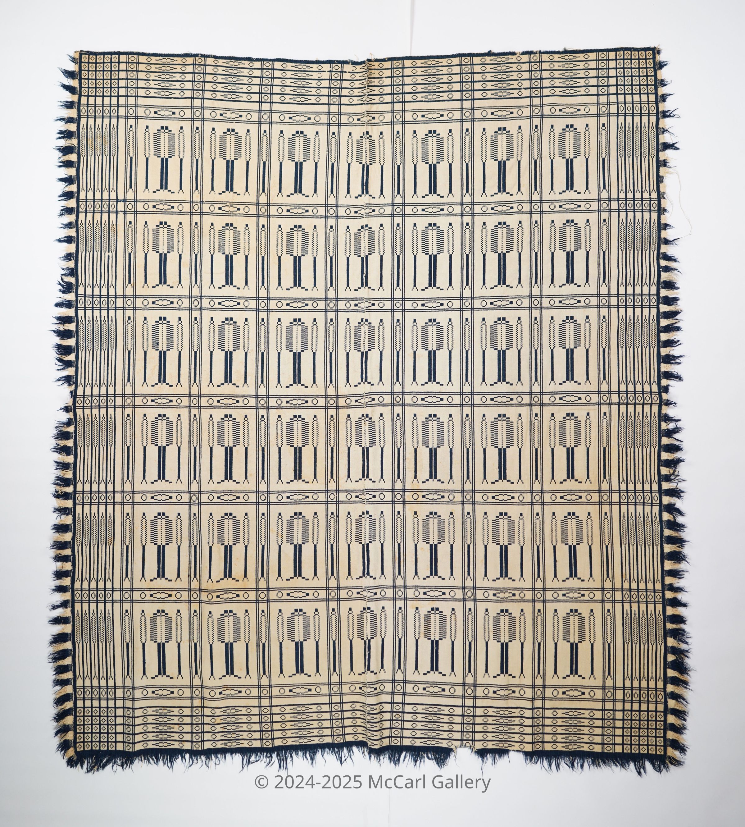 Navy and natural geometric double weave coverlet with border on four sides and applied fringe on three sides.