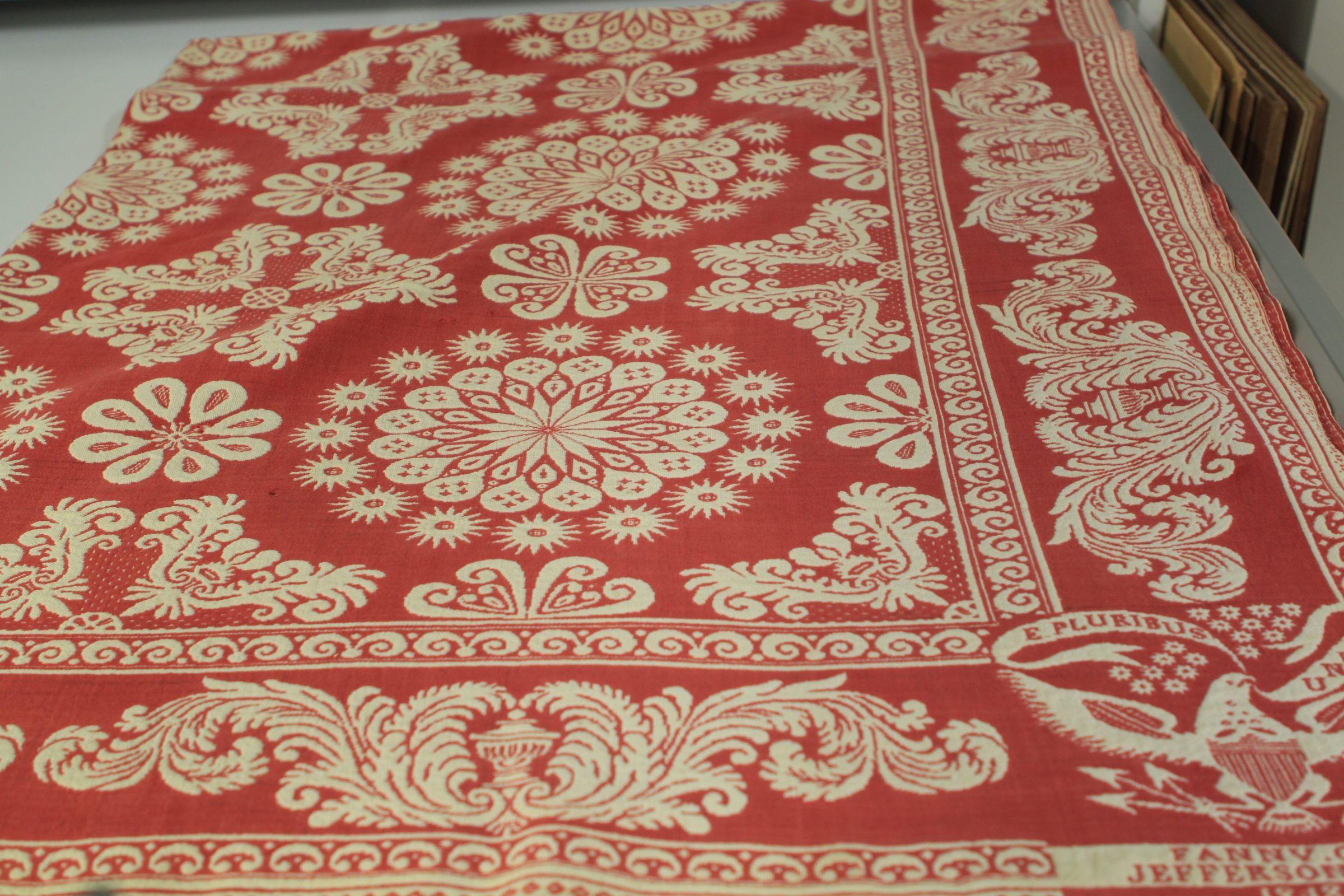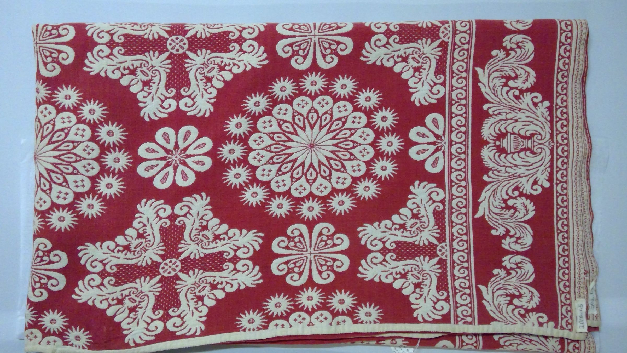Red, natural. Floral centerfield with no fringes. Three borders with eagle in each corner. Variety of red flowers. Sewn down middle.Collection