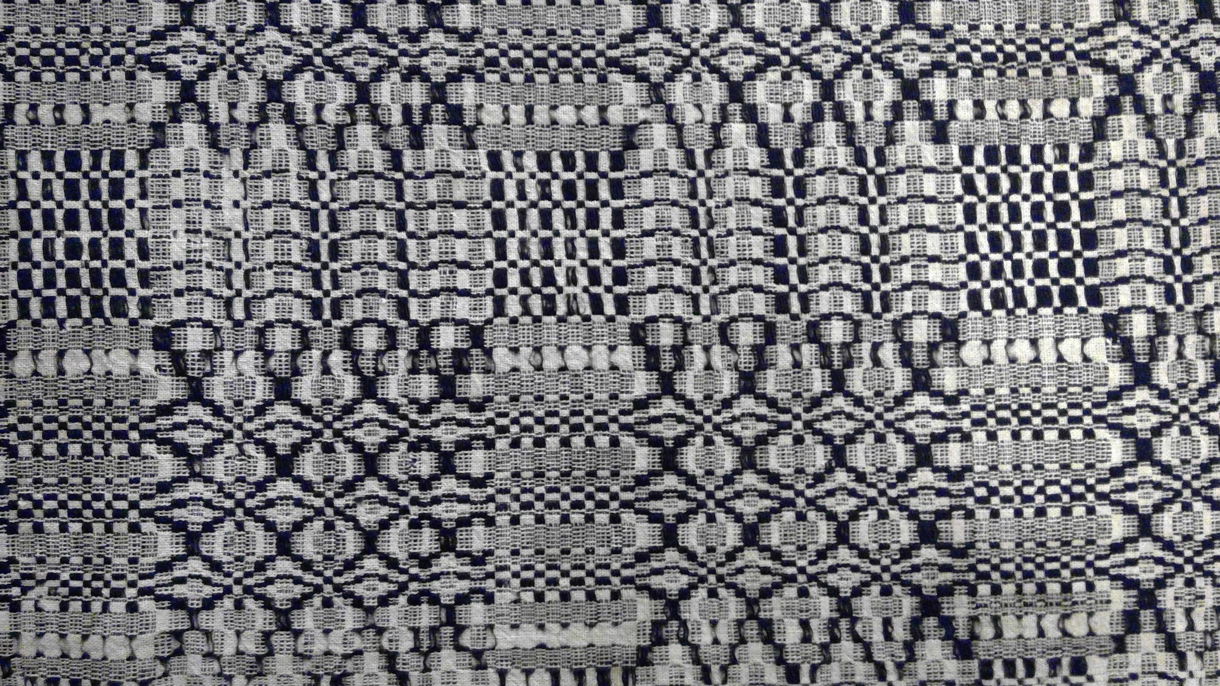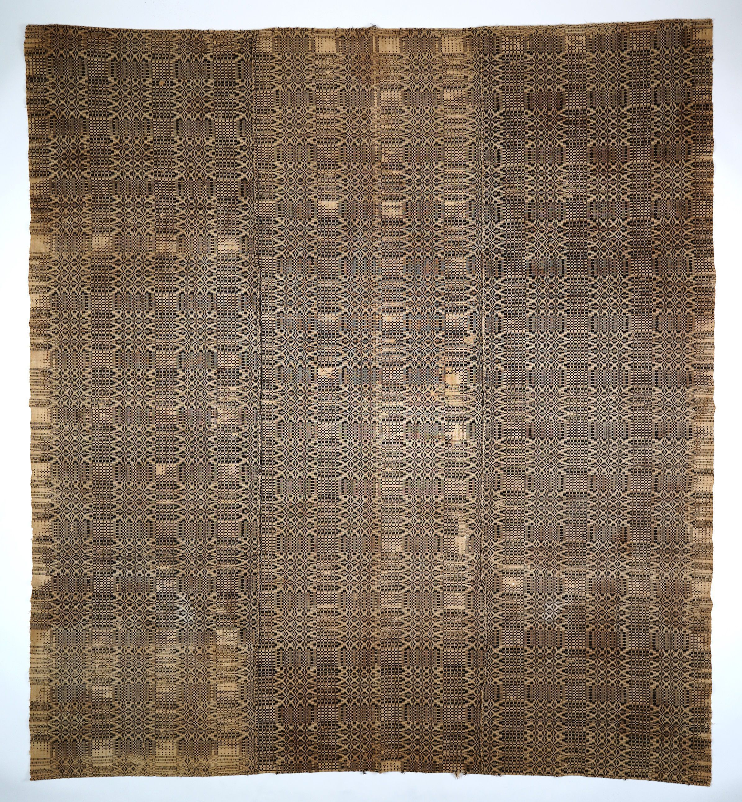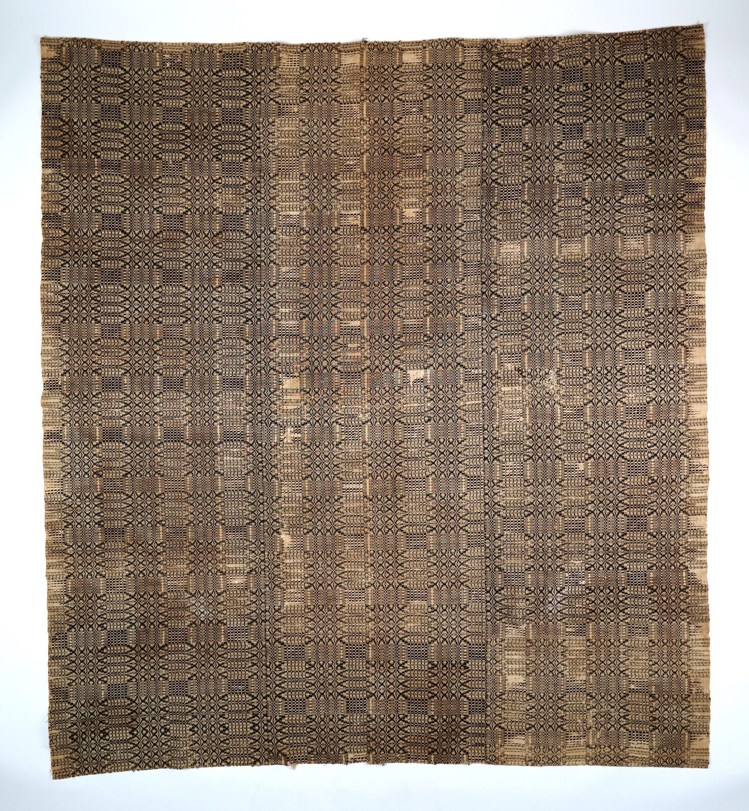 Brown and beige overshot coverlet; three panels joined by seams. "Pine bloom" pattern.Collection