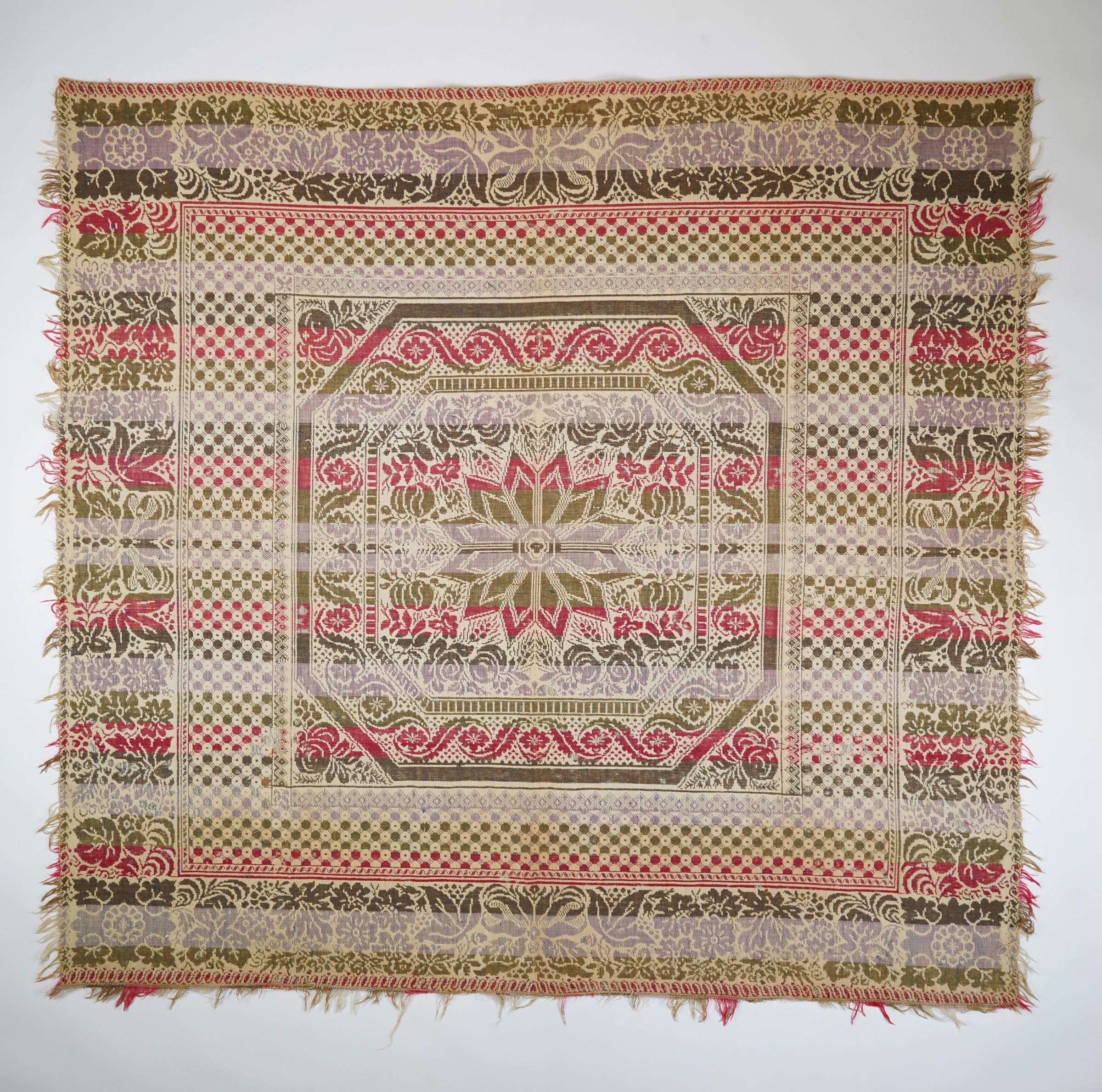 Factory woven red, green, and lavender Beiderwand coverlet, seamless, four floral borders around center medallion.Collection