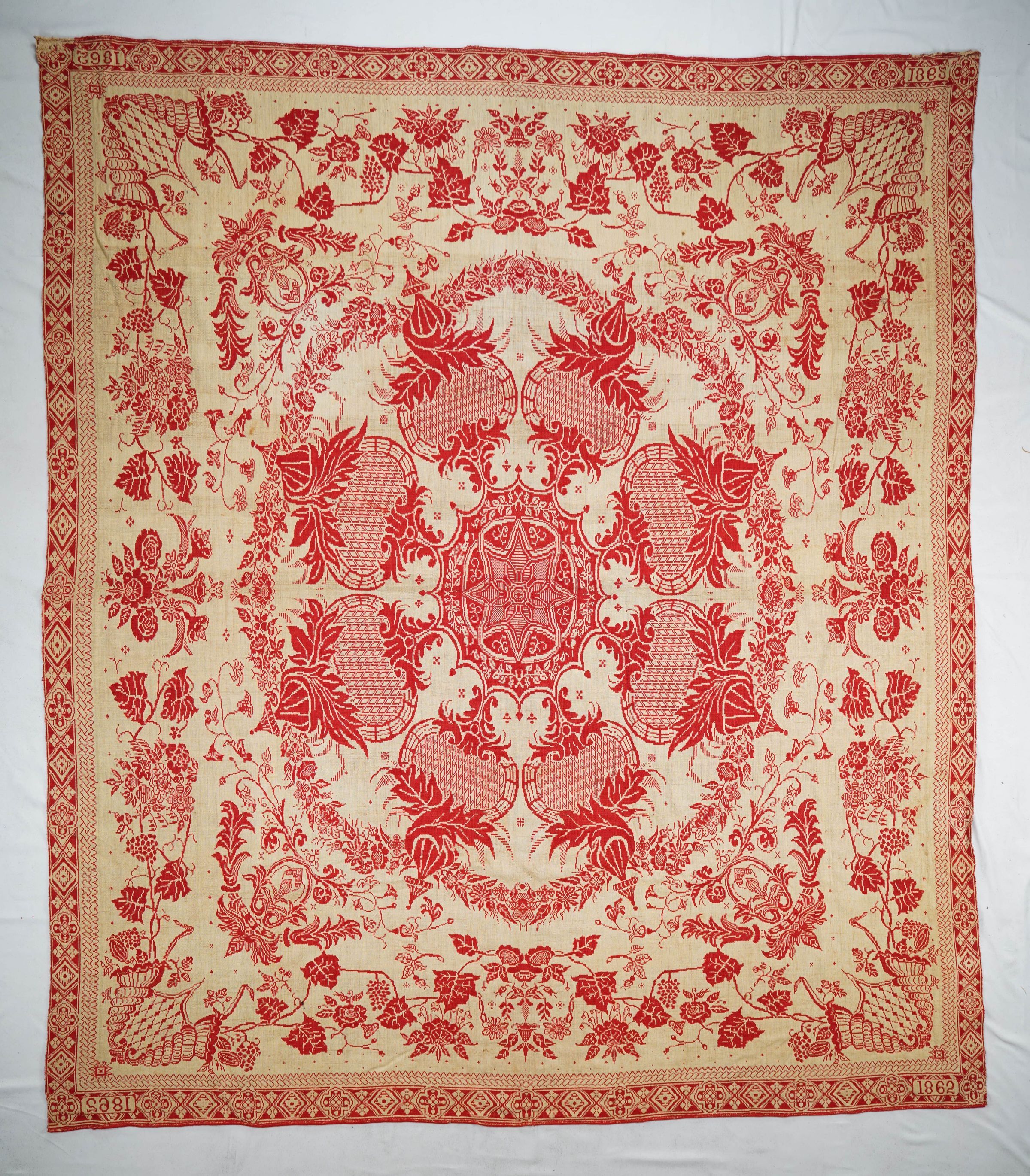 Natural and red figured true beiderwand coverlet; seamless. Border on four sides; no fringe.Collection