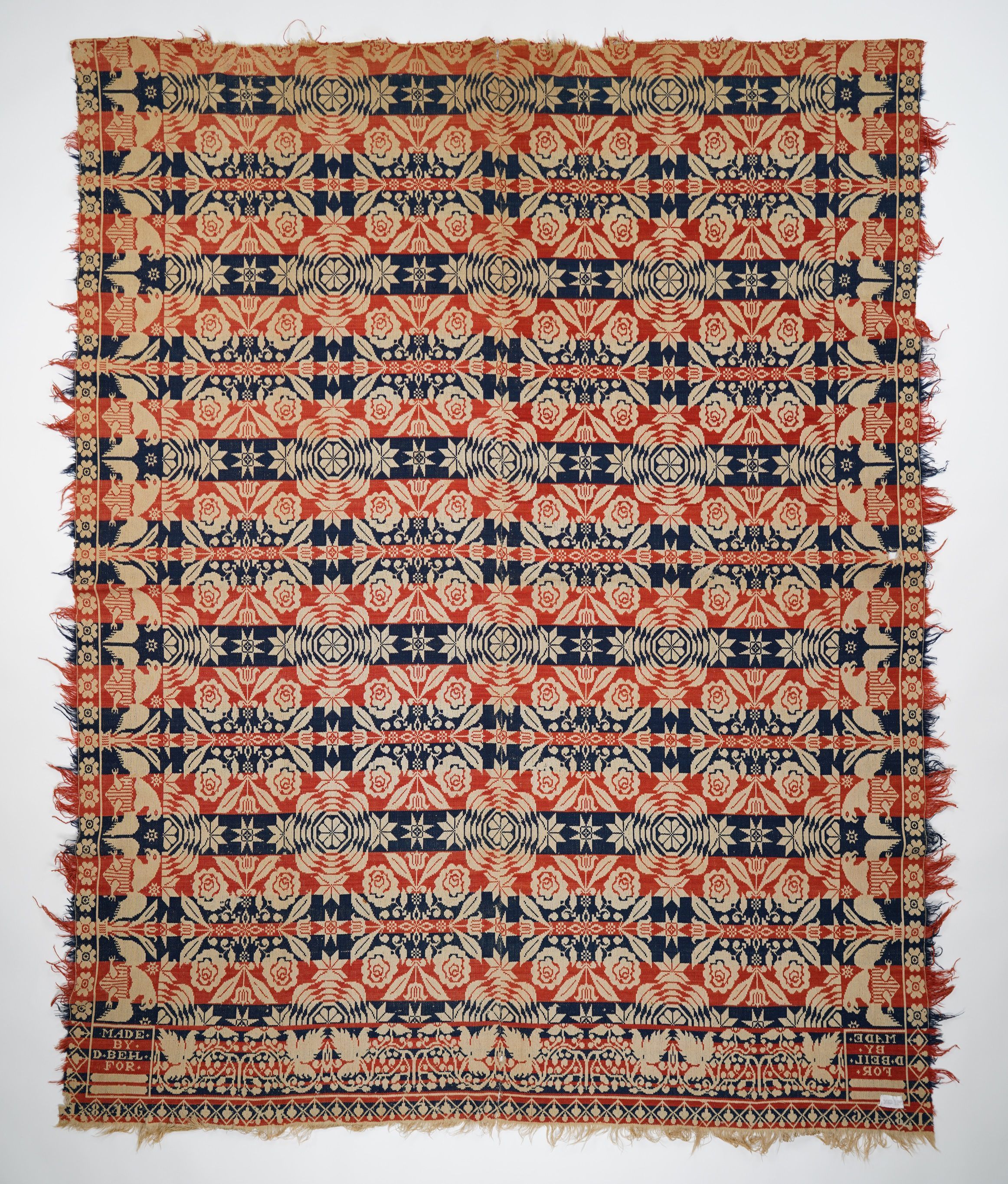 Beiderwand; red, navy, natural; two loom widths joined; fringe on 3 sides; two corner blocks; side borders of eagles; floral bottom border; floral pattern throughoutCollection
