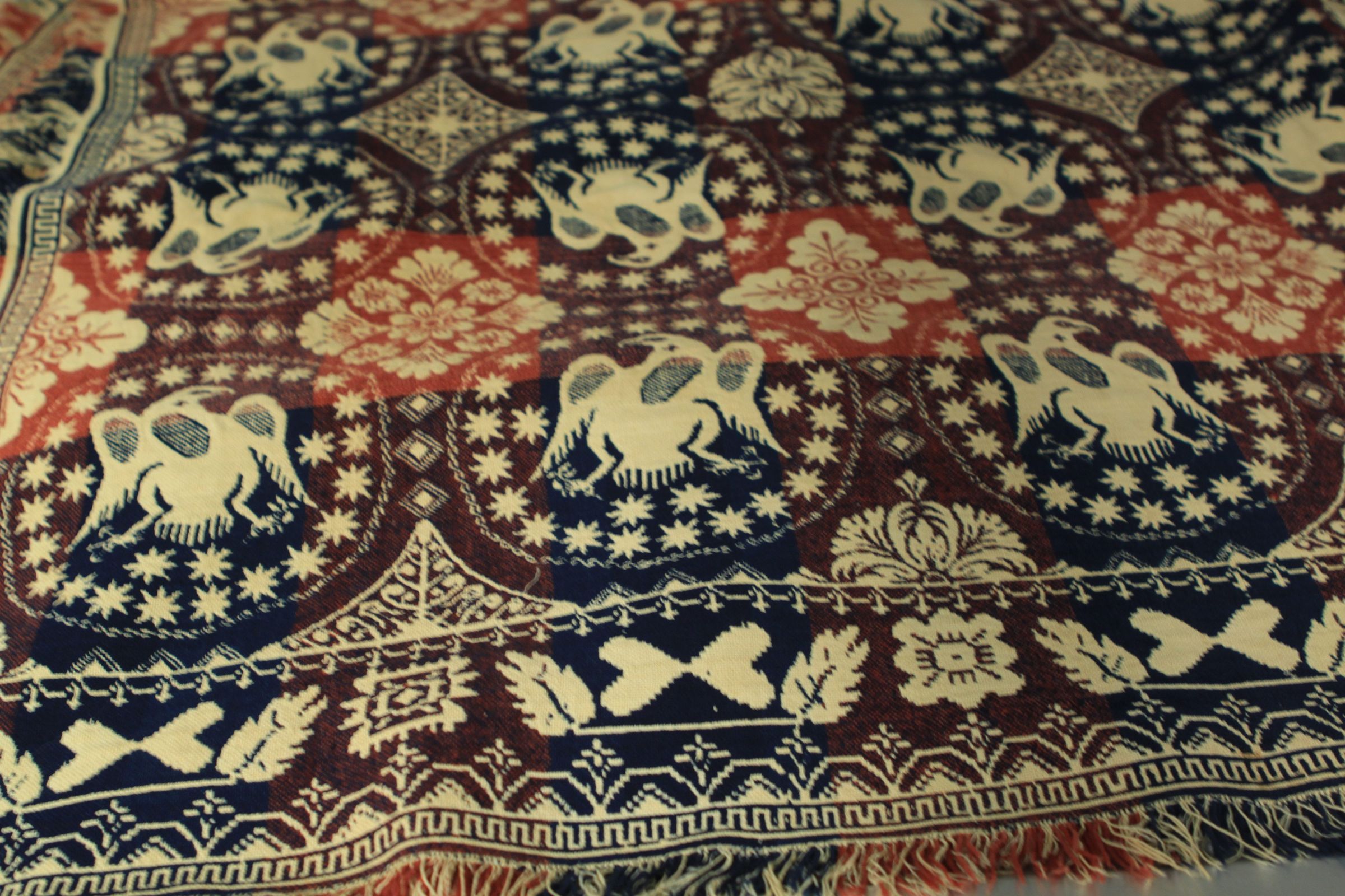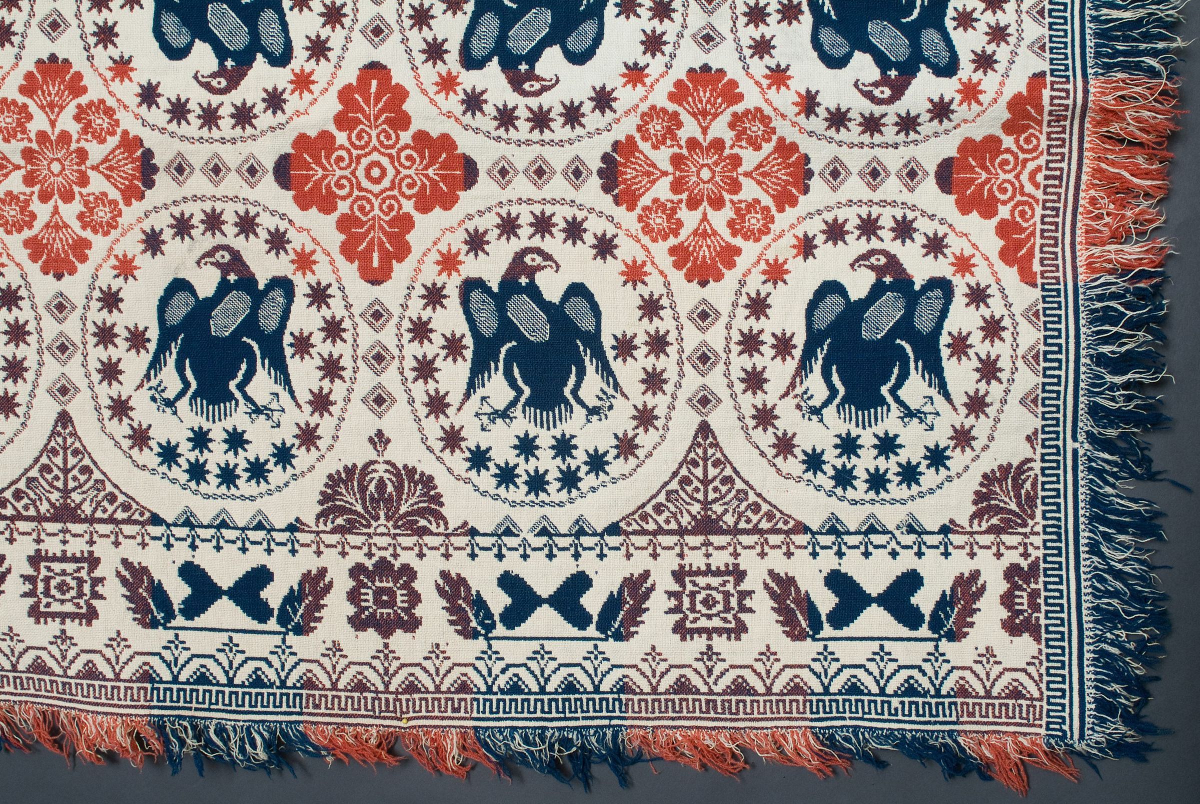 Double weave; two loom widths joined; navy, red-orange, natural (navy and red make a purple shade); fringe on 3 sides; border of leaves and hearts on side borders, no top and bottom borders; centerfield contains rows of "silver dollar" pattern (an eagle and stars in a circle) and floral diamond shapes, strips of colorCollection