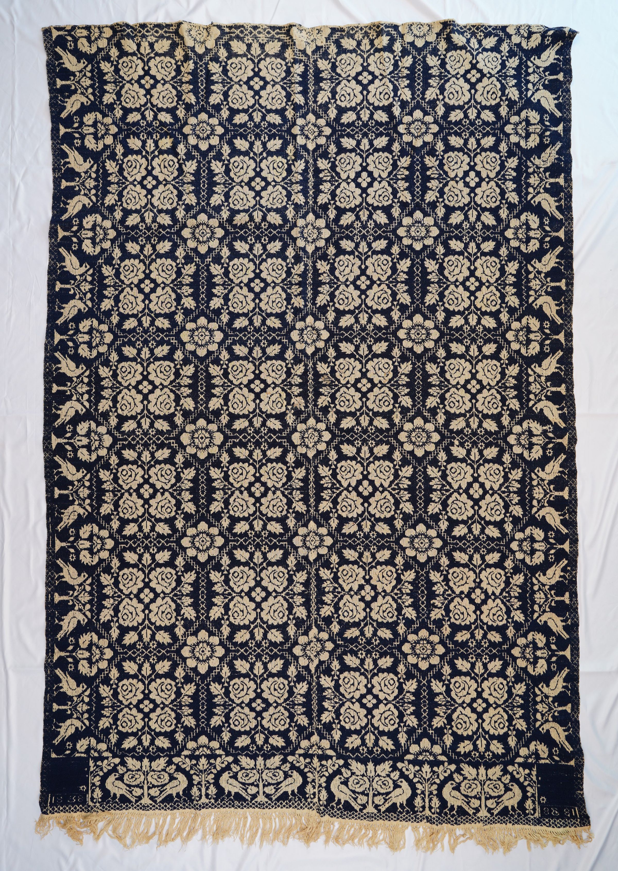 Navy and natural figured tied Beiderwand coverlet; two panels joined. Double roses and blossom grid centierfield pattern, distelfink border on three sides. Self-fringe on bottom.Collection
