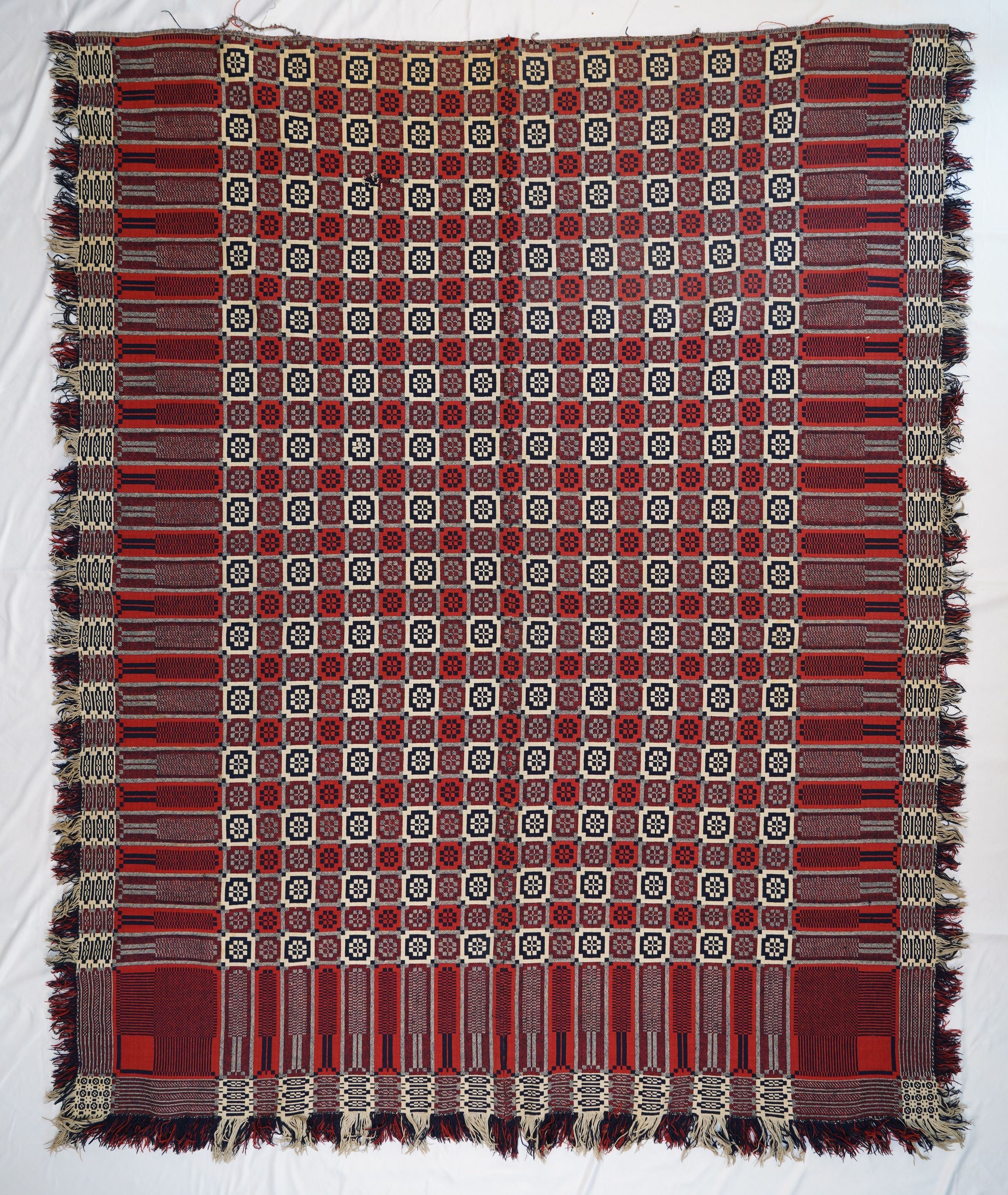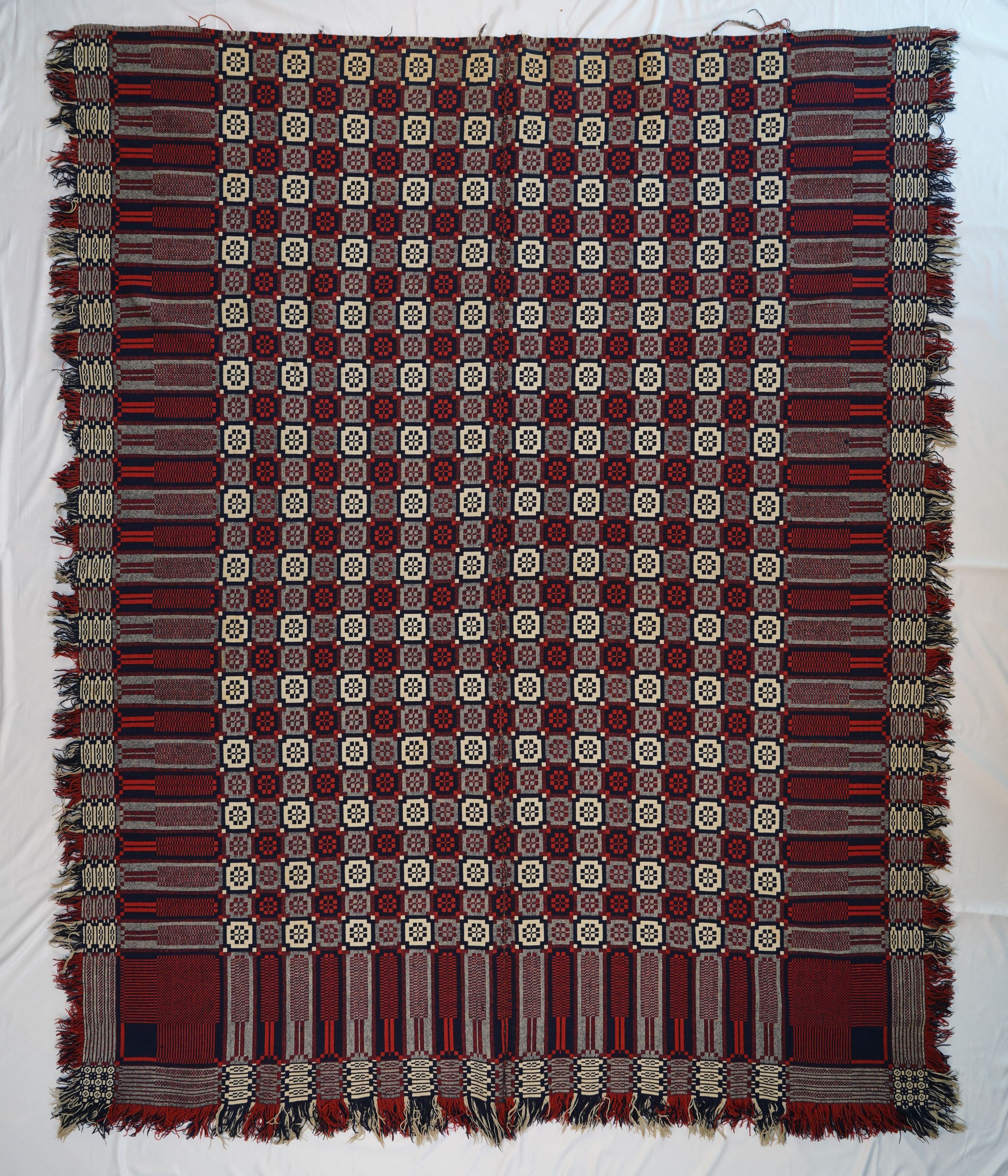 Natural, navy, red, and grey geometric double weave coverlet; two panels joined by a center seam. Border and fringe on three sides.