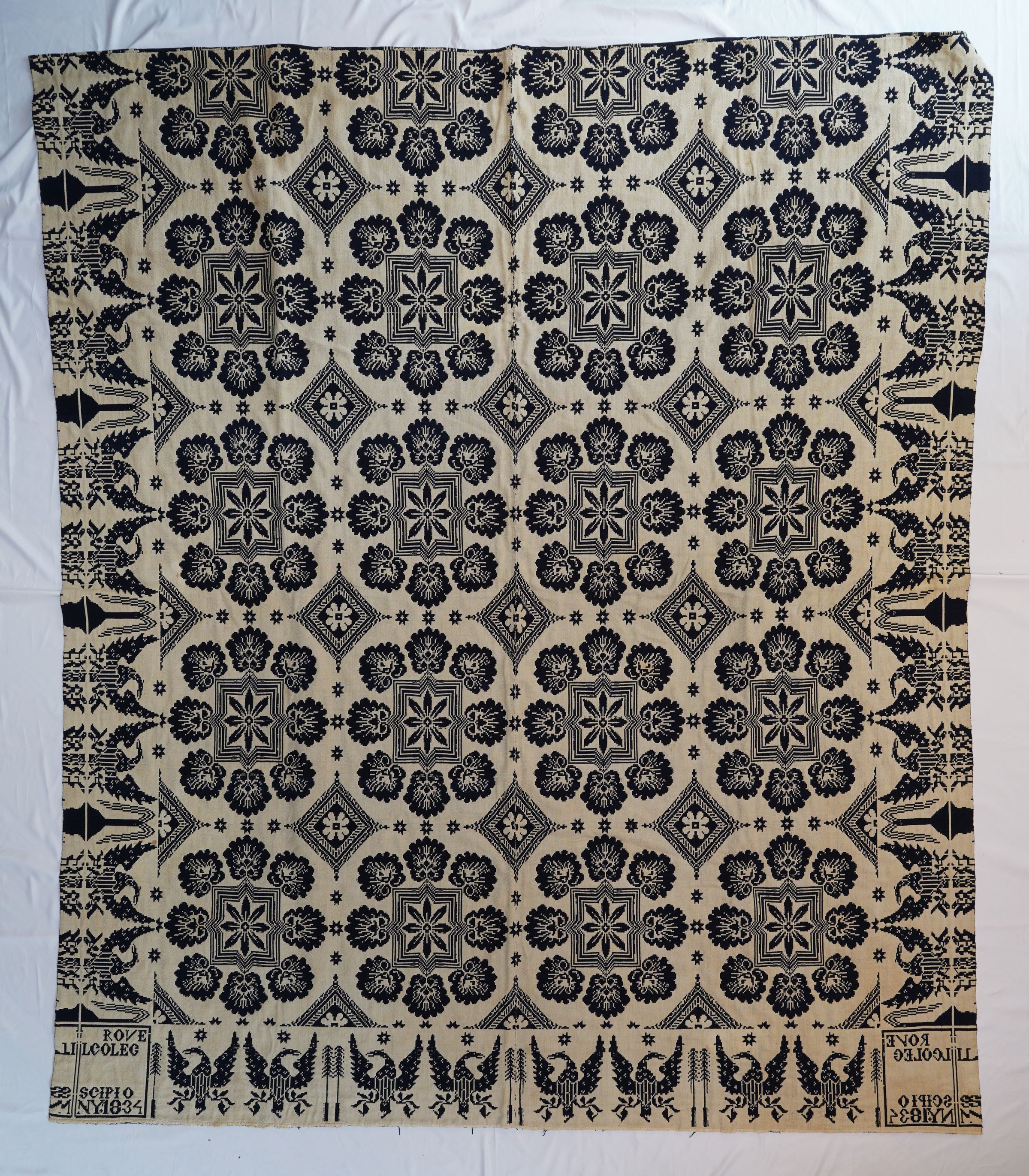 Natural and navy figured double weave coverlet; two panels joined by a center seam. Border on three sides, no fringe.Collection