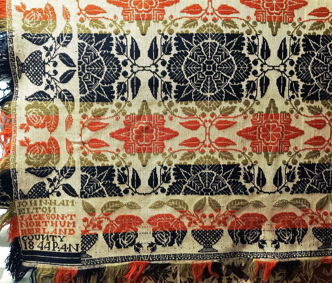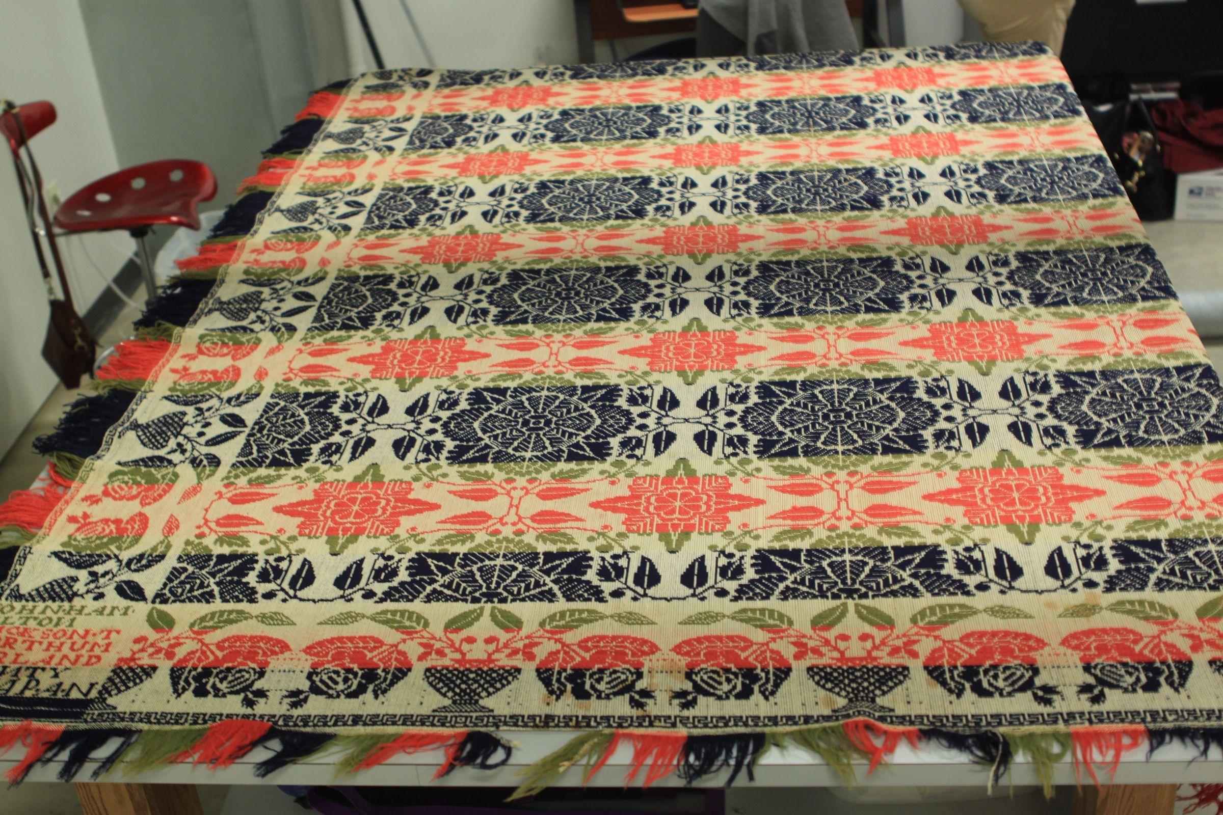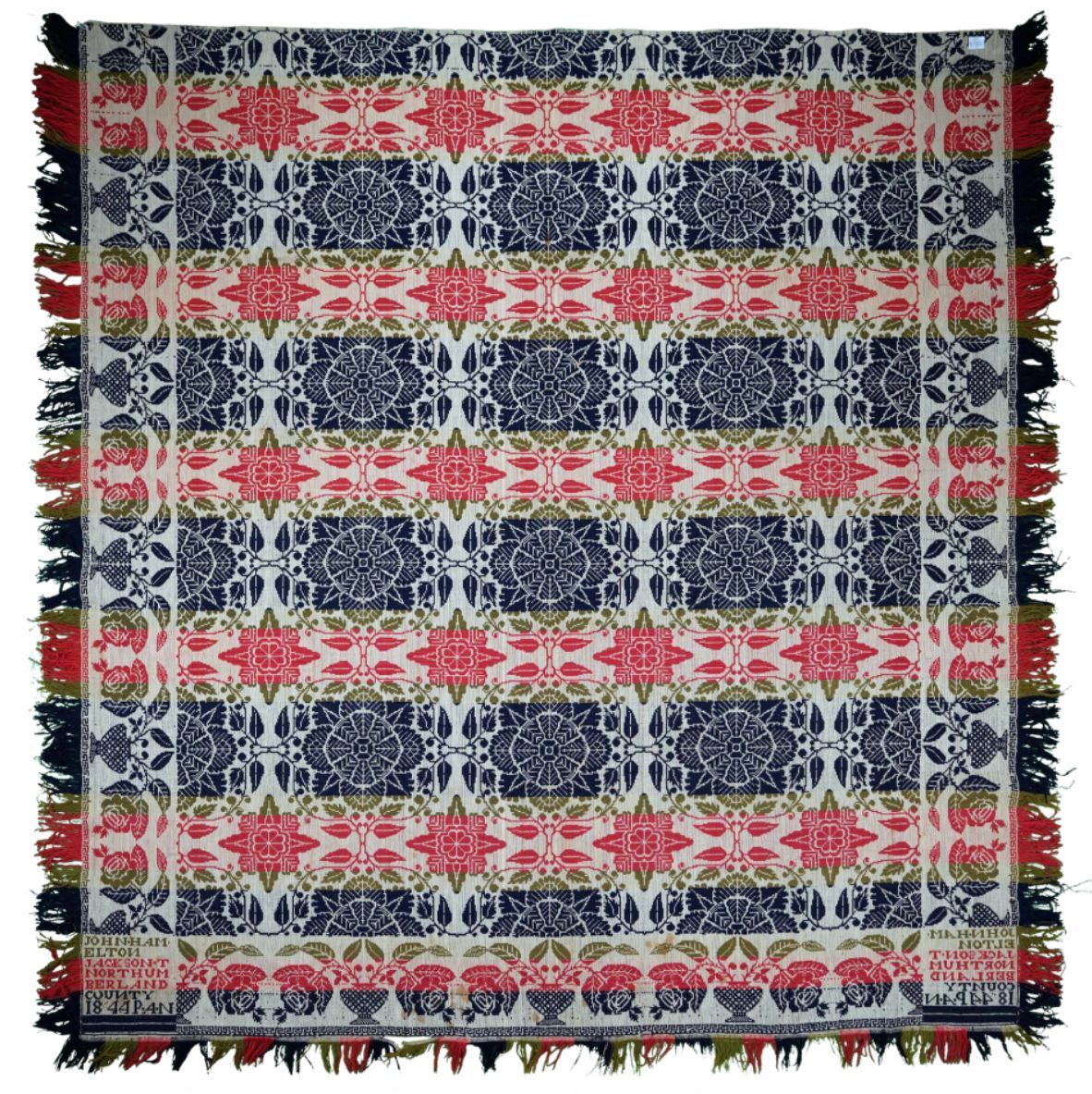 Beiderwand; red, navy, green, natural; seamless; fringe on 3 sides; 2 corner blocks; floral border and centerfieldCollection