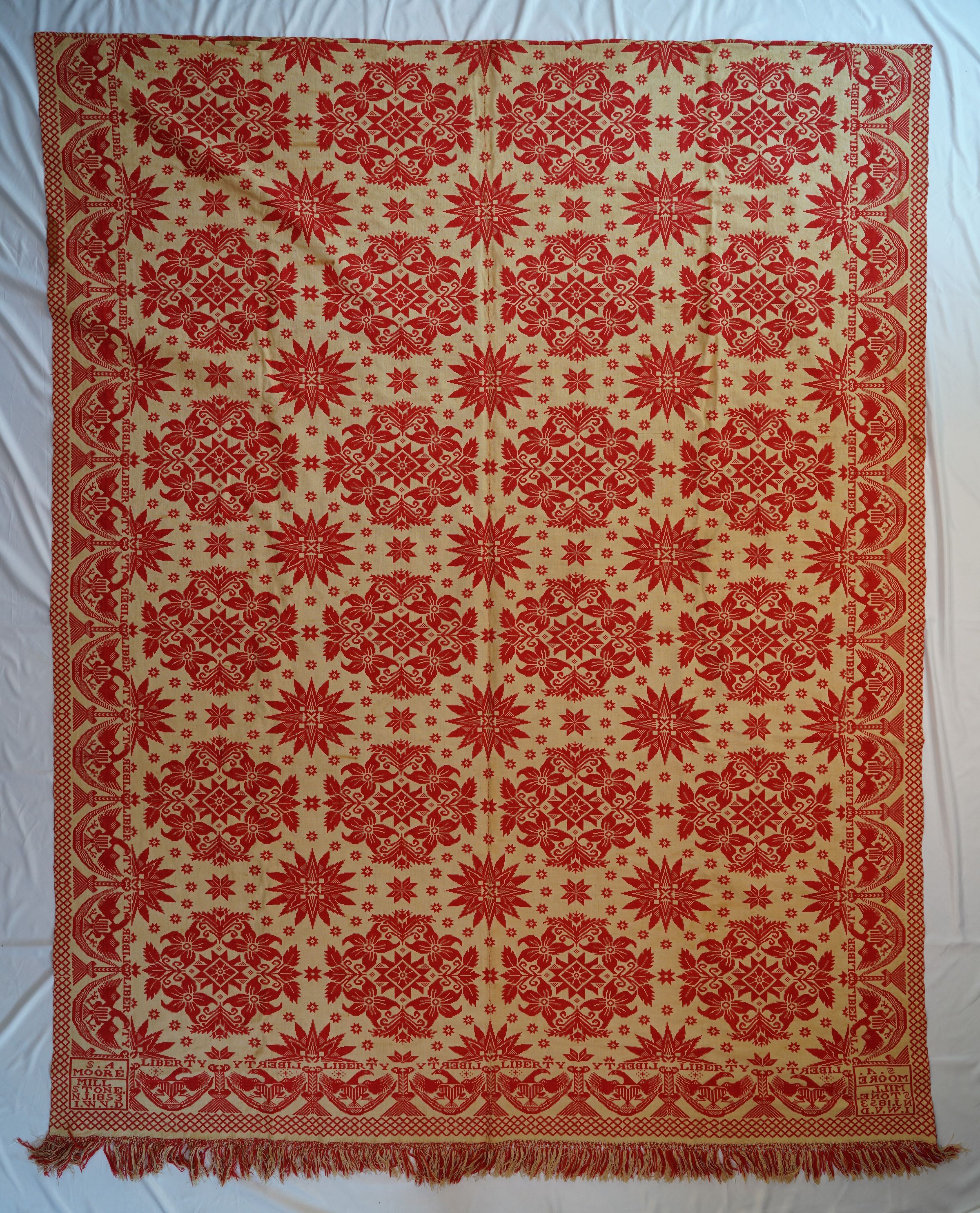Natural and red figured double weave coverlet; two panels joined by a center seam. Border on three sides, fringe on bottom.Collection