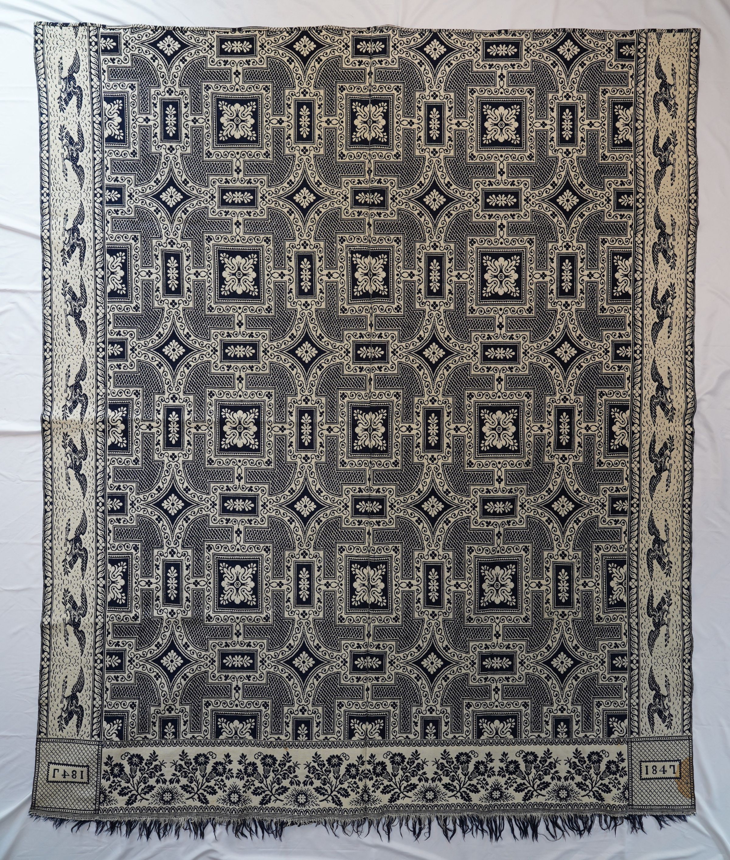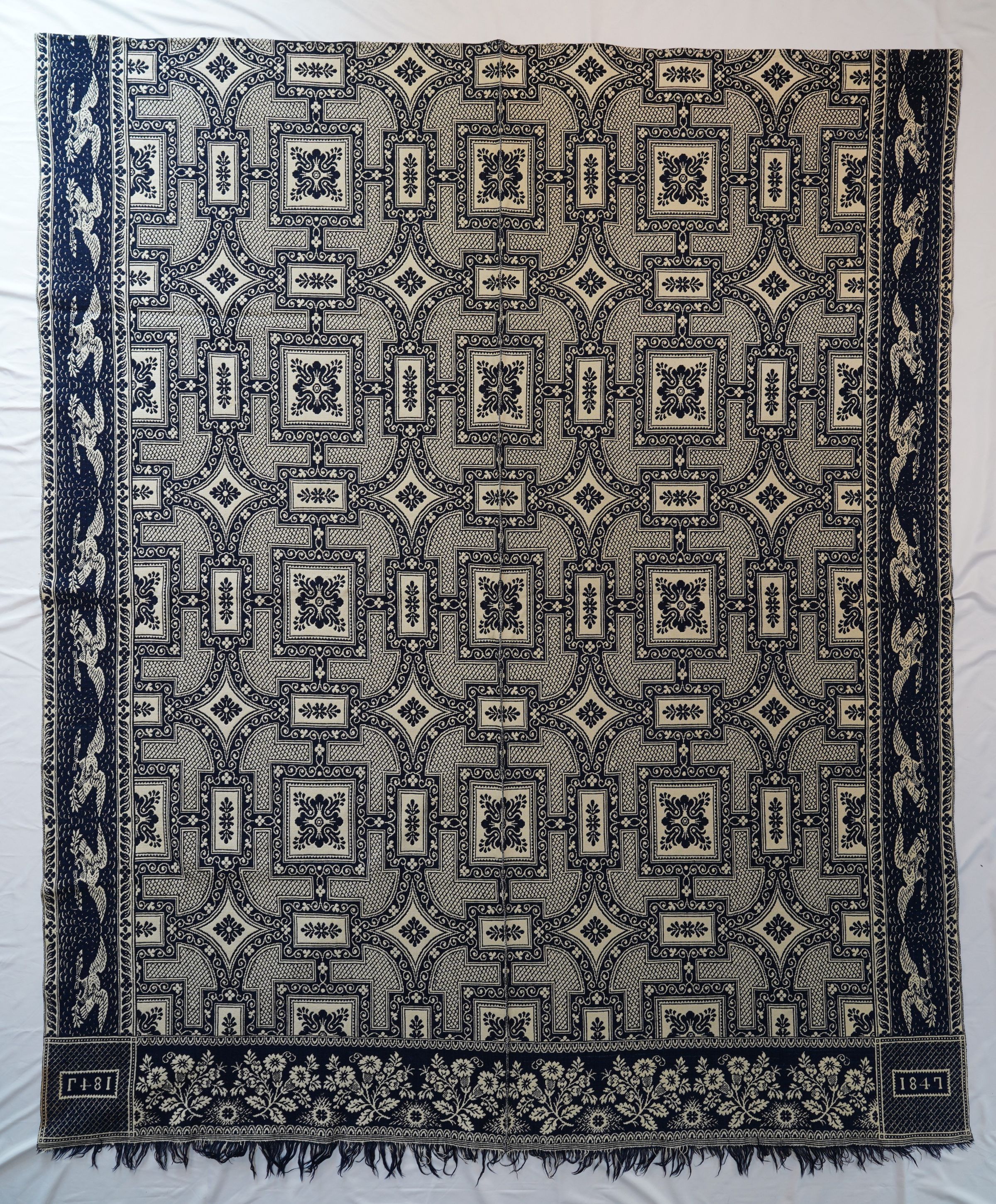 Natural and navy figured double weave coverlet; two panels joined by a center seam. Border on three sides, fringe on bottom.Collection
