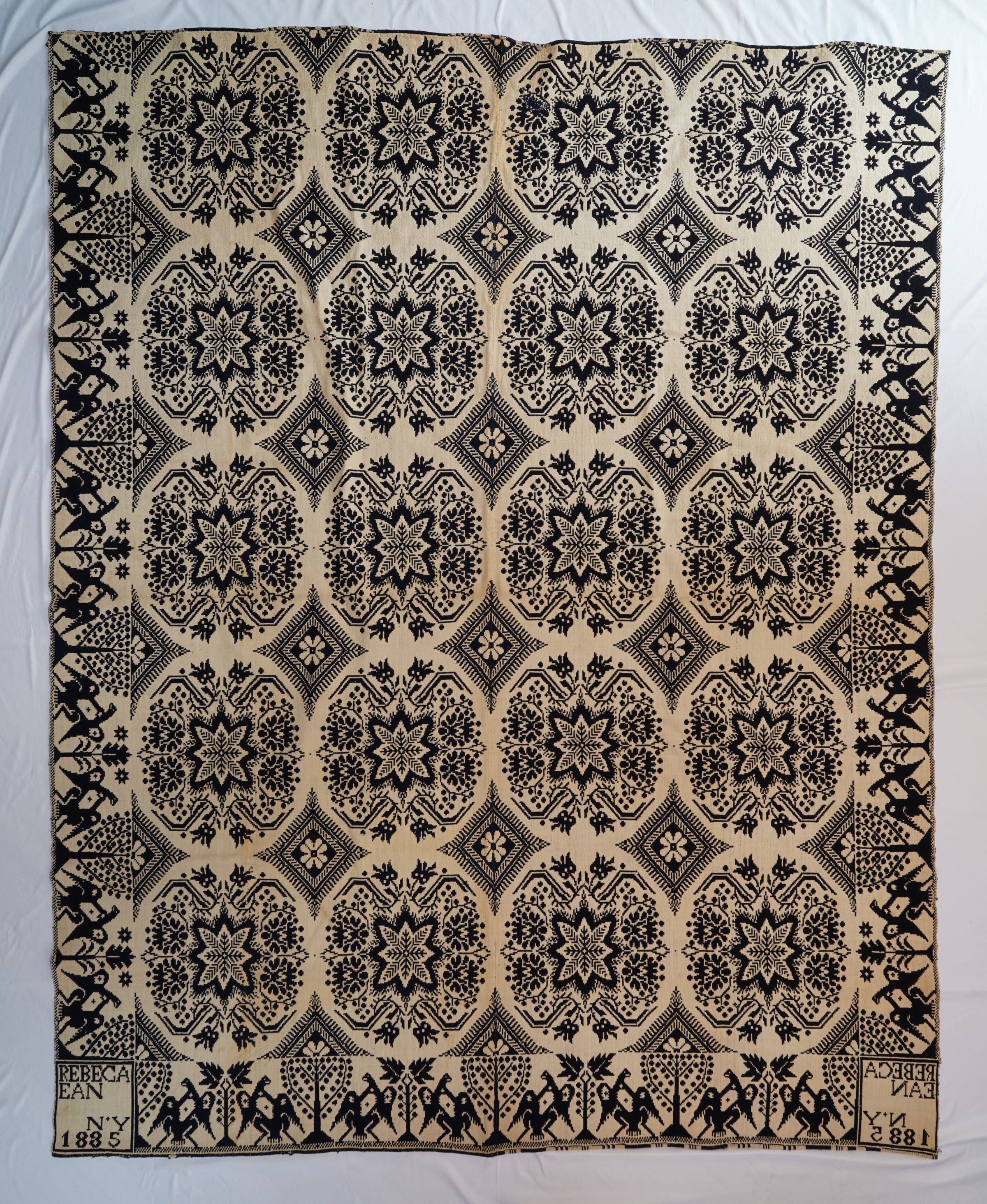 Natural and navy figured double weave coverlet; two panels joined by a center seam. Border on three sides, no fringe.Collection