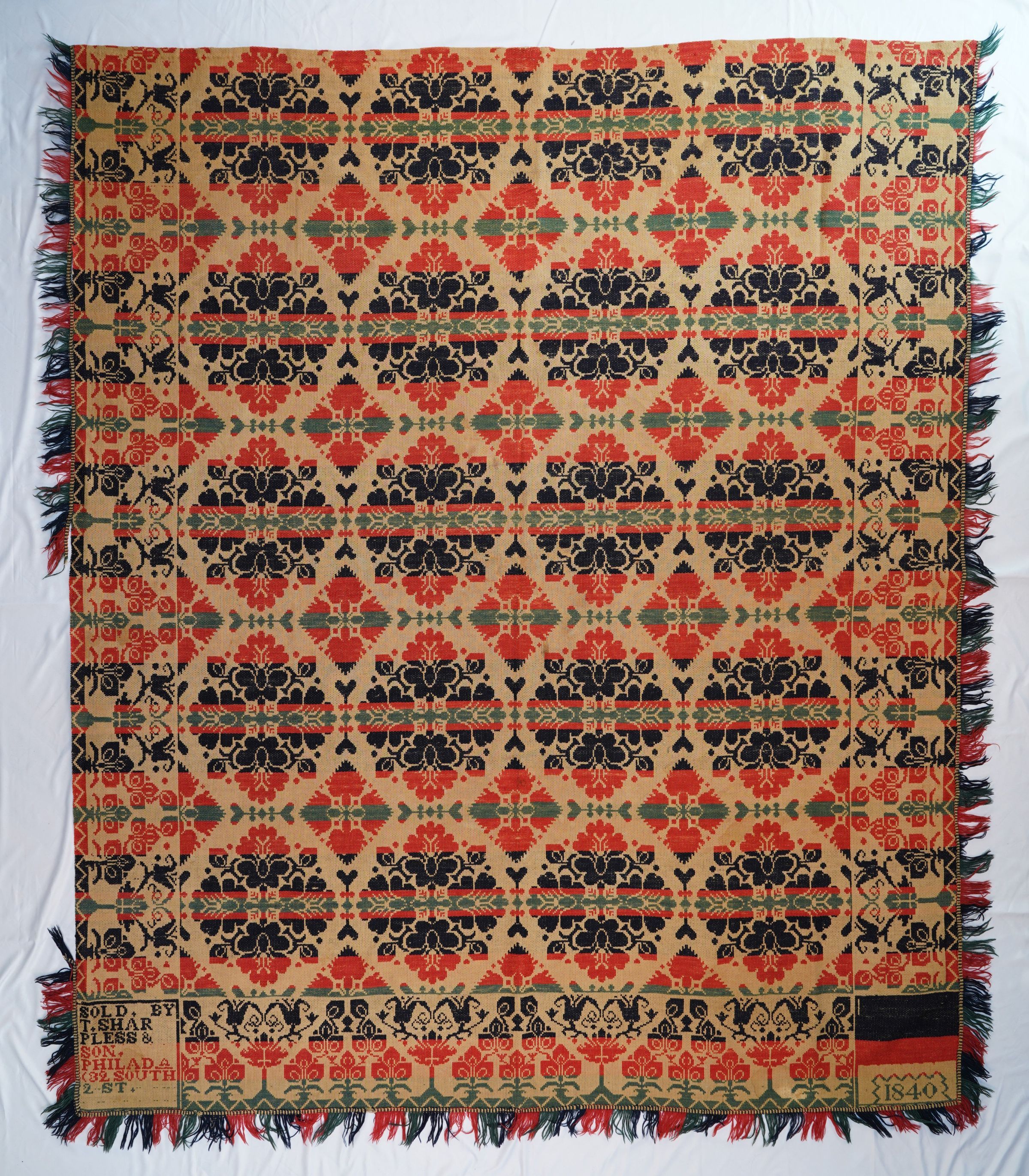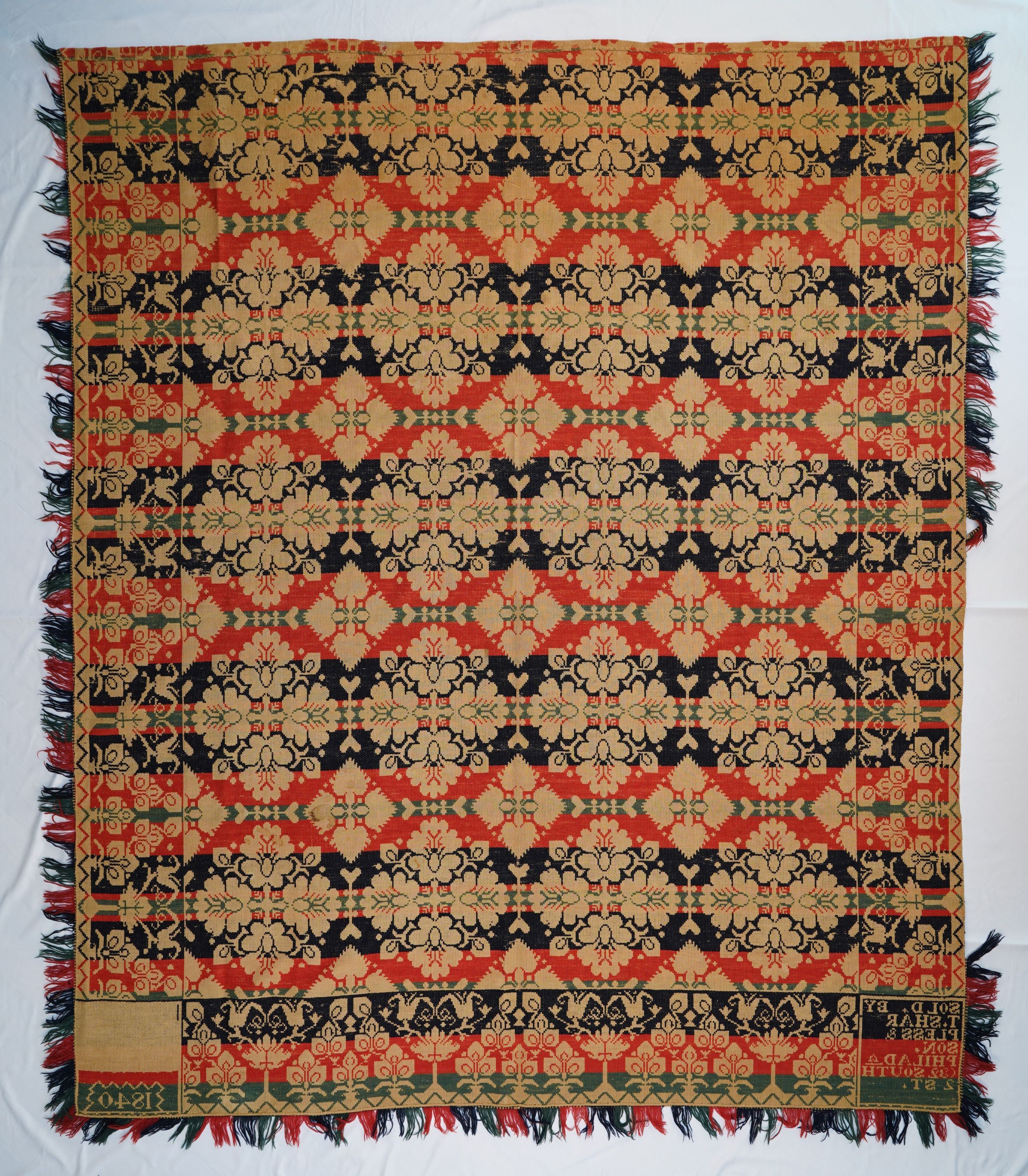 Natural, navy, red, and blue figured tied beiderwand coverlet; seamless. Border and fringe on three sides.Collection
