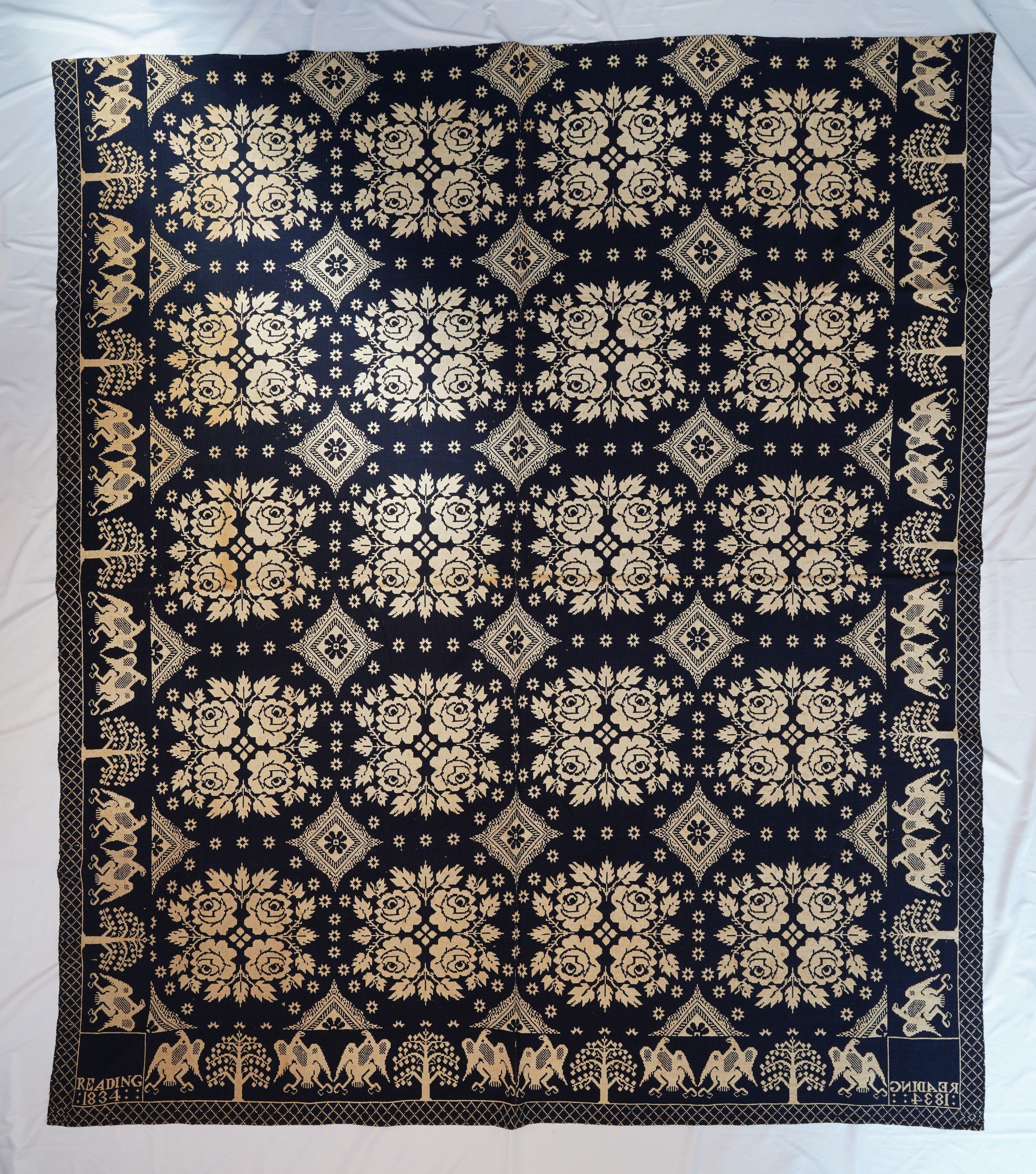 Natural and navy figured double weave coverlet; two panels joined by a center seam. Border on three sides.Collection