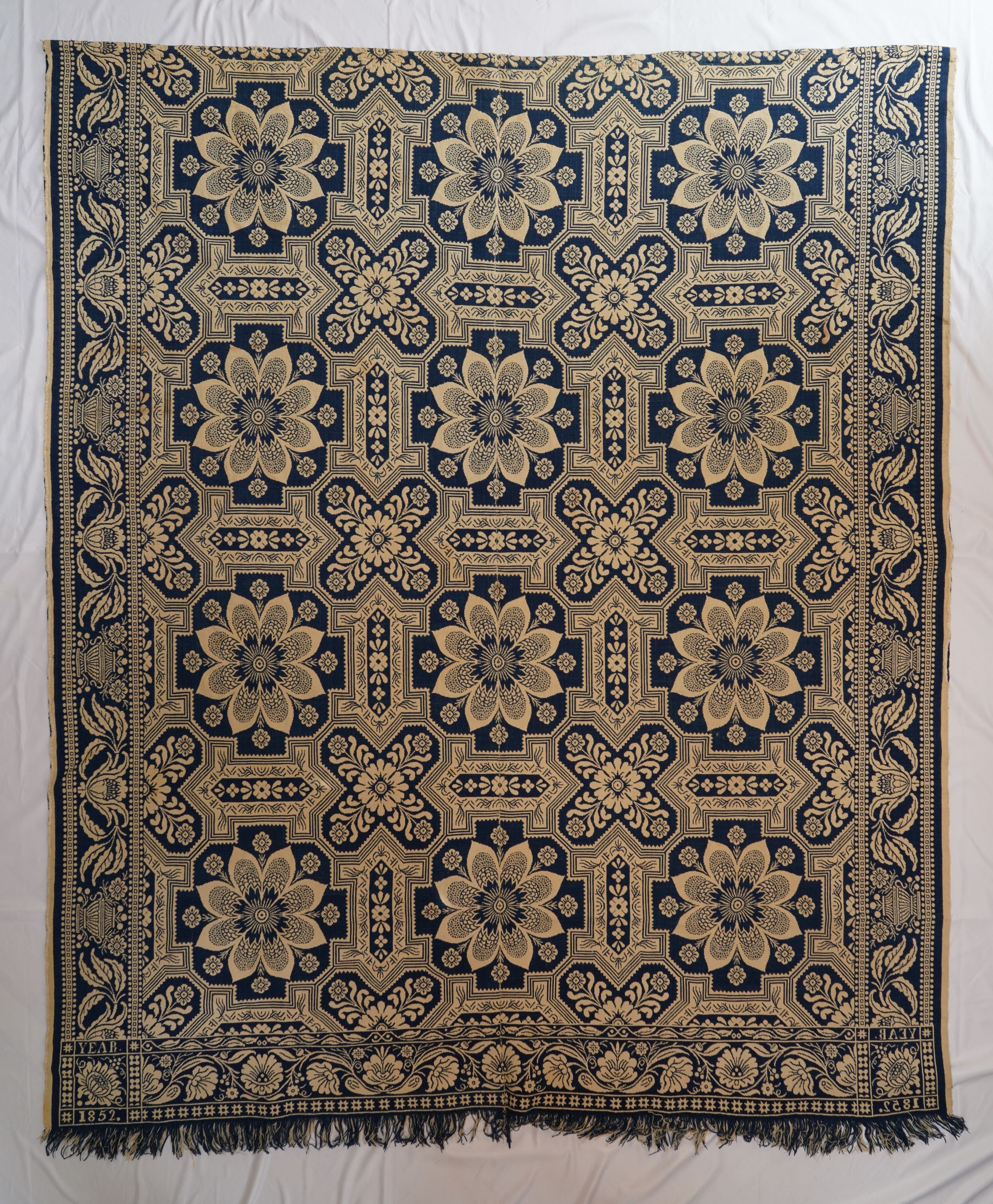 Natural and navy figured double weave coverlet; two panels joined by a center seam. Border on three sides, fringe on bottom.Collection