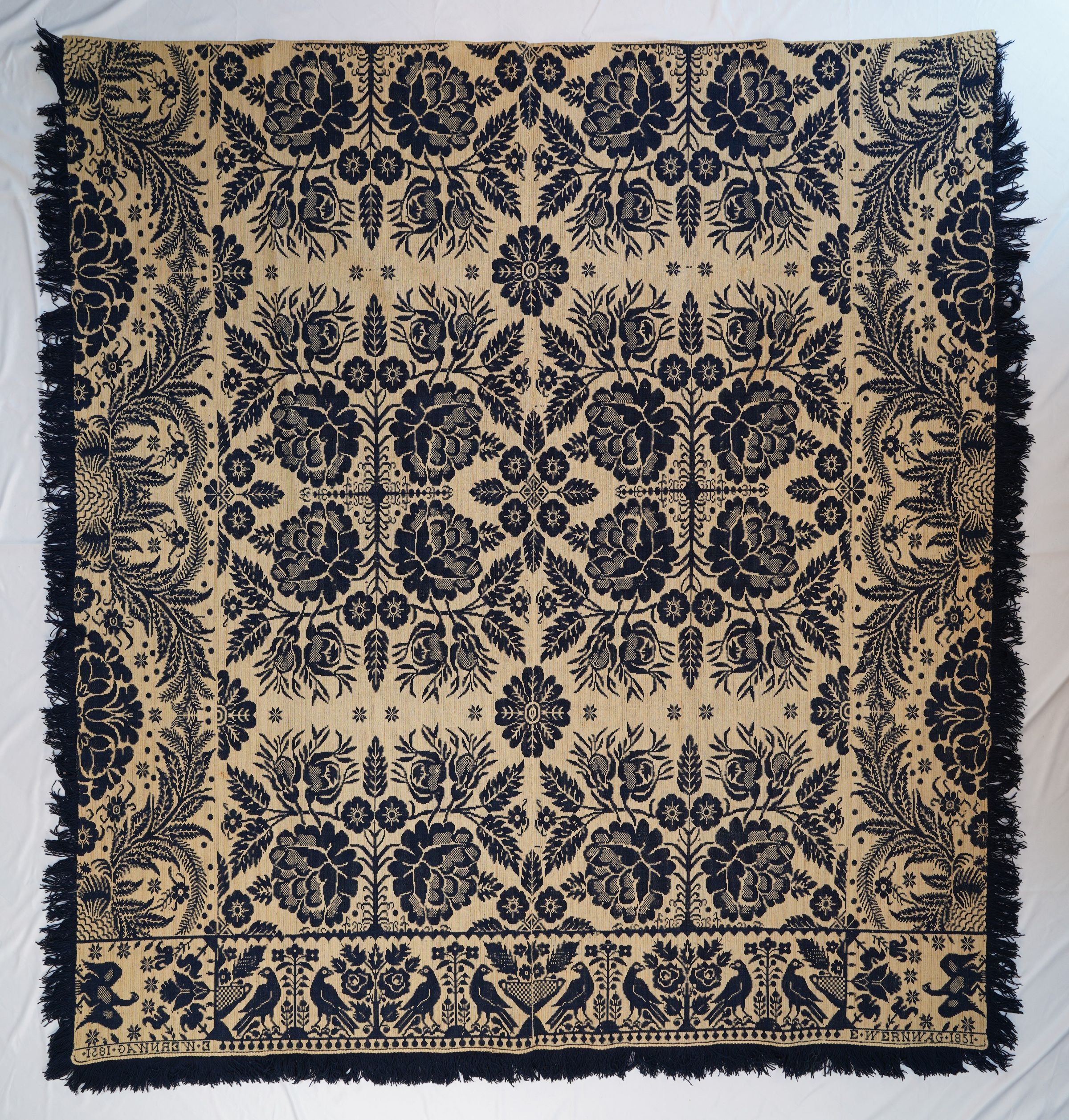 Natural and navy figured double weave coverlet; two panels joined by a center seam. Border and fringe on three sides.Collection