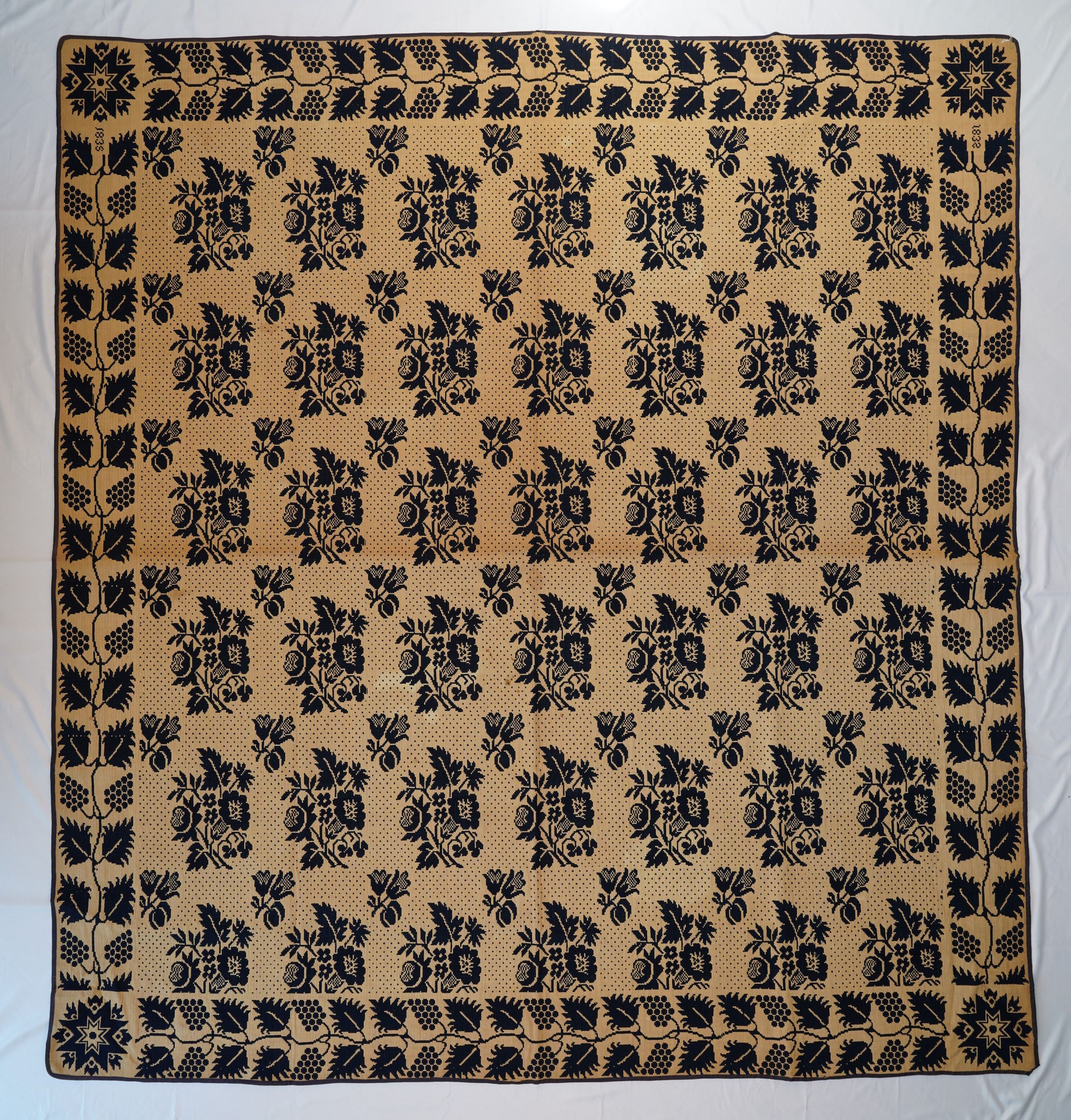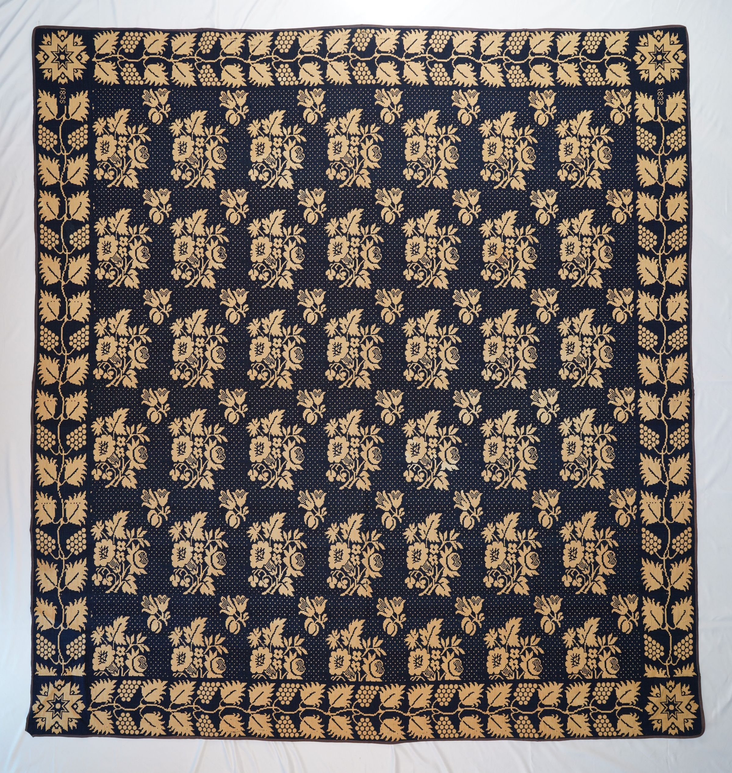 Natural and navy figured double weave coverlet; seamless. Border on four sides, no fringe.Collection