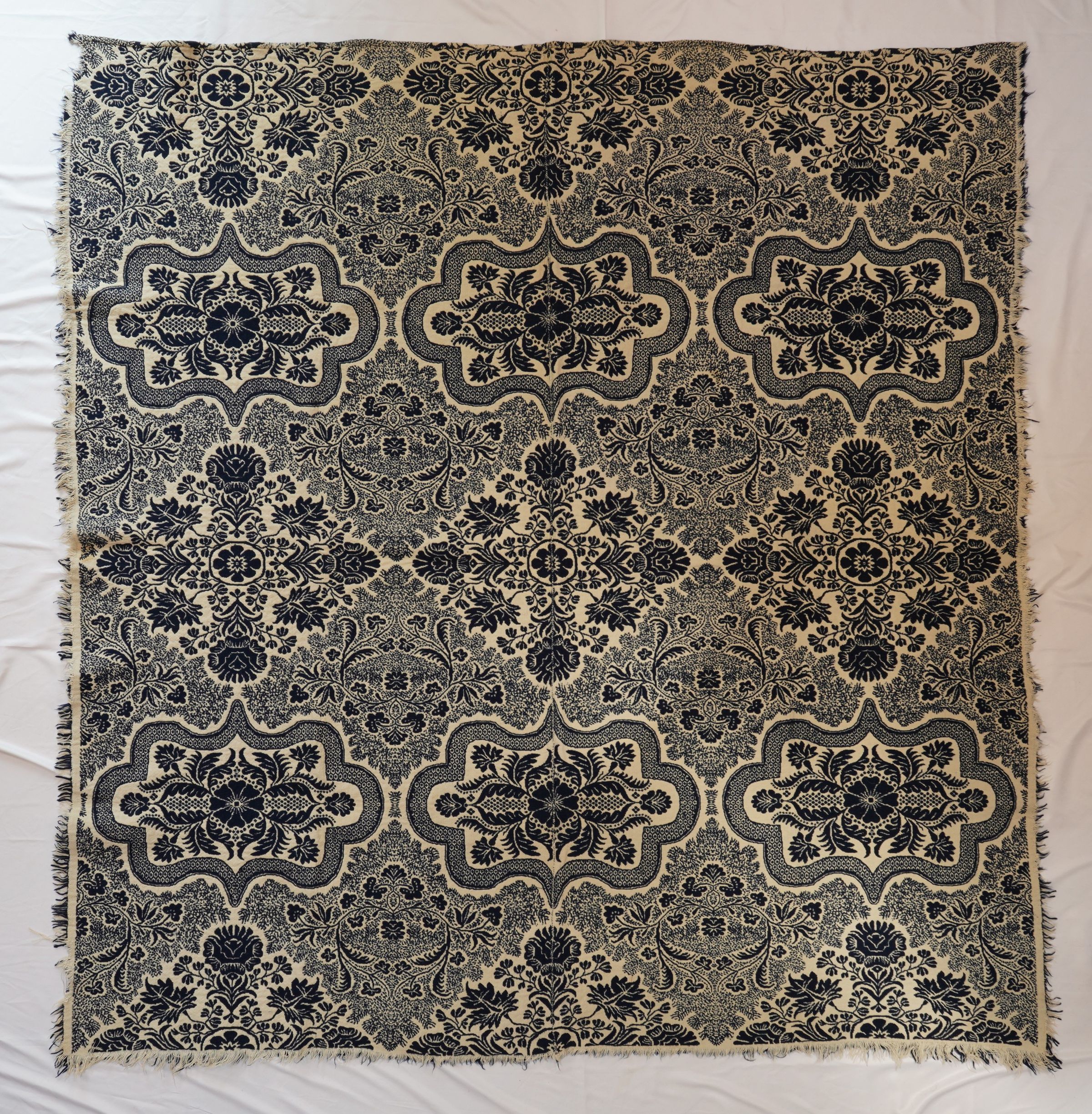 Navy and natural figured doubleweave coverlet; two panels joined. Centerfield pattern of large diamond and curly medallions in alternating rows. No borders. Fringe on three sides.Collection