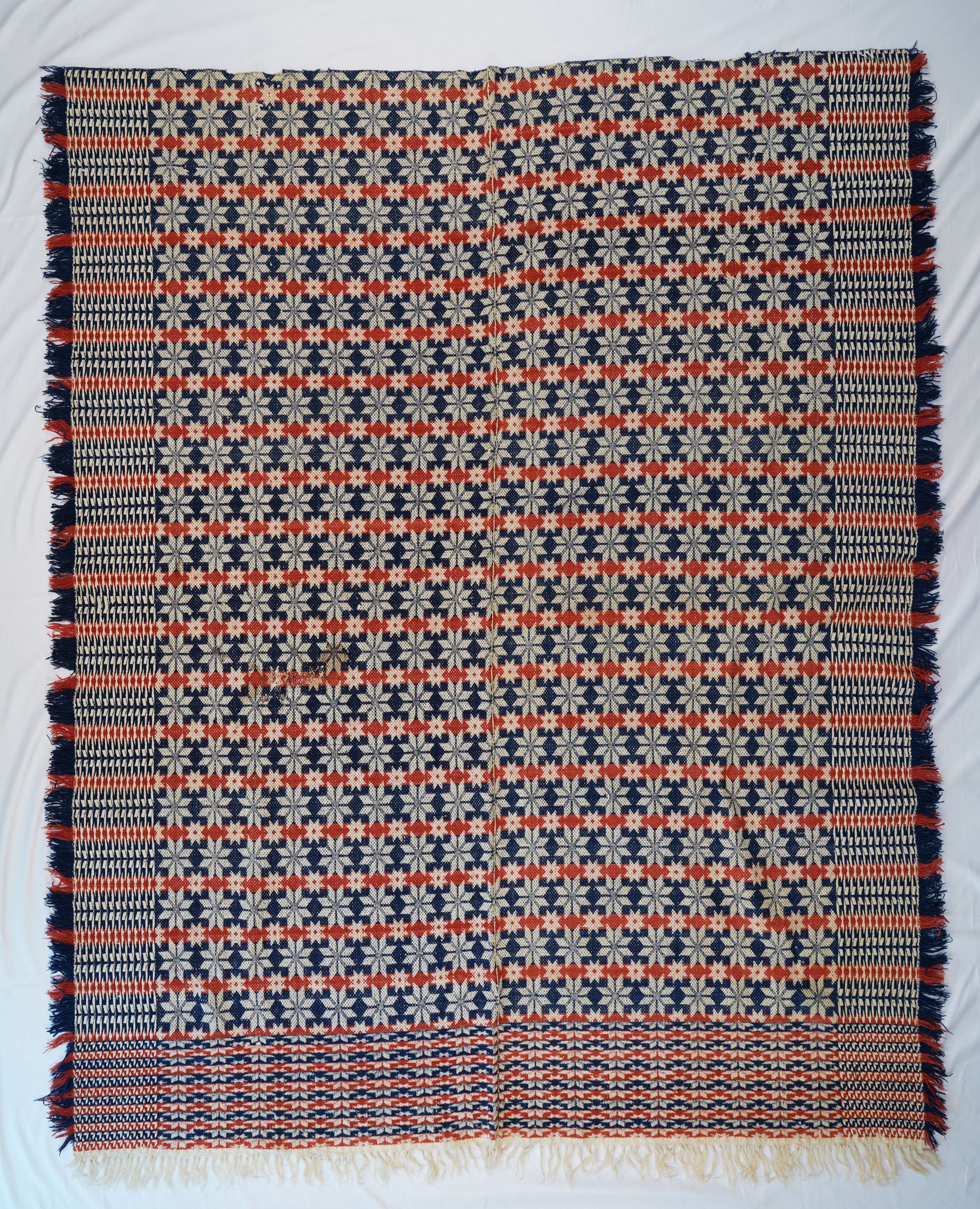 Navy, red and natural starwork coverlet; geometric big & little stars pattern. Two panels joined. Border and self-fringe on three sides.