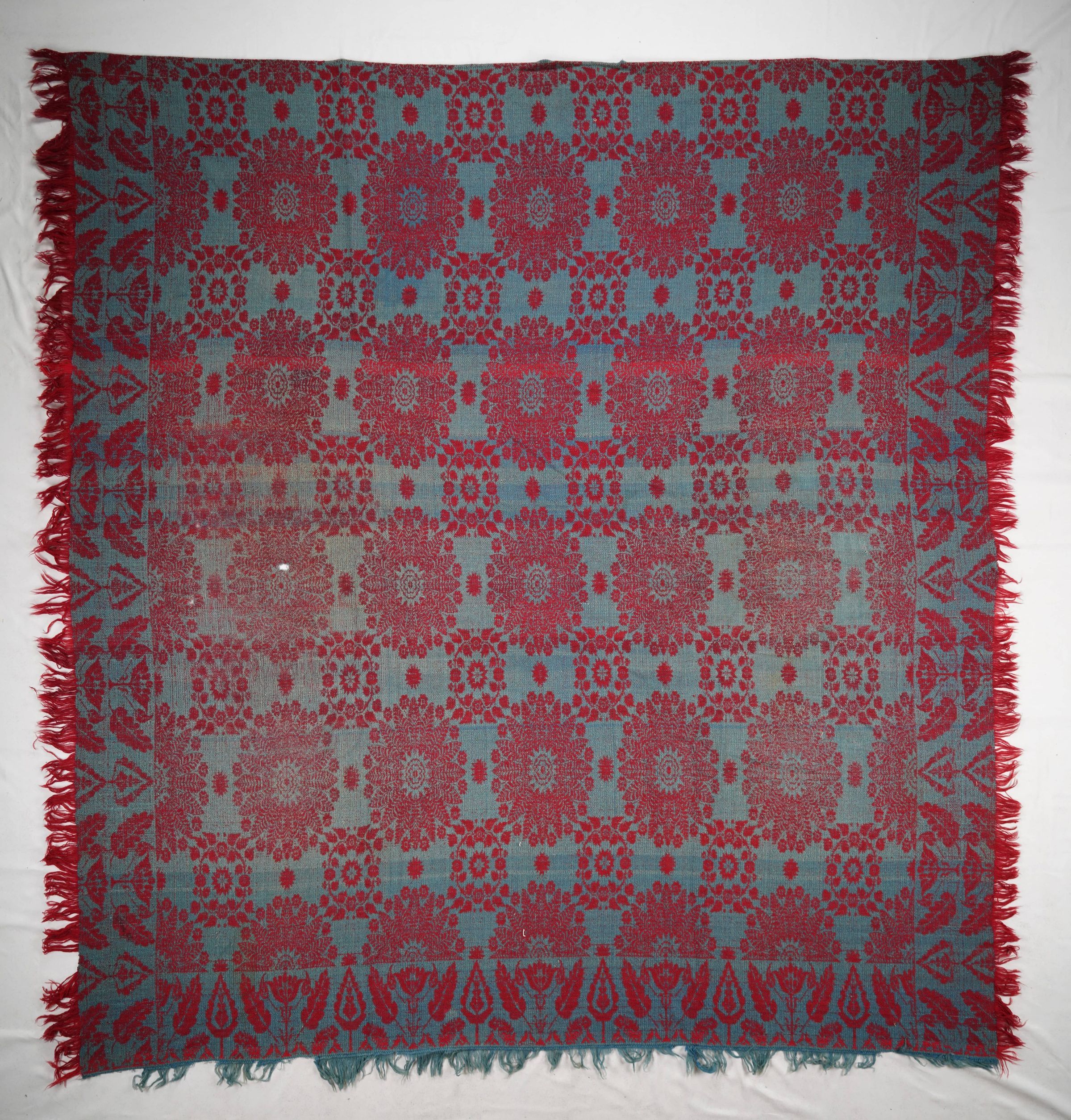 Red and blue figured tied beiderwand coverlet; seamless. Border and fringe on three sides.