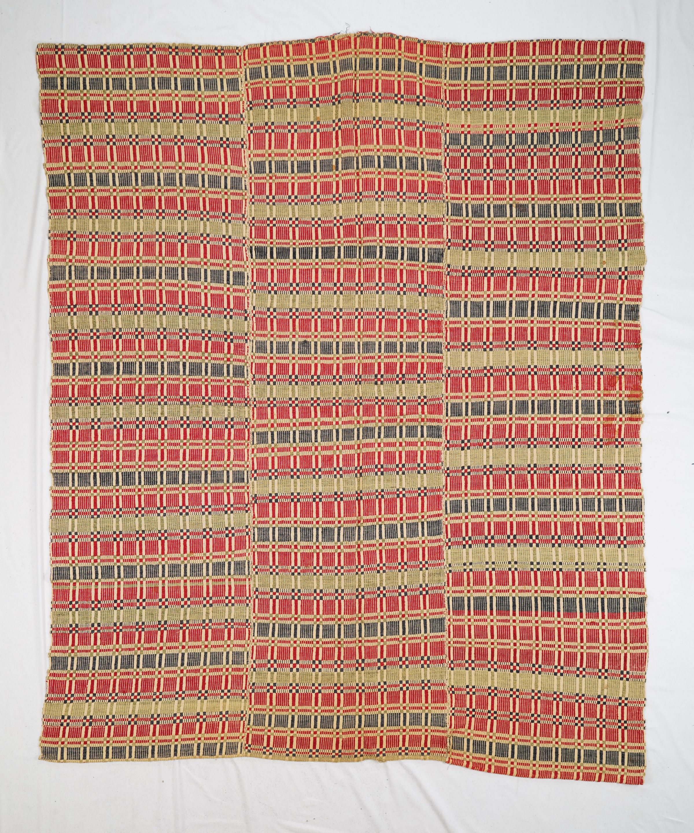 Natural, green, and red geometric monk's belt coverlet; three panels joined by equidistant seams. No border or fringe.Collection