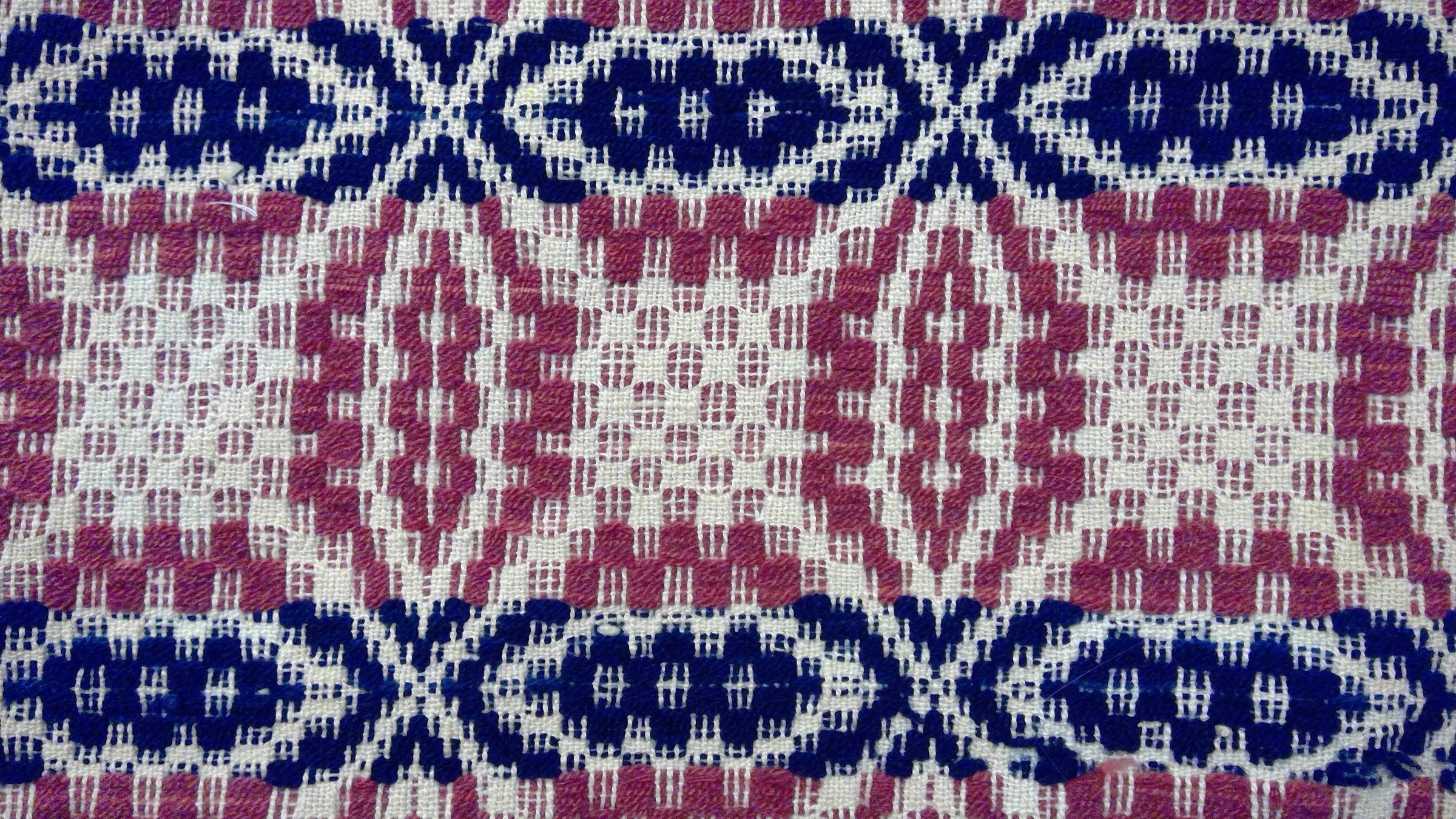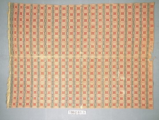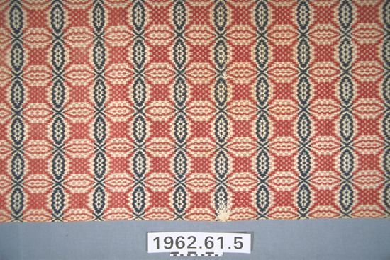 Overshot coverlet; undyed cotton and red and blue wool. Cneter seam joins two panels. Slevedges on sides; top hemmed, bottom fringed. Central motif consists of interlocking rings (Lovers Knot) with a checkerboard table at the cneter of each ring. Bottom has a double border mof elongated ovals.Collection