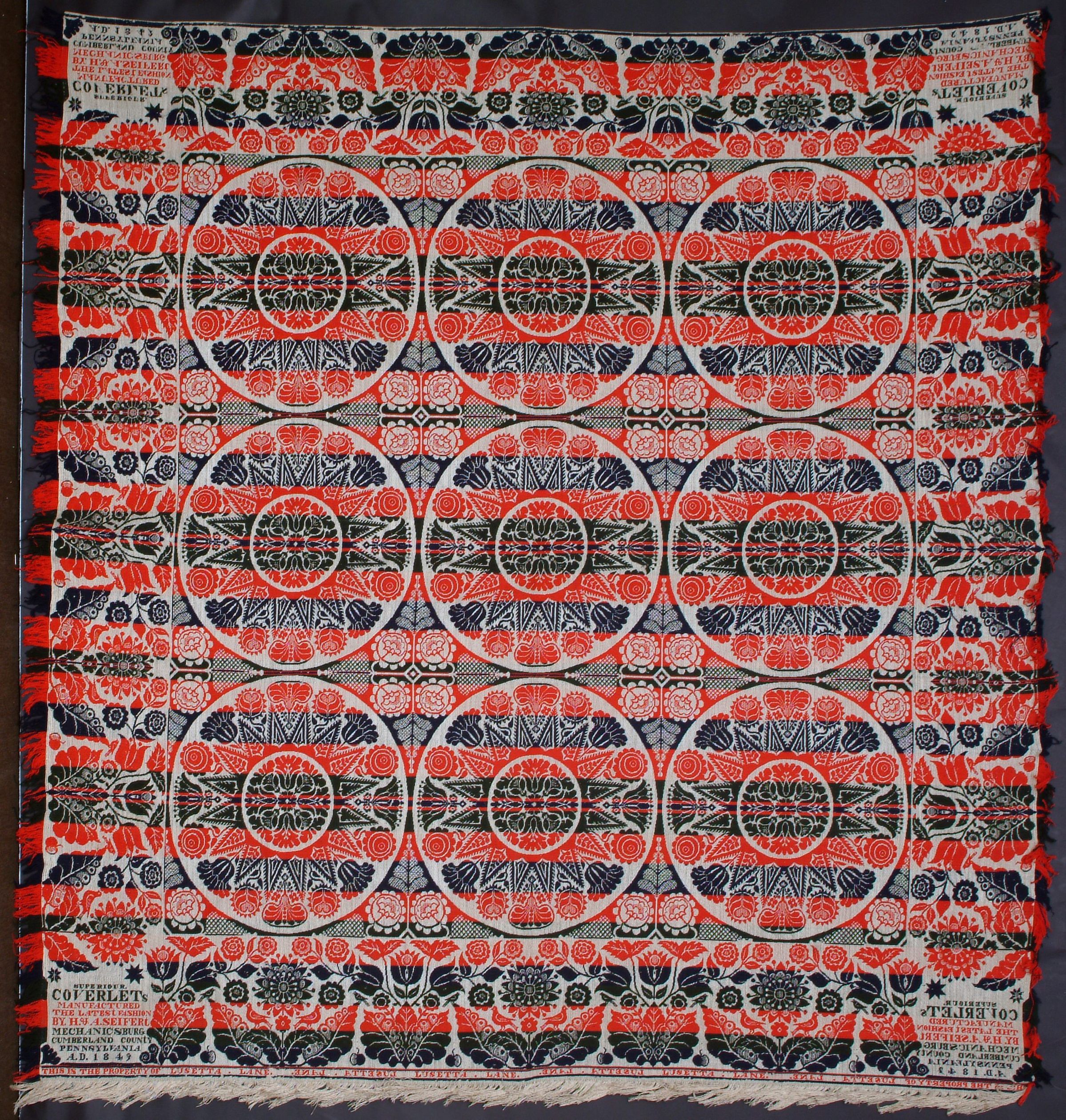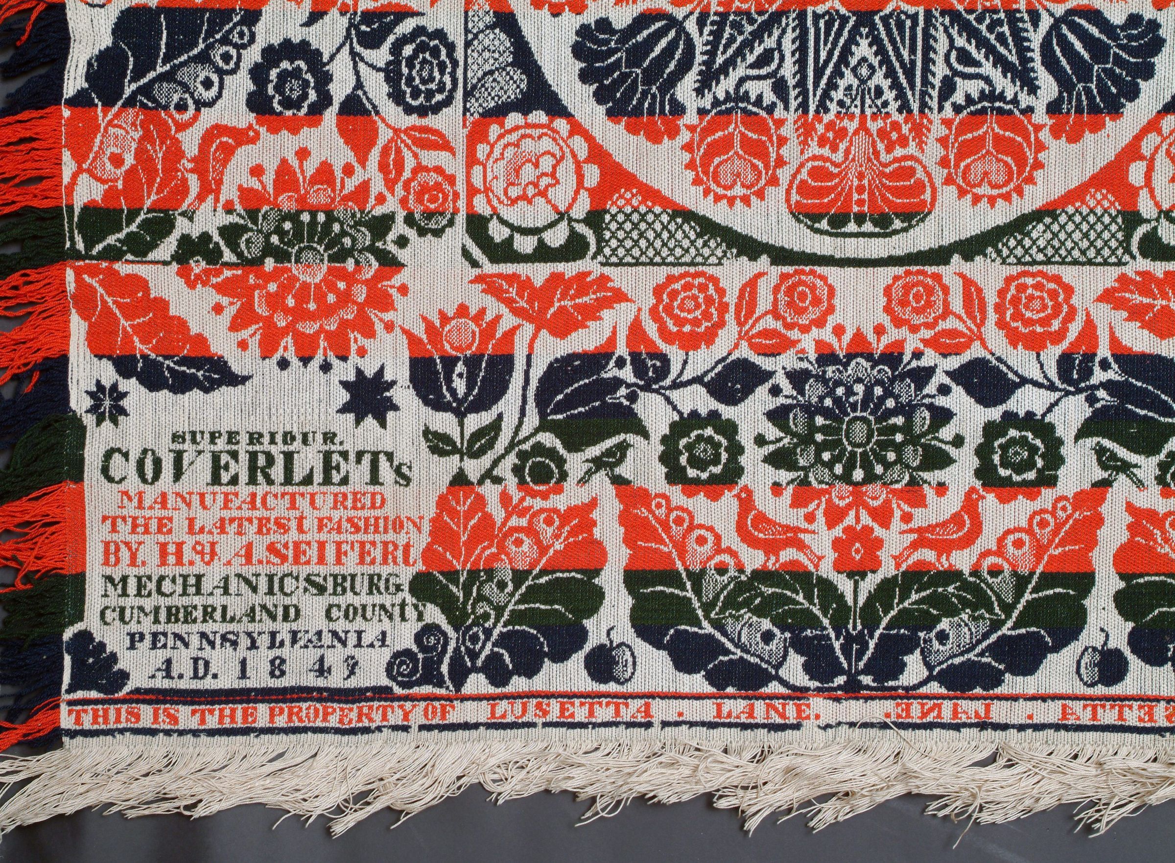 SUPERIOR/COVERLETs/MANUFACTURED/THE LATEST FASHION/BY. H.& A.SEIFERt/MECHANICSBURG/CUMBERLAND COUNtY/PENNSYLVANIA/ A.D. 1849Material/Technique