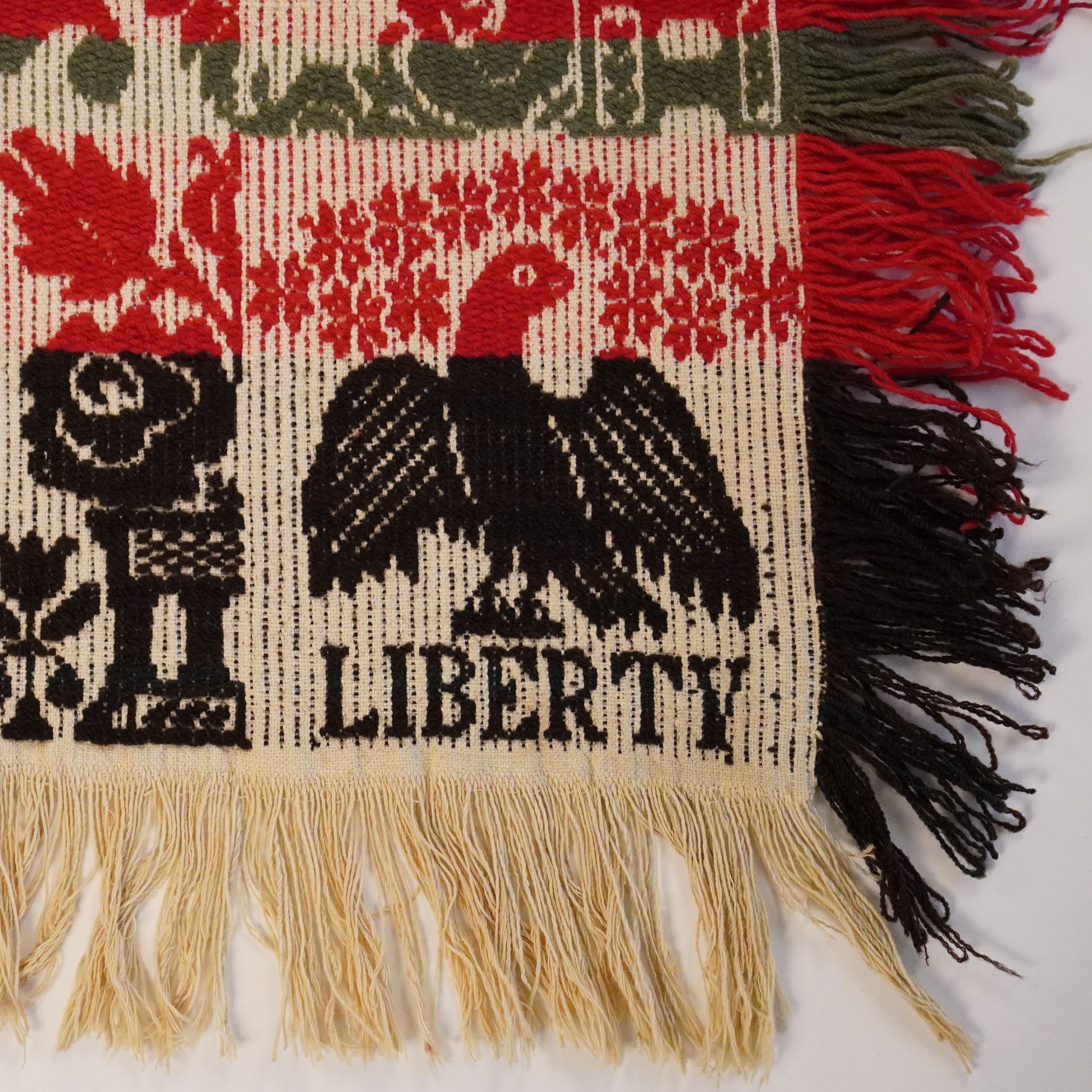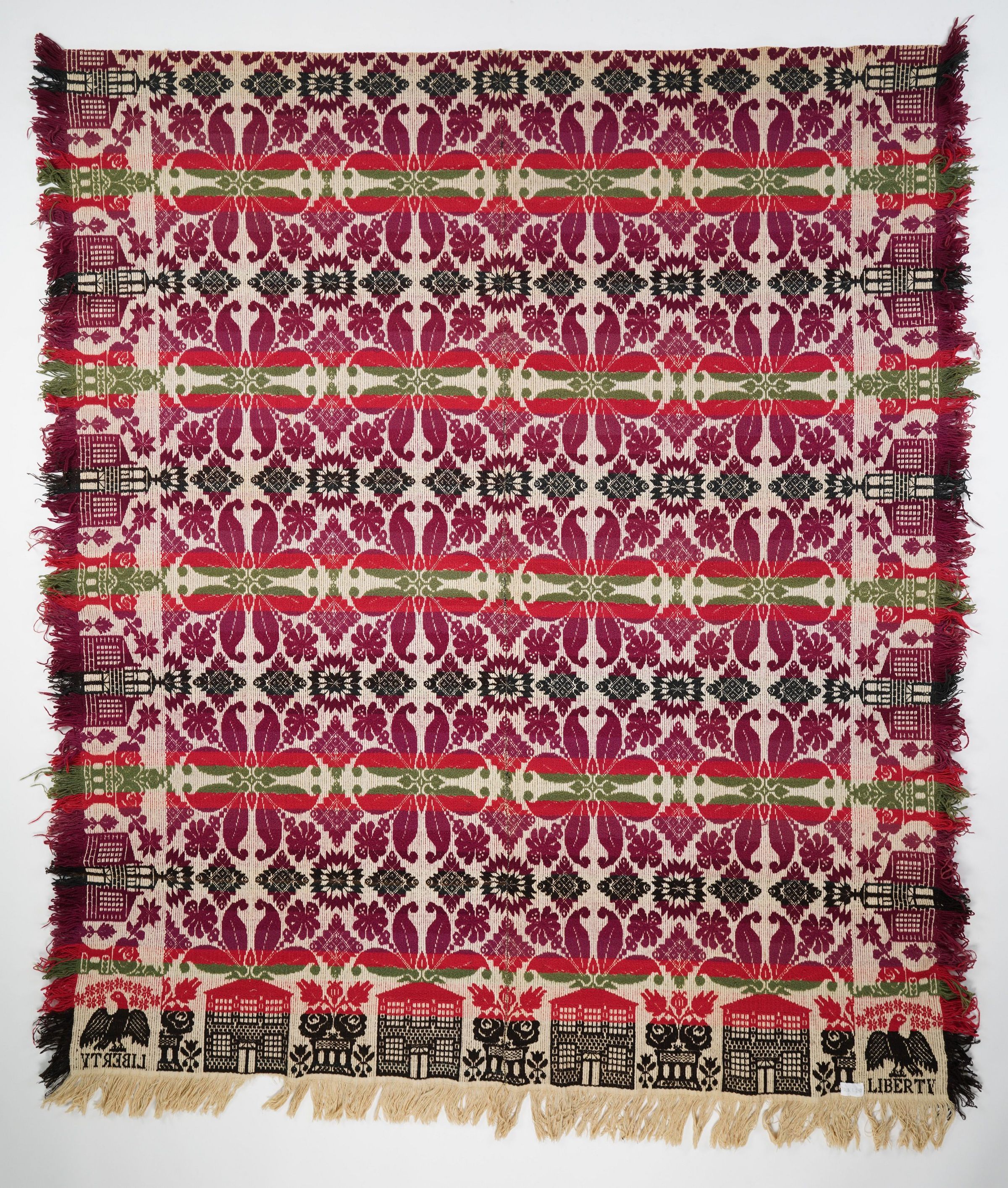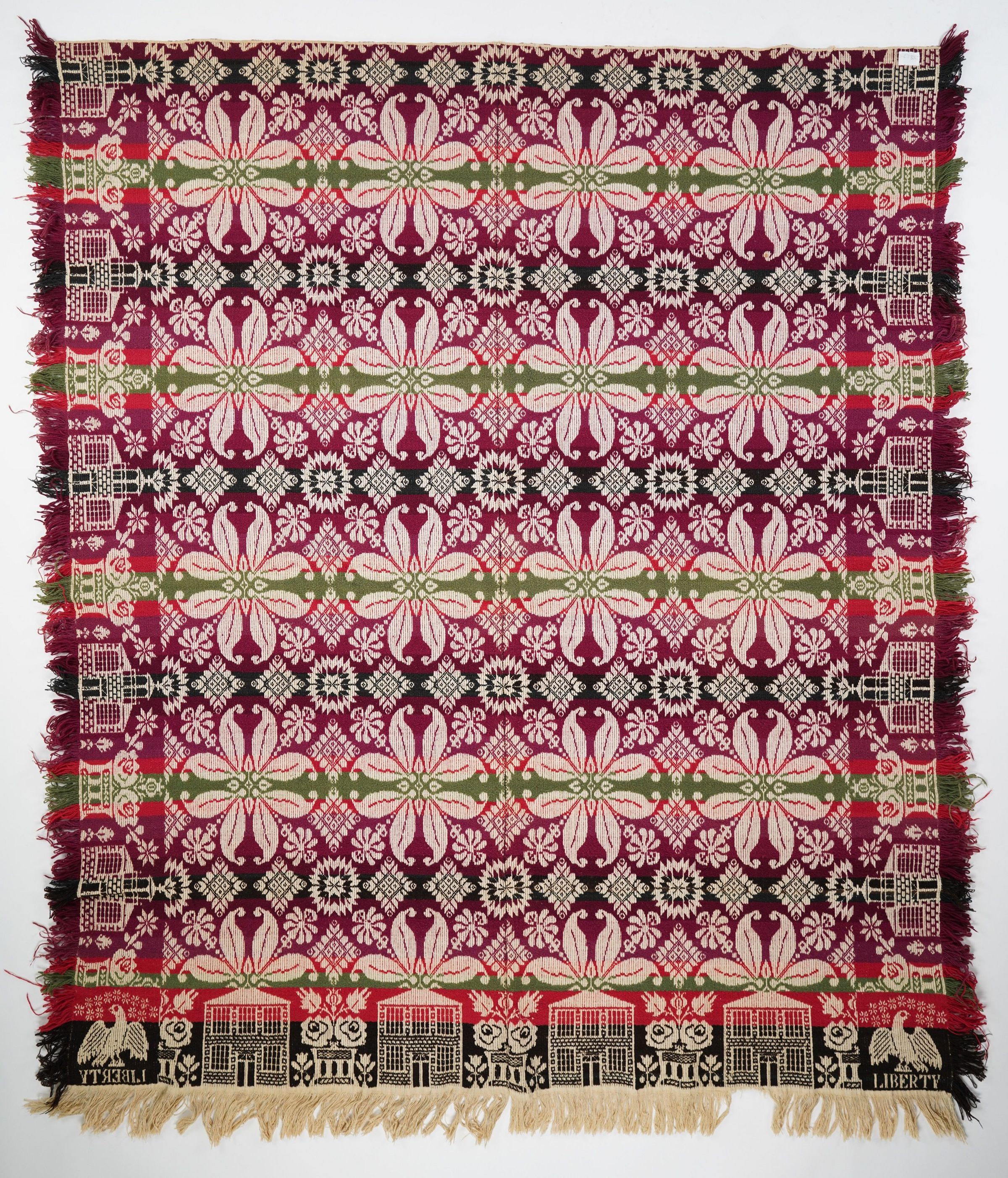 Beiderwand; black, purple, green, natural; two loom widths joined; 2 corner blocks with eagles; border of buildings (churches and houses?) and potted plants; centerfield has rows of flowers and stars, strips of colorCollection
