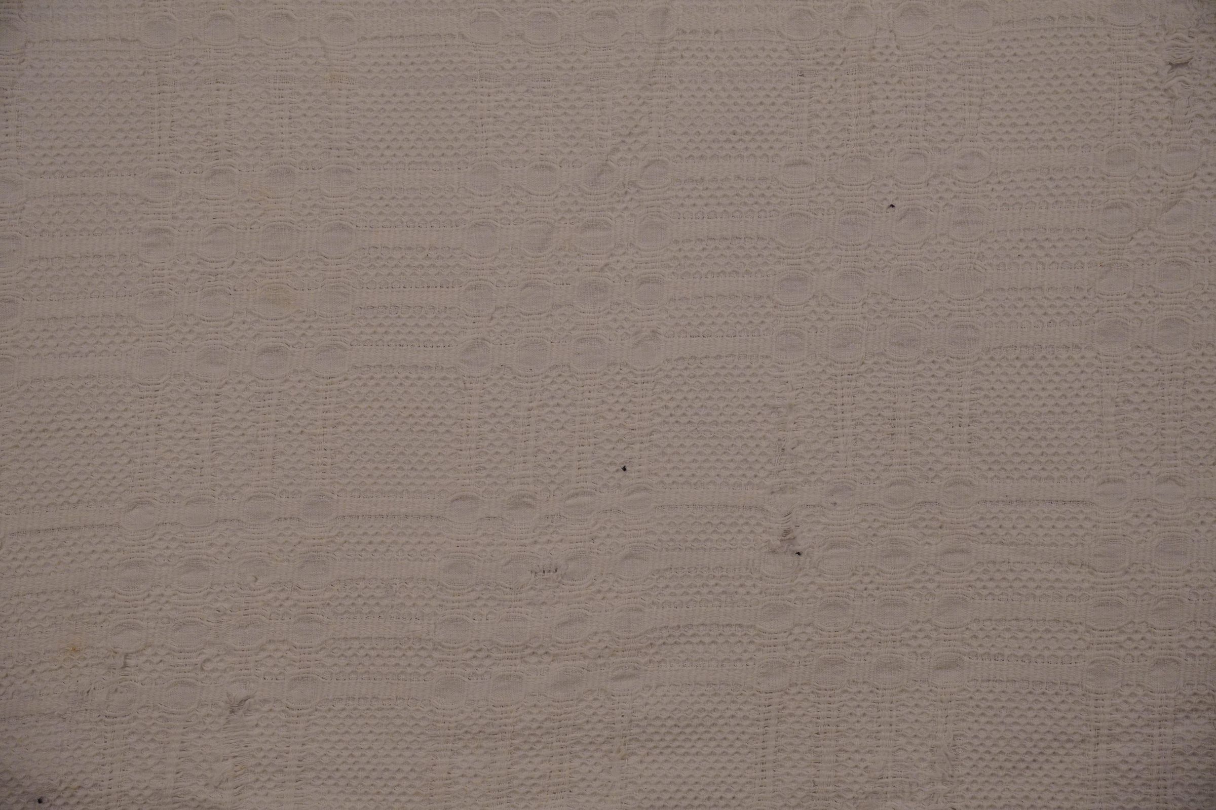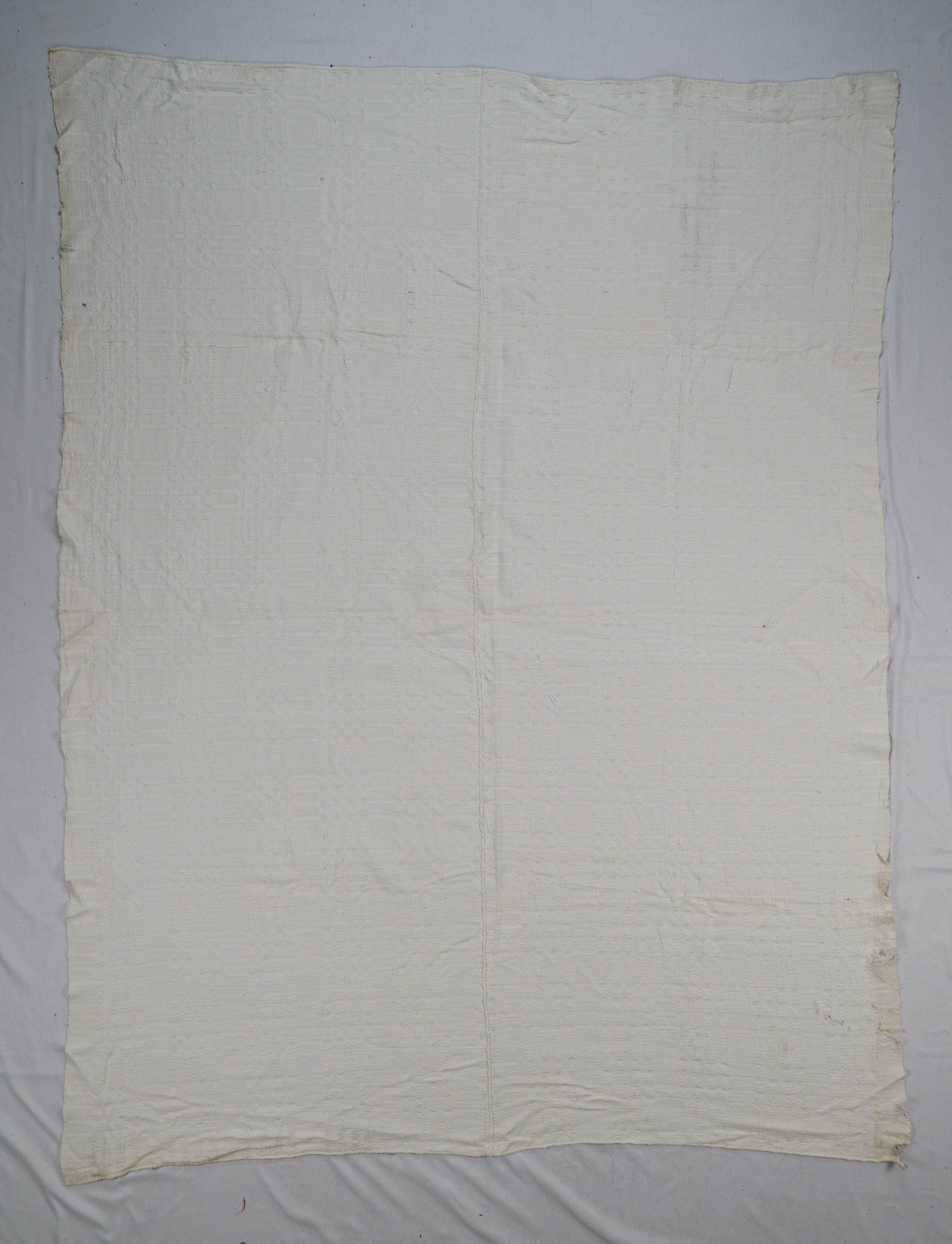 White geometric M's and O's counterpane coverlet; two panels joined by a center seam. No fringe or border.