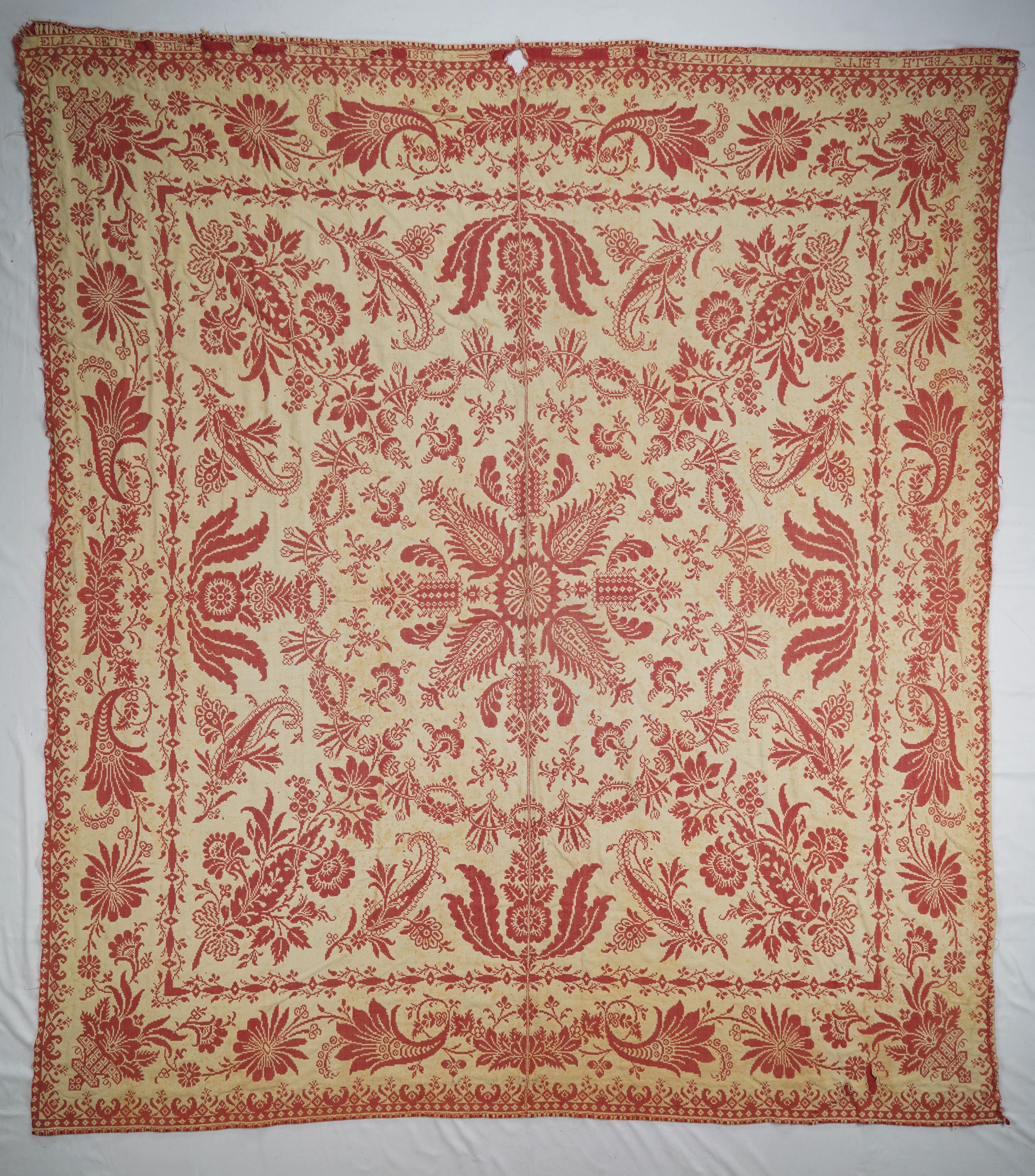 Natural and red figured Double Weave coverlet; two panels joined with a center seam. Border on four sides; no fringe.Collection