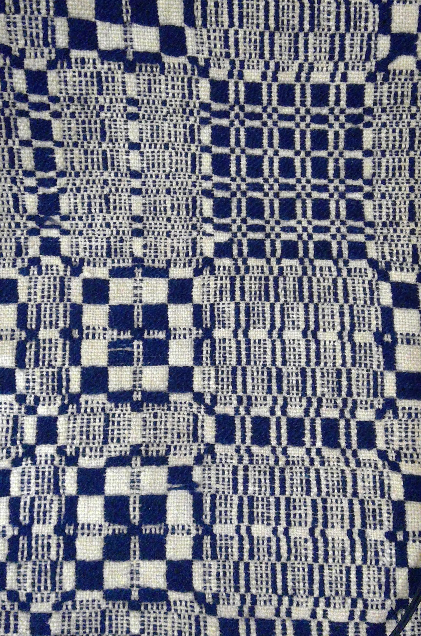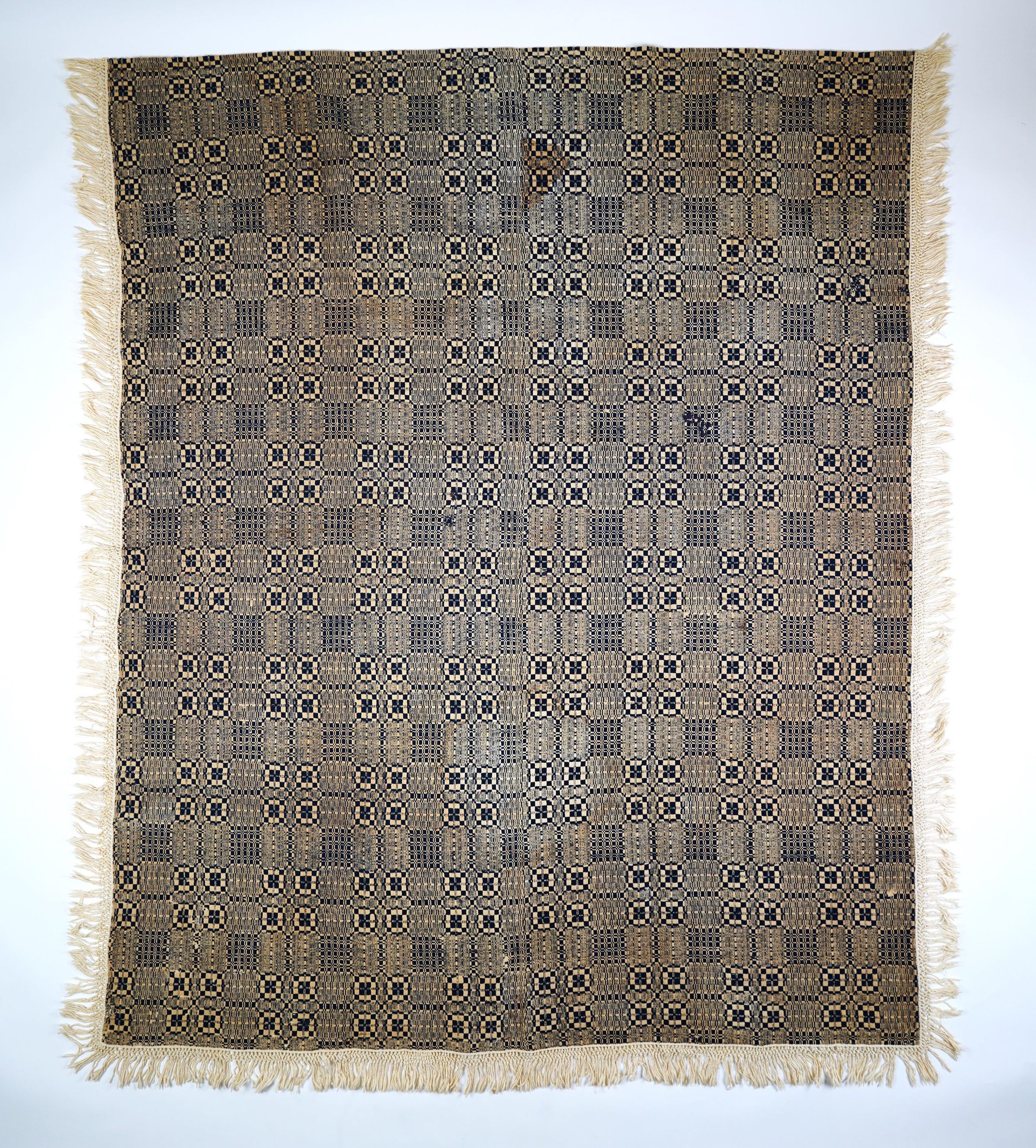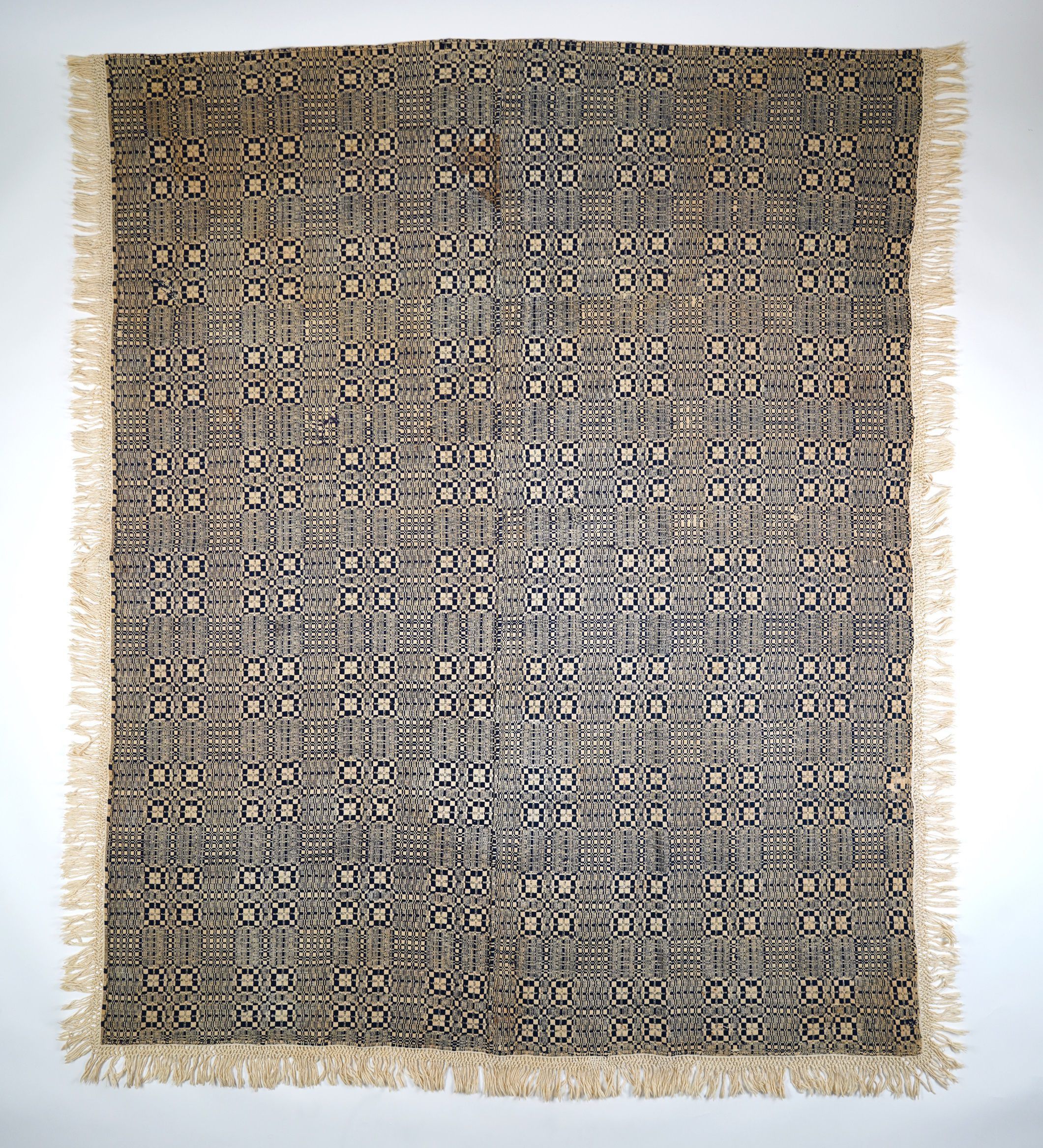 Navy and natural geometric overshot coverlet. Two loom widths joined by a center seam. Hemmed with knotted cotton fringe likely added at a later date. Chariot wheels pattern with table, woven on opposites.Collection