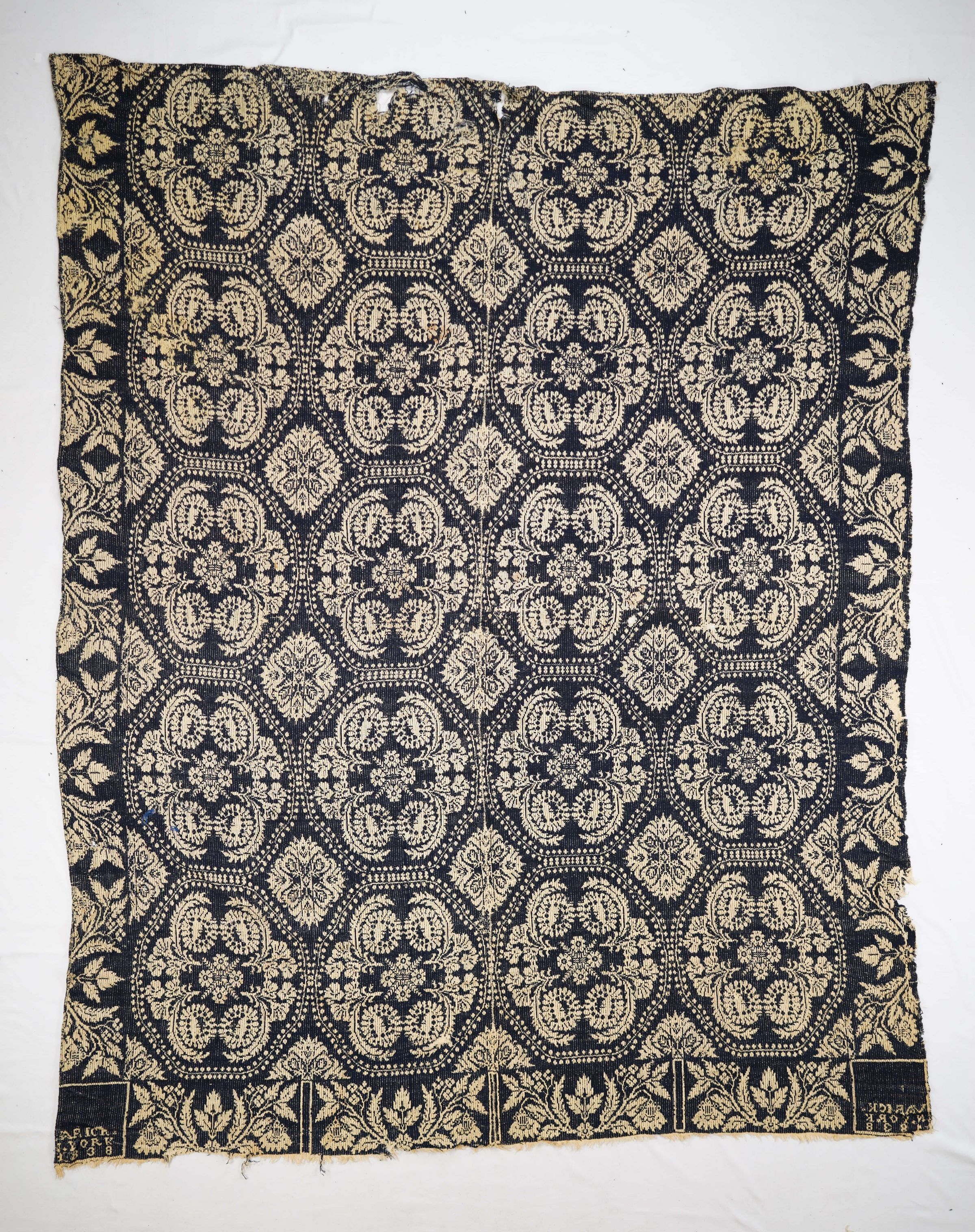Natural and navy figured Tied Beiderwand 4:1 coverlet; two panels joined by a center seam. Border on three sides; no fringe.Collection