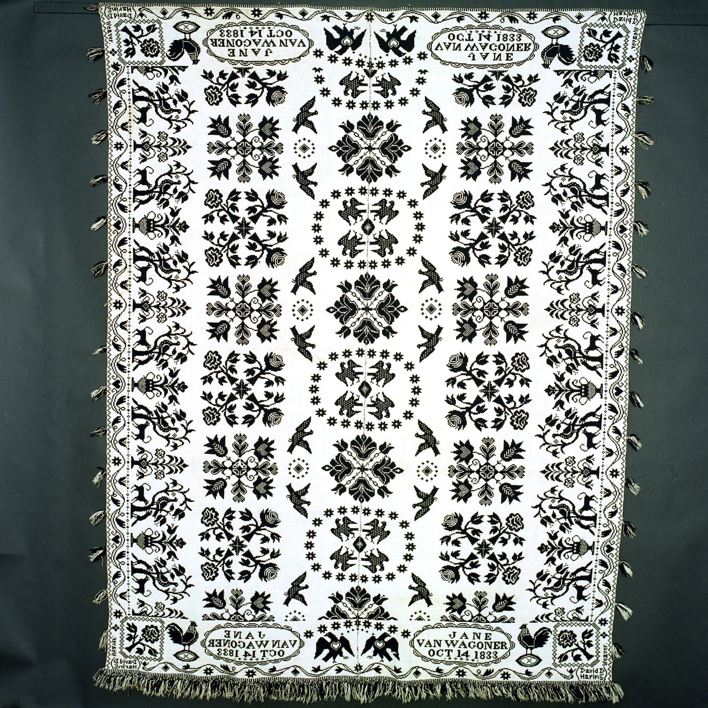 Double weave; navy, natural; two loom widths joined; tassels on two sides; side borders contain a vine pattern with leaves and hearts beneath trees and animals (bird, squirrel, dog); top and bottom borders contain flowers, rosettes, eagles, stars, and inscriptions; centerfield contains eagles in two positions and flowersCollection