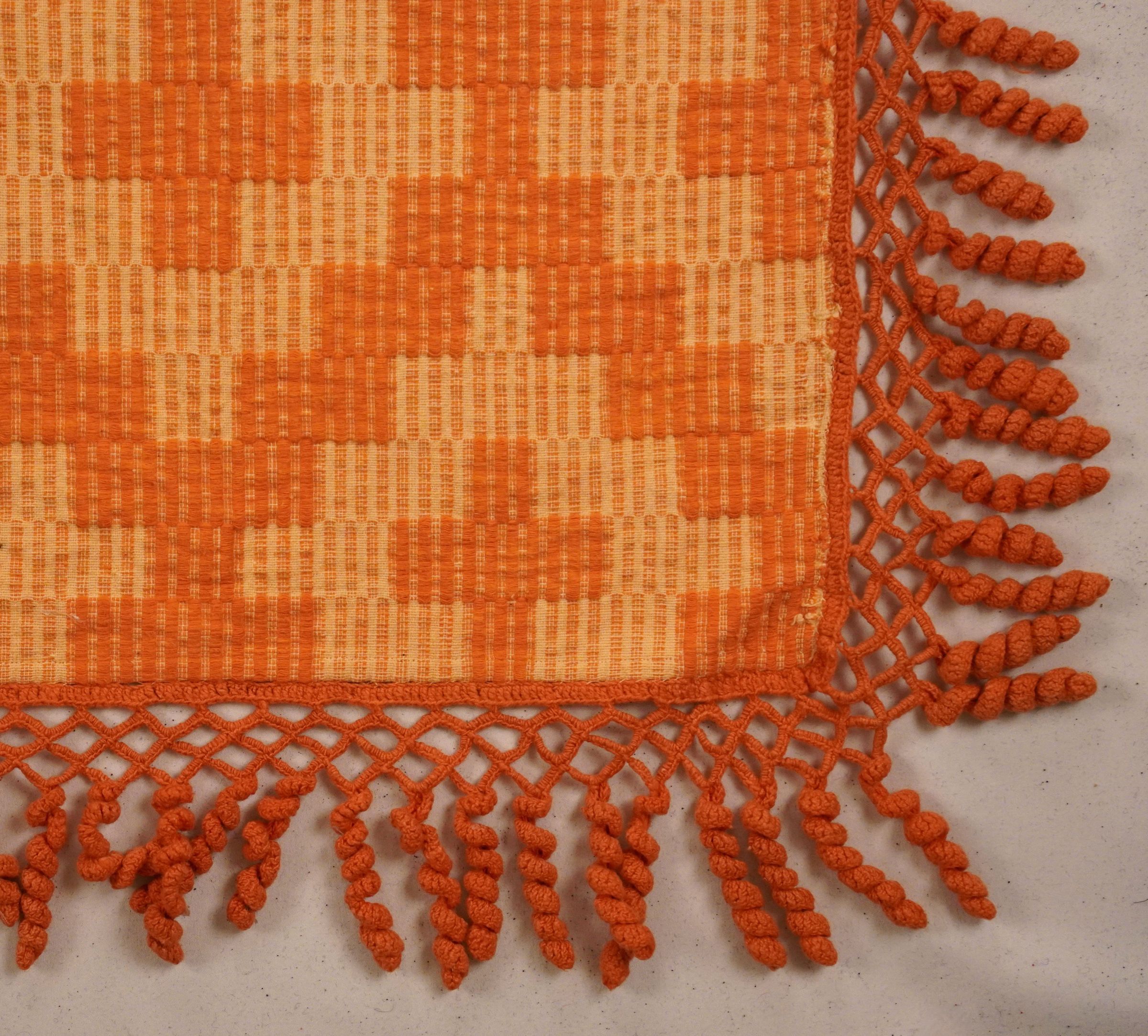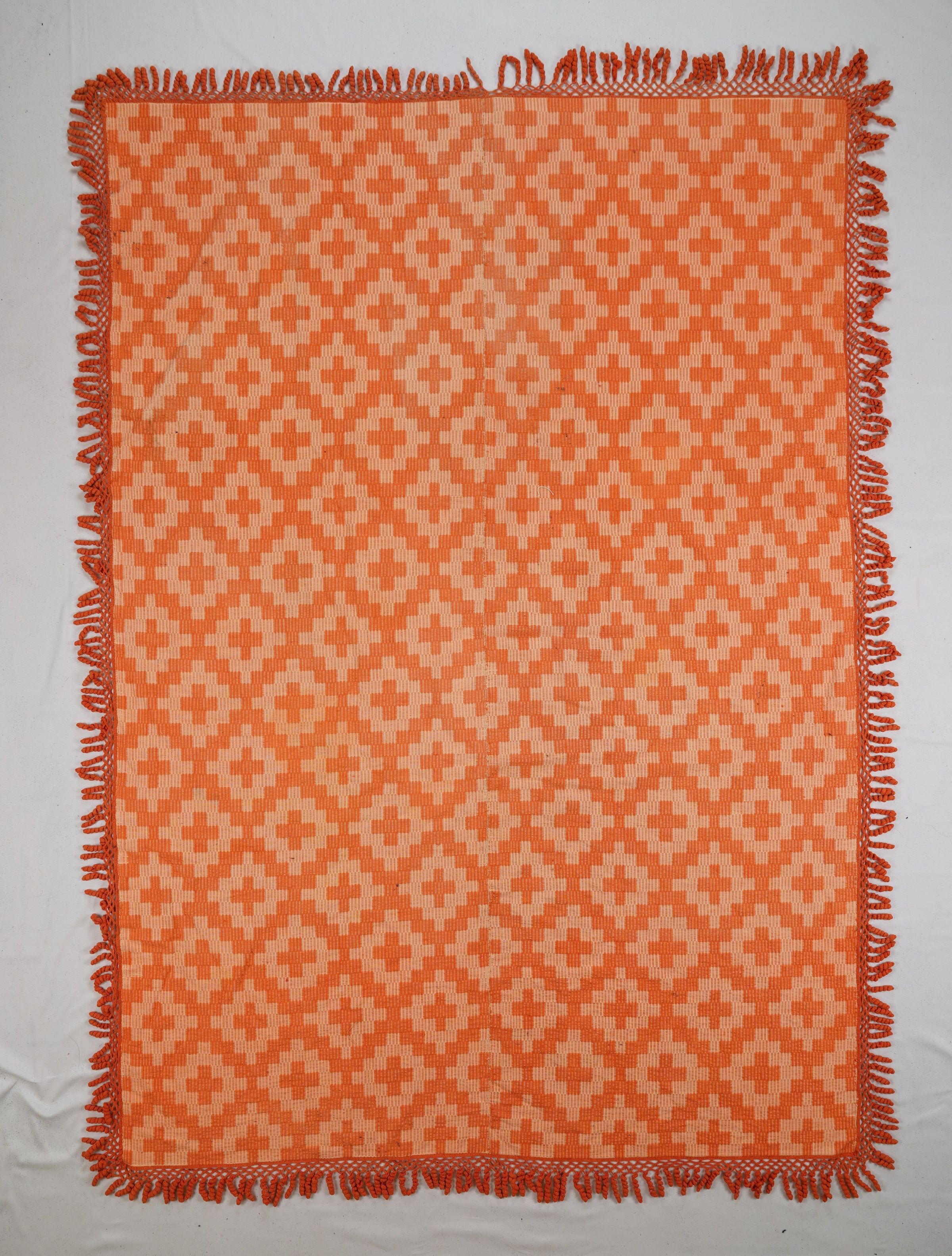 Orange and natural geometric Overshot coverlet; two panels joined by a center seam. Curly/crochet fringe on four sides.Collection