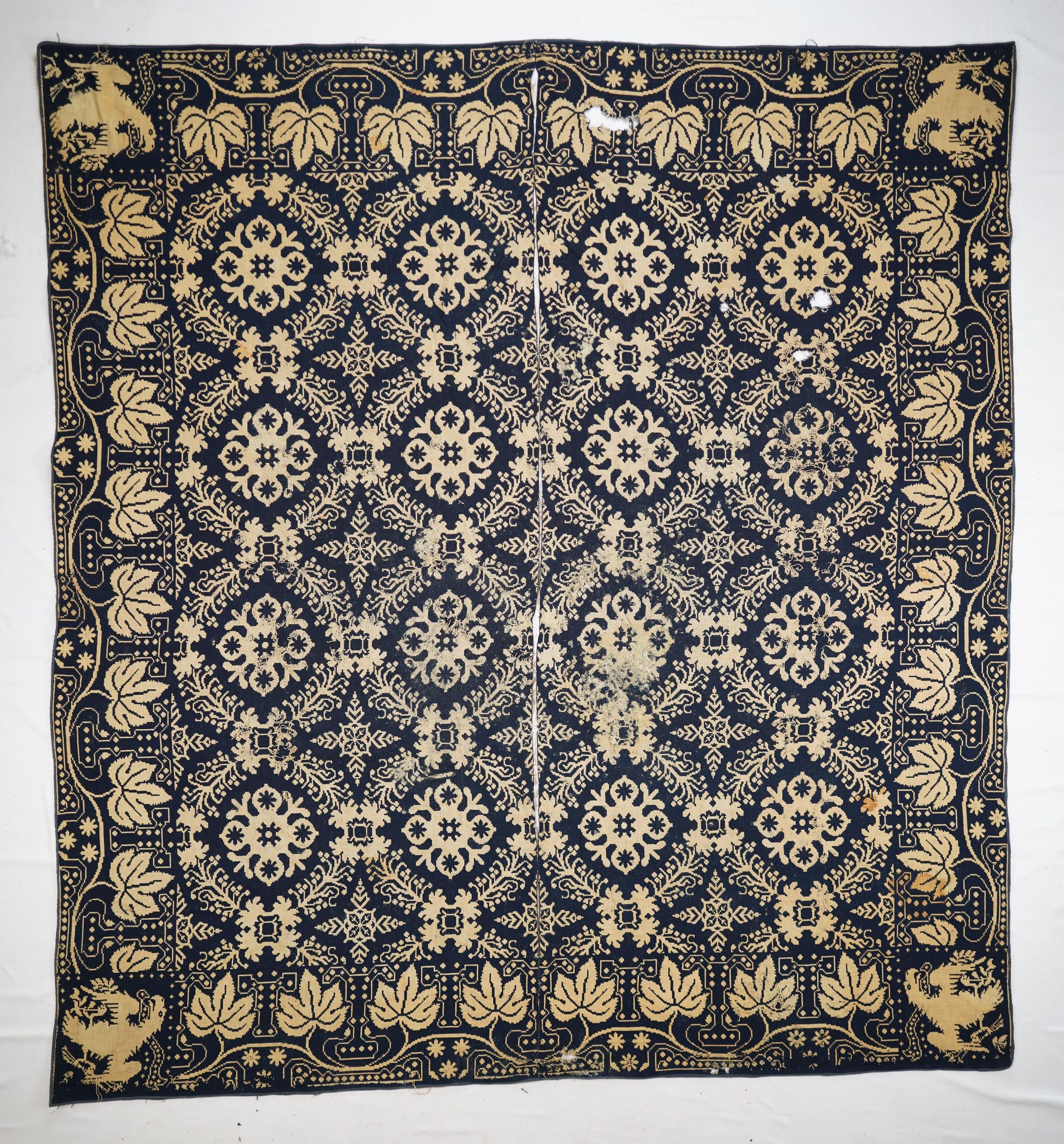 Natural and navy figured Double weave coverlet; two panels joined by a center seam. Border on four sides; no fringe; four cornerblocks with scruffy eagle. Holes along center seam and right side.Collection