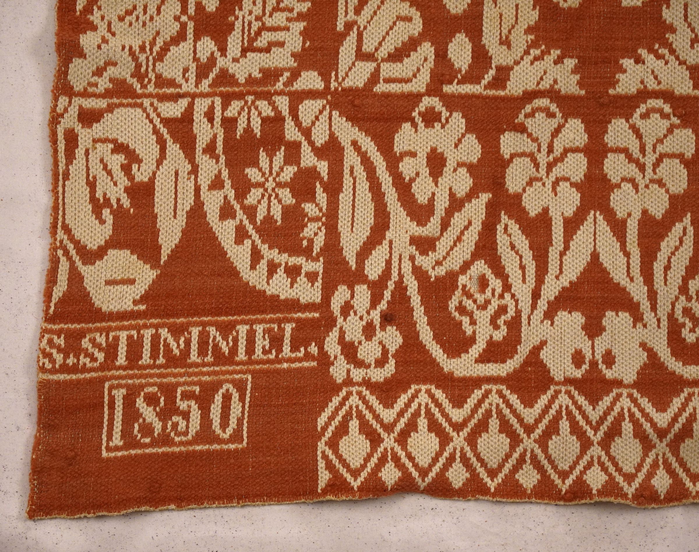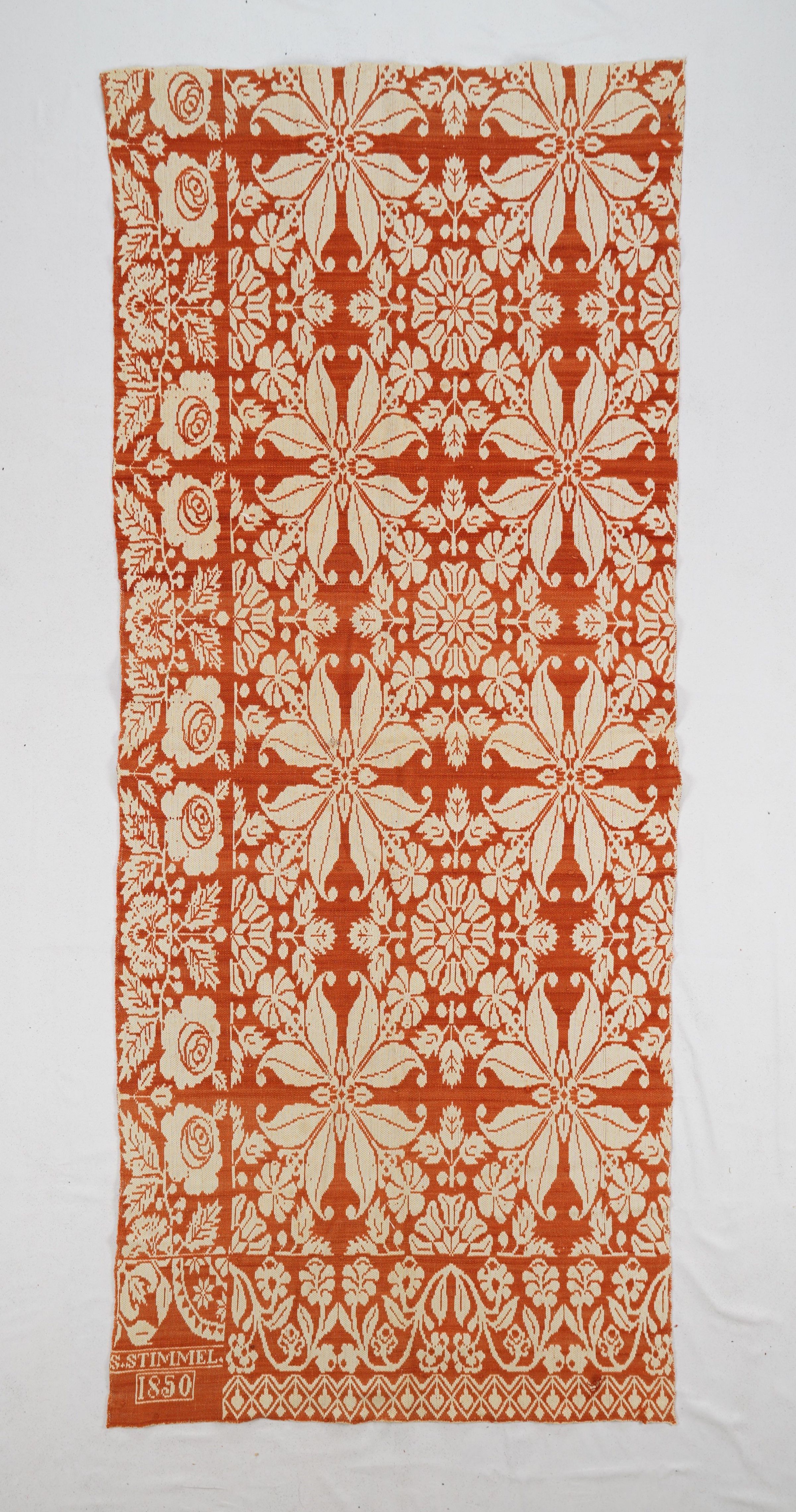 Red and natural figured Tied Beiderwand 2:1 coverlet; one panel. Border on left and bottom; no fringe.Collection