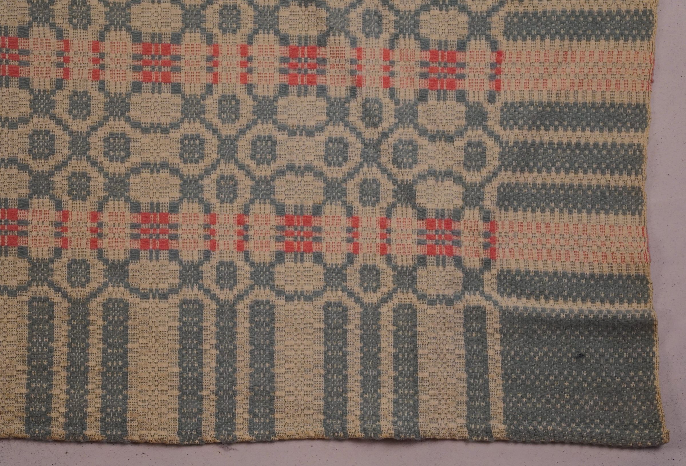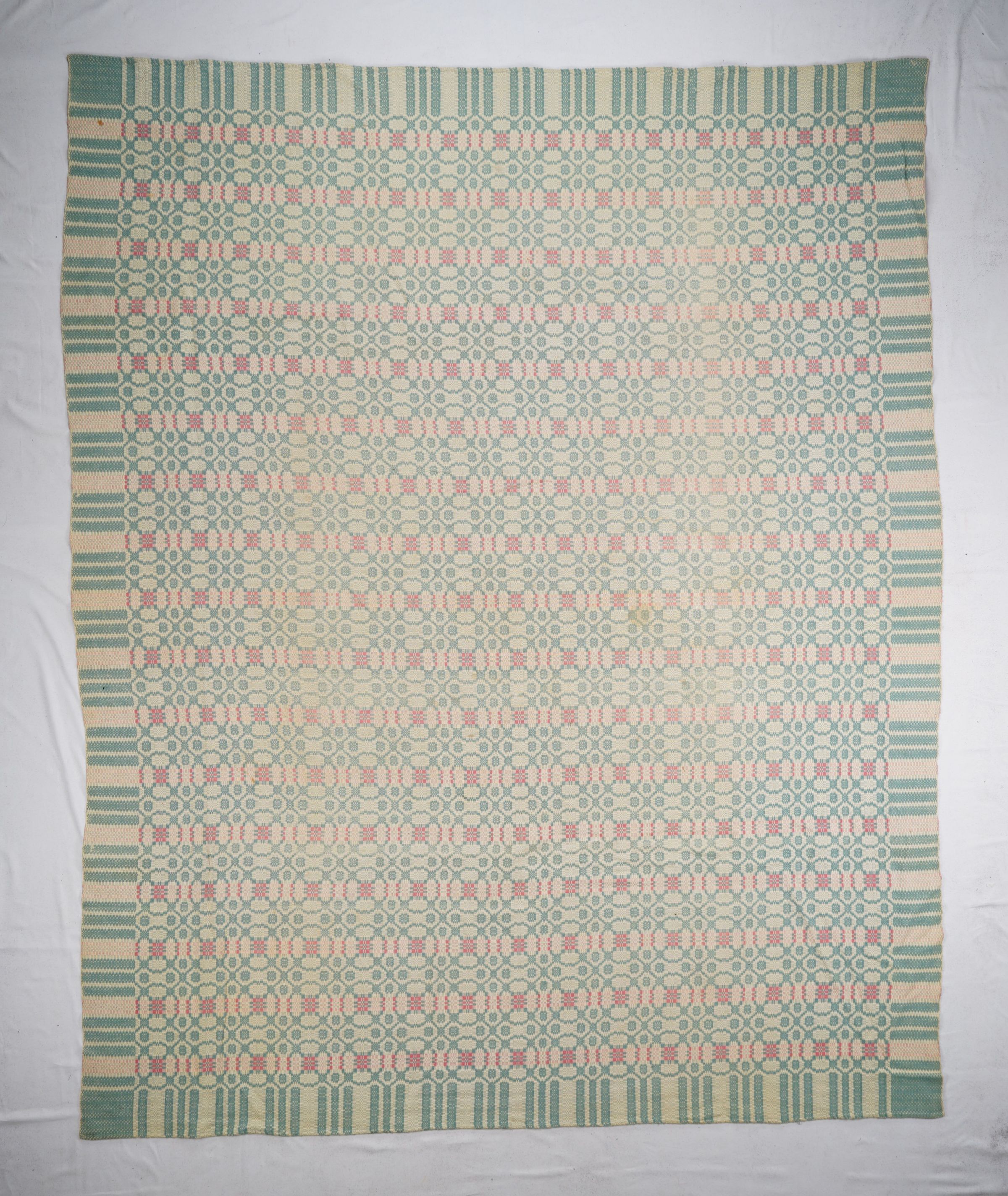 Reproduction pink, green, and natural geometric overshot coverlet; seamless. No fringe; border on four sides.