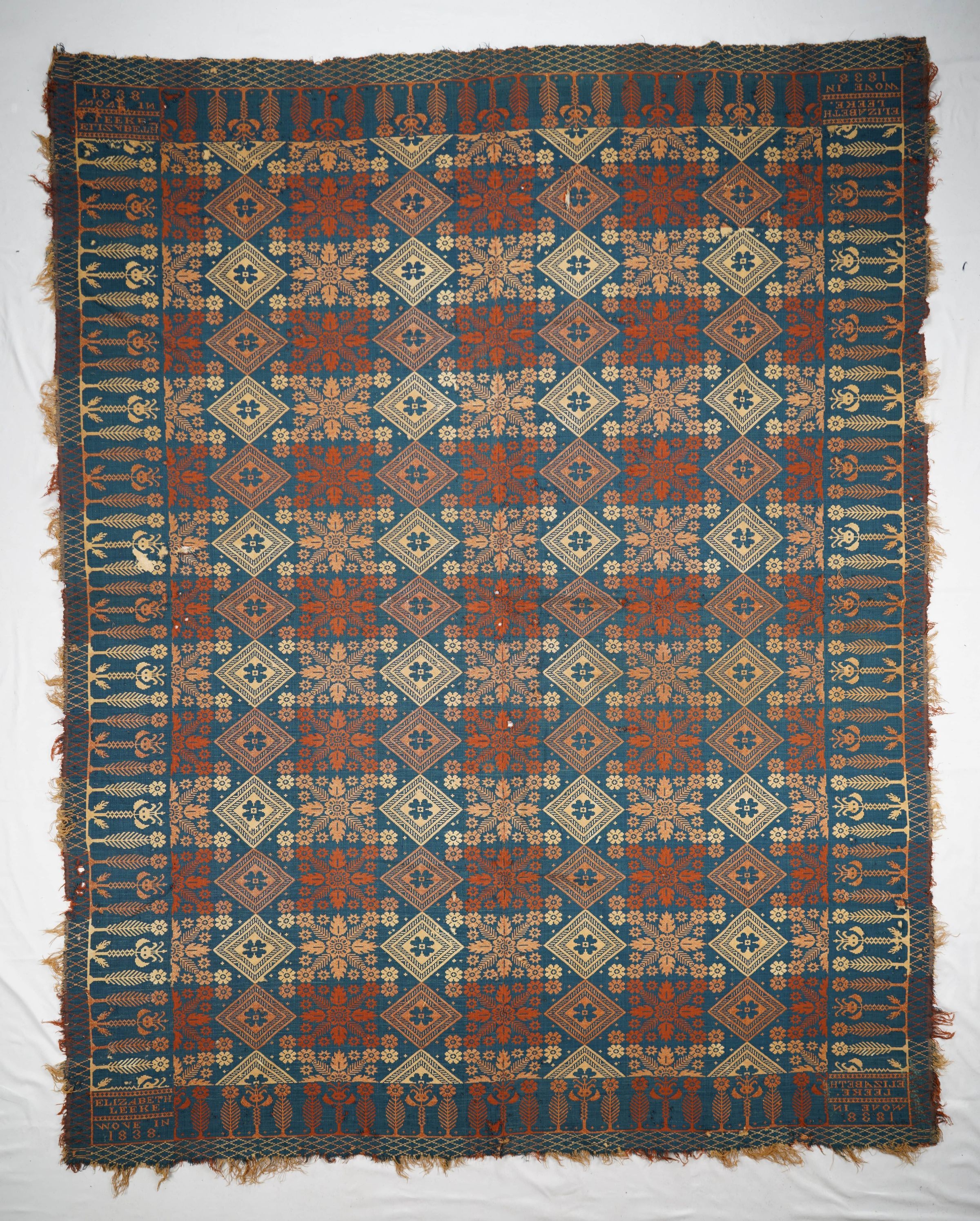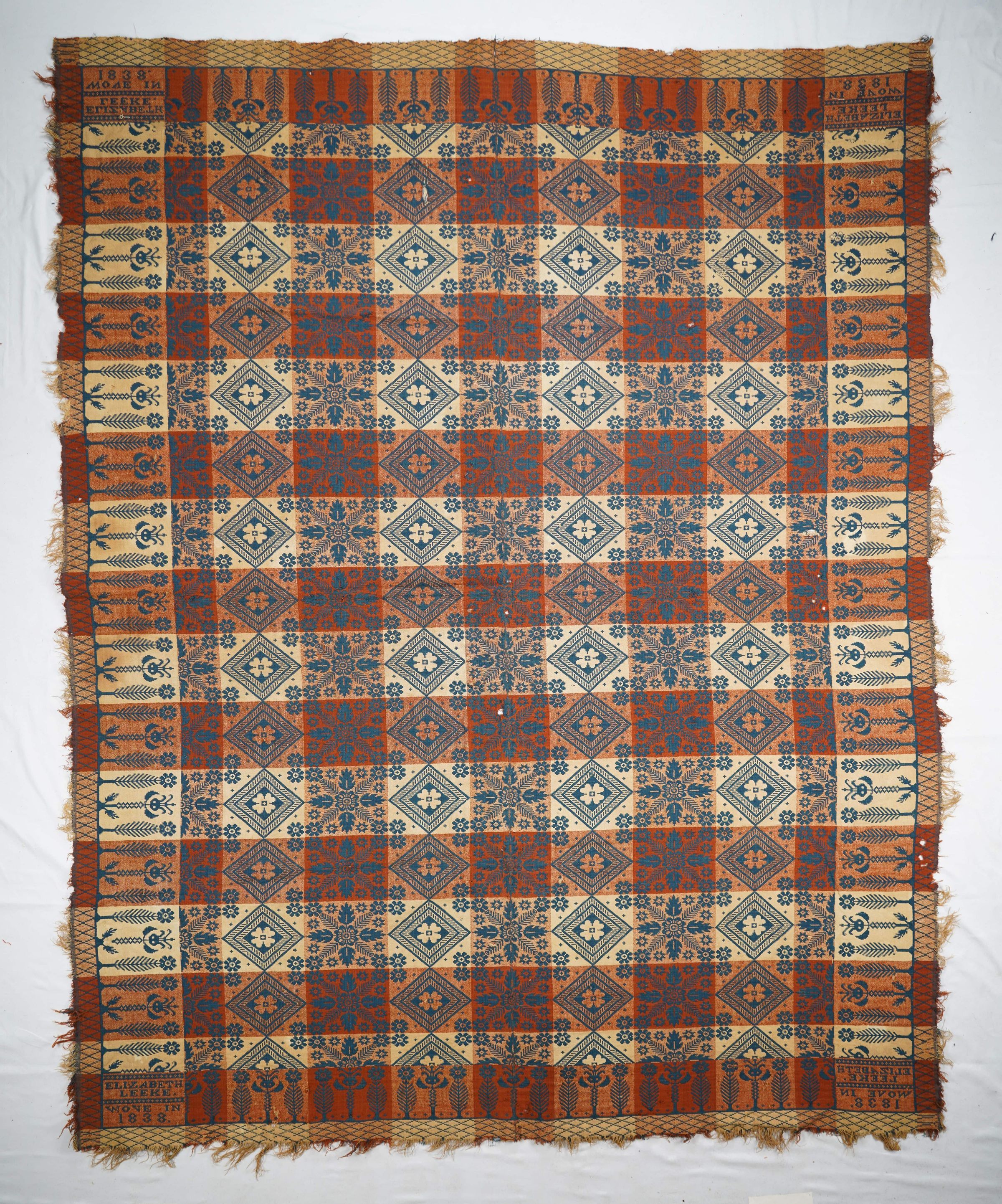 Natural, Navy, and Red figured Double Weave coverlet; Seamless. Fringe on three sides, border on four sides.Collection