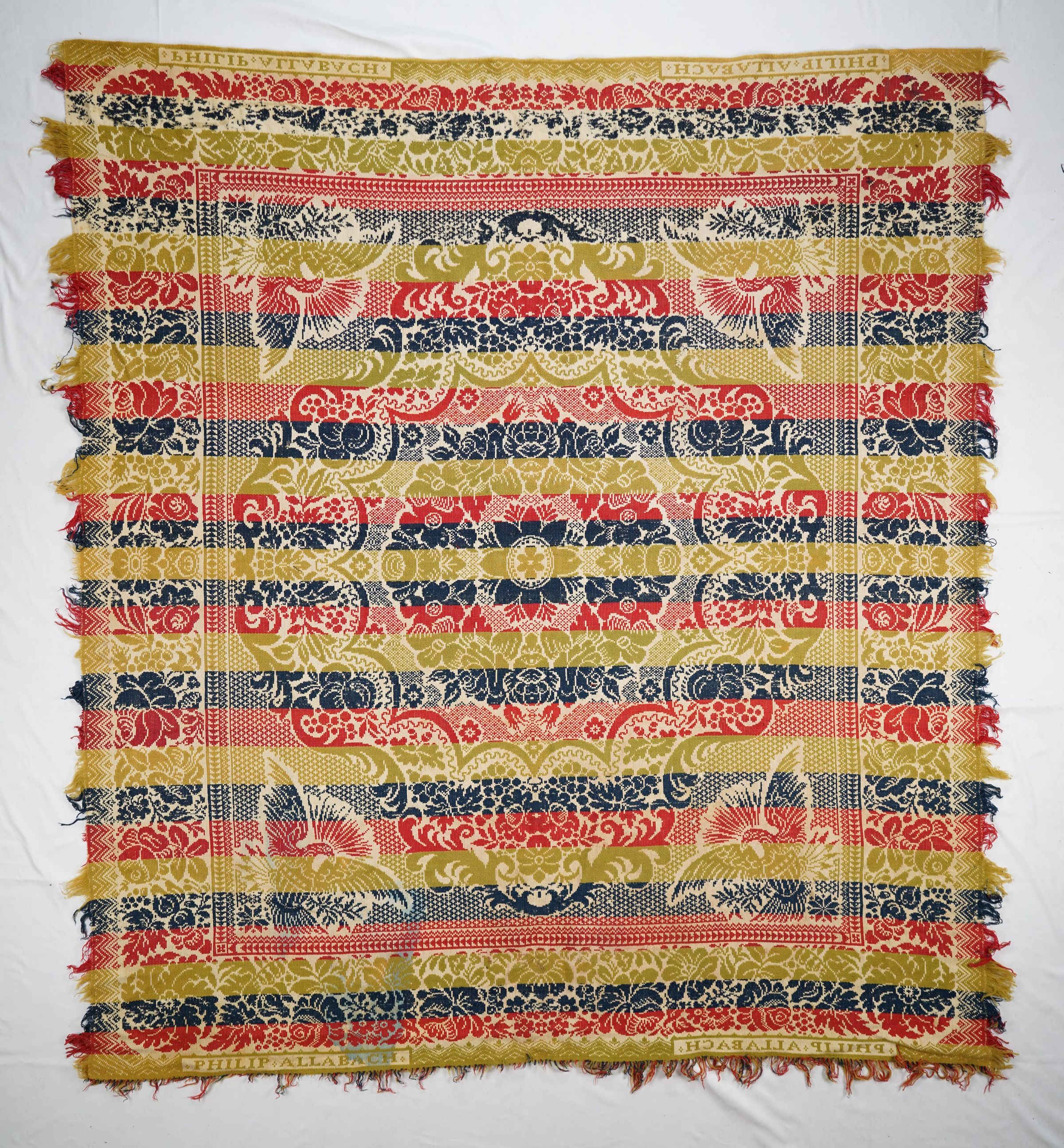 Natural, green, red, and navy figured Tied Beiderwand 4:1 coverlet; seamless. Fringe on three sides, border on four sides.Collection