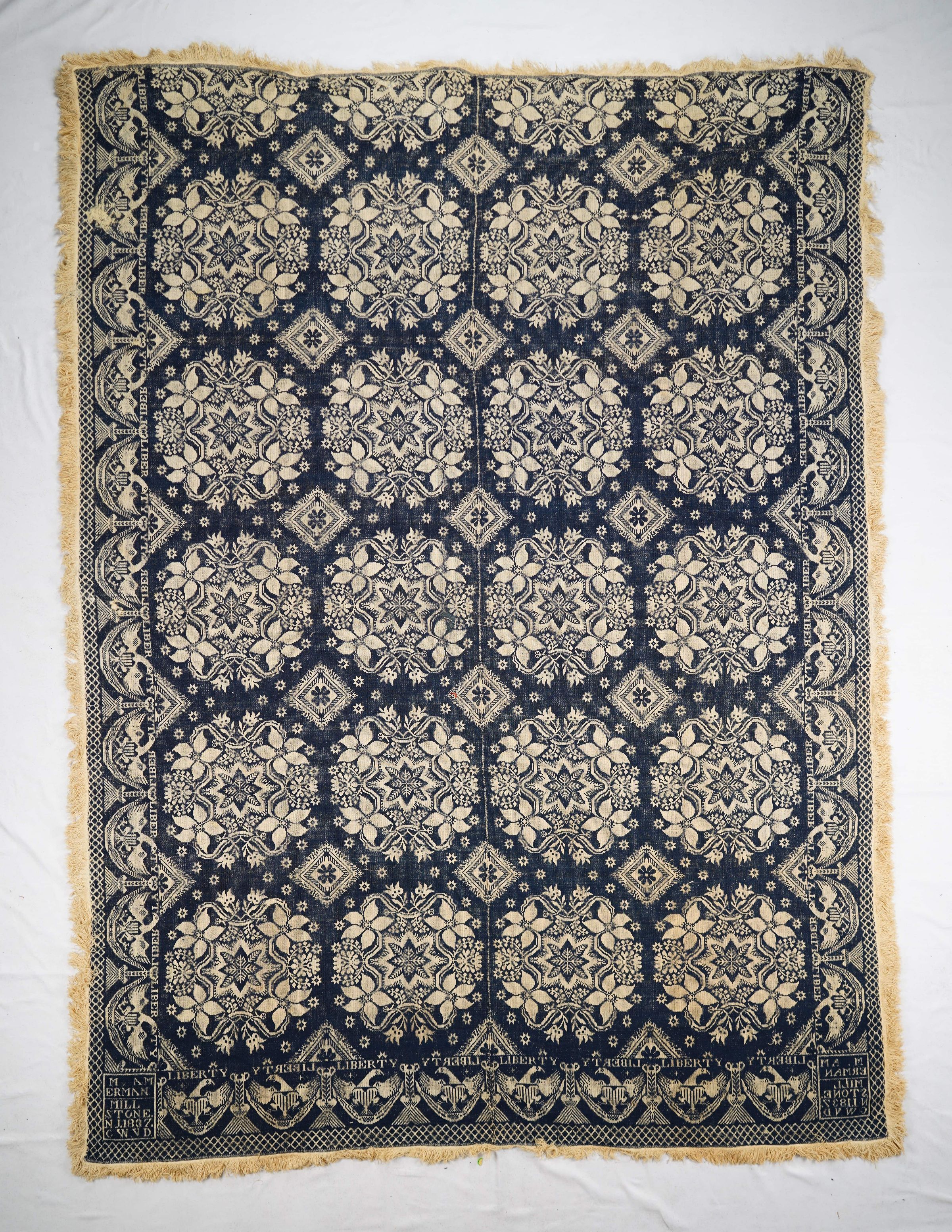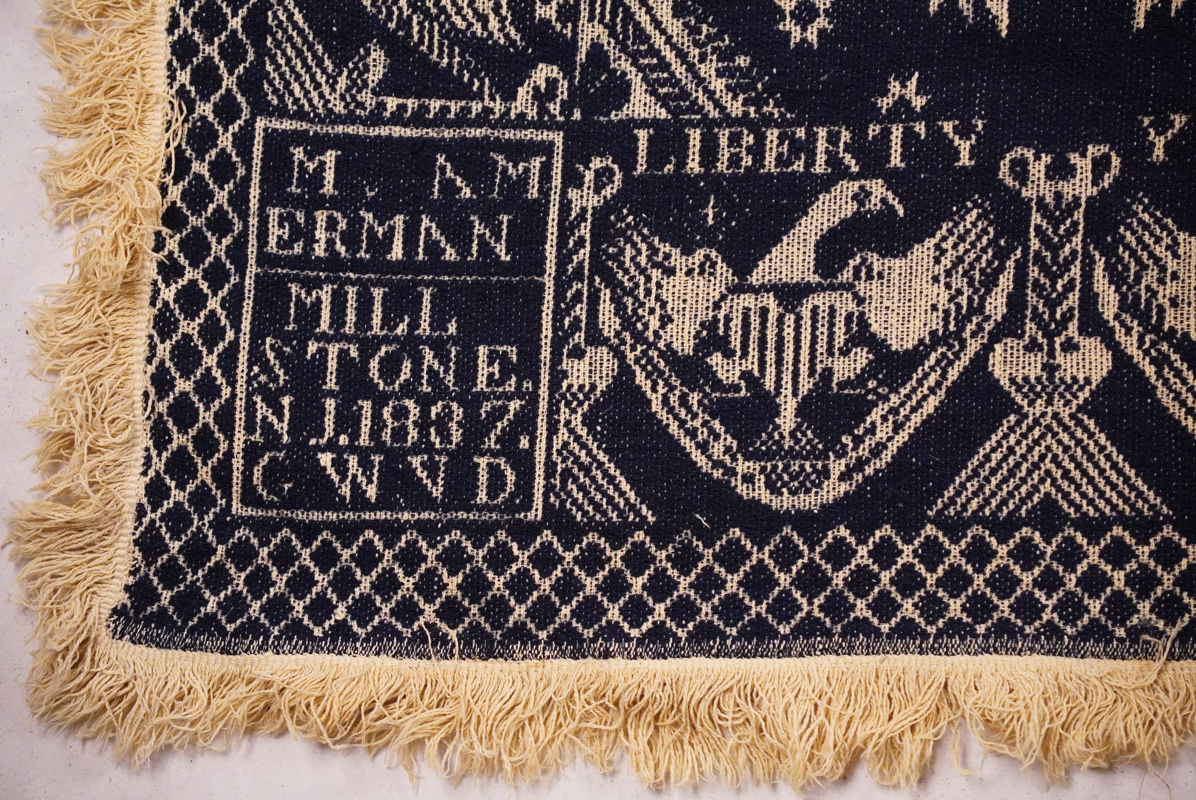 Natural and navy figured tied beiderwand 2:1 coverlet; two panels joined by a center seam. Fringe on four sides; border on three sides.
